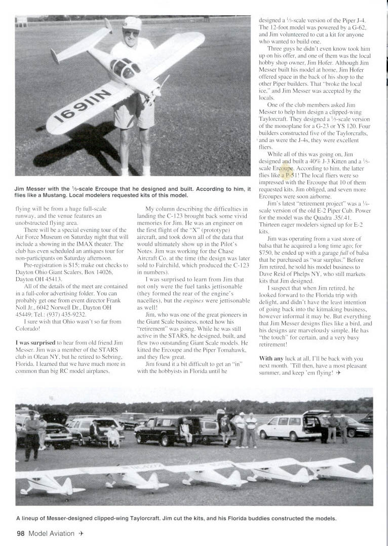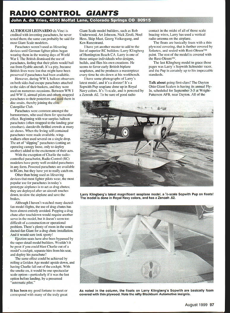 RADIO CONTROL GIANTS ALTHOUGH LEONARDO da Vinci credited inventing parachutes never tested same can probably said Giant Scale modelers Parachutes werent used lifesaving devices until German fighter pilots began wearing waning days World War British dismissed use parachutes feeling pilots would bail out flyable aircraft Its pity because British lives lost might have preserved parachutes available However during WW balloon observers both sides escape parachutes attached sides baskets used numerous occasions Between WW WW II airmail pilots others strapped parachutes posteriors ued dire straits thereby joining elite Caterpillar Club Parachutes common amongst barnstormers used spectacular effect Beginning war-surplus balloon parachutes often strapped landing gear crossbars daredevils thrilled crowds air shows Irving self-contained parachutes made available wingwalkers often used several single drop art slipping parachutes cutting operating canopy loose deploy another added excitement acts exception Charlie radiocontrolled parachutist Radio Control RC modelers have pretty well avoided parachutes form Powered parachutes available RCers have yet really catch Other being used lifesaving devices fighter pilots wear popular use parachutes todays prototype airplanes act drag chutes deployed after aircraft touches down slow airplane save brakes Although havent watched ducted fan model flights use drag chutes has almost entirely avoided Popping drag chute after touchdown would require another servo model doesnt seem too difficult construction operational problem Theres plenty room usual ducted-fan Giant drag chute installation would sure look sporty Ejection seats have also bypassed super-detail model builders Wouldnt great could blast Charlie nut models cockpit separate him seat deploy parachute same effect could achieved rolling Golden Age model upside down having Charlie fall out cockpit smoke would spectacular scale optionparticularly last option before landing presumed automatic pilot Giant Scale model builders such Bob Underwood Art Johnson Nick Ziroli Noel Hess Skip Mast Georg Volkesgang Ken Runestrand have yet another master add list superior RC builders Larry Klingberg Huntington Beach CA Larry unique individuals designs builds flies own creations seems favor early British biplane seaplanes produces masterpiece time sits down workbench have some photographs Larrys latest model its doozer Its Sopwith Pup seaplane done up Royal Navy colors Its 1A-scale powered Zenoah 62 sure good radio contact midst of scale bracing wires Larry has used vertical radio antenna airplane floats basically foam thin plywood covering further covered Solartex sealed RustOleumTM paint rest model covered RustOleumfM last Klingberg model grace pages Larrys Sopwith Schneider racer Pup certainly up impeccable standards Talk about going first-class Dayton Ohio Giant Scalers having its annual Fly scheduled September 3-5 WrightPatterson AFB near Dayton has good fortune meet correspond truly great August1999 97 Larry Klingbergs latest magnificent seaplane model /3-scale Sopwith Pup floats model done Royal Navy colors has Zenoah 62 As noted column floats Larry Klingbergs Sopwith basically foam covered thin plywood Note nifty Blackburn Automotive insignia flying will huge full-scale runway venue features unobstructed flying area will special evening tour Air Force Museum Saturday night will include showing IMAX theater club has scheduled antiques tour non-participants Saturday afternoon Pre-registration $15 make out checks Dayton Ohio Giant Scalers Box 14026 Dayton OH 45413 details meet contained full-color advertising folder can probably get event director Frank Noll Jr 6042 Norwell Dr Dayton OH 45449 Tel 937 435-9232 sure wish Ohio wasnt far Colorado surprised hear old friend Jim Messer Jim member STARS club Olean NY retired Sebring Florida learned have much common big RC model airplanes column describing difficulties landing C-123 brought back some vivid memories Jim engineer first flight X prototype aircraft took down data would ultimately show up Pilots Notes Jim working Chase Aircraft Co time design later sold Fairchild produced C-123 numbers surprised learn Jim fuel tanks jettisonable formed rear engines nacelles engines jettisonable well Jim great pioneers Giant Scale business noted retirement going still active STARS designed built flew two outstanding Giant Scale models kitted Ercoupe Piper Tomahawk flew great Jim found bit difficult get hobbyists Florida until designed V-scale version Piper J-4 12-foot model powered G-62 Jim volunteered cut kit anyone wanted build Three guys didnt know took him up offer local hobby shop owner Jim Hofer Although Jim Messer built model home Jim Hofer offered space back shop other Piper builders broke local ice Jim Messer accepted locals club members asked Jim Messer help him design clipped-wing Taylorcraft designed 1/5-scale version monoplane G-23 YS 120 Four builders constructed five Taylorcrafts J-4s excellent fliers going Jim designed built 40% J-3 Kitten scale Ercoupe According him latter flies like P-SI local fliers impressed Ercoupe 10 requested kits Jim obliged seven Ercoupes soon airborne Jims latest retirement project scale version old E-2 Piper Cub Power model Quadra 35141 Thirteen eager modelers signed up E-2 kits Jim operating vast store balsa acquired long time ago $750 ended up garage 114/ balsa purchased war surplus Before Jim retired sold model business Dave Reid Phelps NY still markets kits Jim designed suspect Jim retired looked forward Florida trip delight didnt have least intention going back kitmaking business however informal may everything Jim Messer designs flies like bird designs marvelously simple has touch certain very busy retirement luck Ill back next month Till have pleasant summer keep em flying odel Aviation Messer 1/5-scale Ercoupe designed built According him lies like Mustang Local modelers requested kits model lineup Messer-designed clipped-wing Taylo
