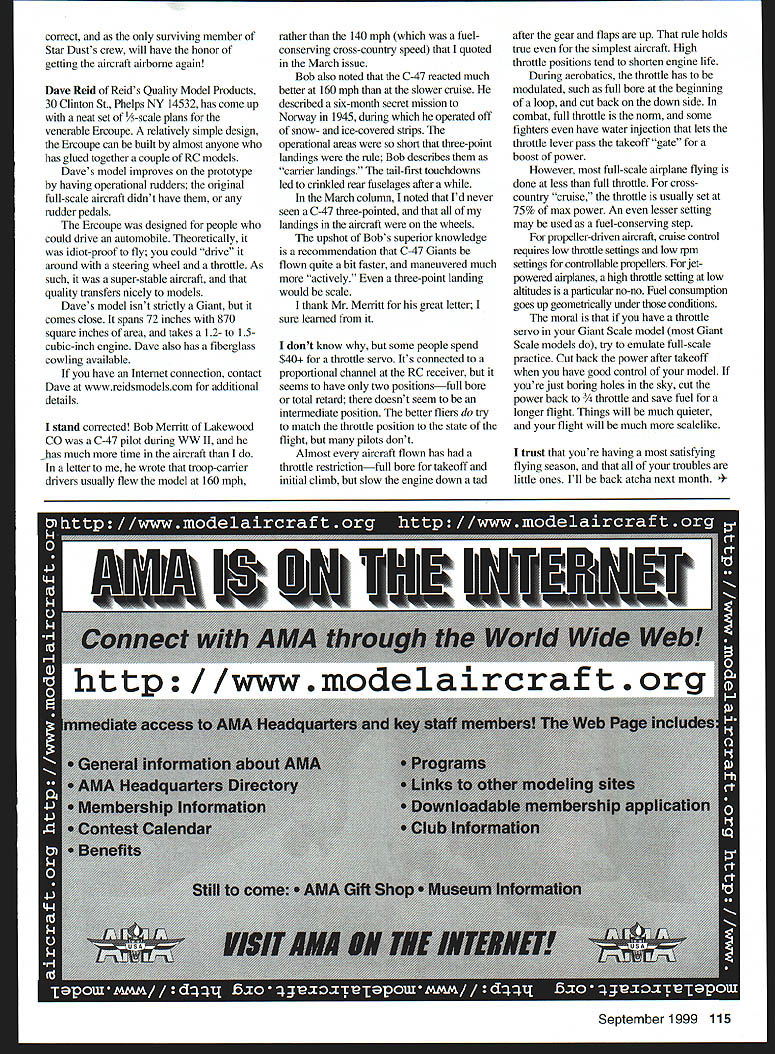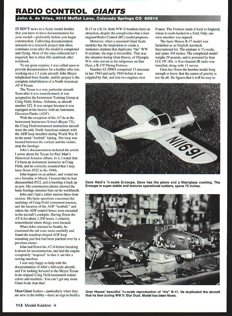 RADIO CONTROL GIANTS U IT ISNT news Scale model builder have have documentation modelpreferably before begin construction Collecting documentation amounts research project often continues after model completed flying Most data collected isnt required often fills notebook after notebook great surprise called upon provide documentation builder working 11 scale aircraft John Meyer telephoned Seattle project complete rehabilitation North American AT-6 Texan Texan very particular aircraft Soon after manufactured assigned Instrument Training Group Craig Field Selma Alabama aircraft number 522 unique because equipped factory Automatic Direction Finder ADF exception AT-6s Instrument Instructors School Bryan TX Craig Field instrument instruction aircraft North American trainers ADF loop installed during World War II usual football fairing loop located between cockpit rudder atop fuselage Johns documentation included article wrote about Texan Paul Matt s Historical Aviation Album noted Id instrument instructor Craig Field correctly assumed may have flown #522 1940s John hopped airliner visited Saturday March learned disassembled #522 building back up new construction photos showed basic fuselage structure bare workbench John rather intense three-hour session basic questions concerned markings Craig Field instrument trainers location ADF footbail ADF control boxes mounted aircrafts cockpits Having flown AT-6 about 1200 hours certainly remembered things located John returned Seattle examined tail cone carefully found teardrop-shaped ADF loop mounting pad patched over previous owner John flown AT-6 before breaking down reconstruction engine completely majored ran like sewing machine very happy help documentation Johns full-scale aircraft Im looking forward Meyer Texan its original Craig Field instrument trainer colors numbers cant get Giant Scale B-17 B-24 Both WW II bombers have attraction despite complexities fourengined Radio Control RC model proposes However seasoned Giant Scale modeler has inspiration create miniature airplane duplicates WW II airplane urge irresistible situation facing Gren Hawes Olympia WA served tailgunner Star Dust B-17F Hying Fortress Number 42-39901 completed 13 missions late 1943 early 1944 before crippled flak lost two engines over France Fortress made back England crash-landed field Only crew member injured basic Hawes B- 17 model furnished English Aerotech International kit airplane 112-scale spans 104 inches completed model weighs 29 pounds powered four OS FP 40s five-channel JR radio installed along 11 servos Gren has flown bomber model long enough know center gravity too far aft figures will easy Most Giant Scalersparticularly new hobbyhave urge build 114 Model Aviation Reids /5-scale Ercoupe Dave has plans fiberglass cowling Ercoupe super-stable features operational rudders spans 72 inches Gren Hawes beautiful 112-scale reproduction B-17 duplicated aircraft flew during WW II Star Dust Model has flown correct surviving member Star Dusts crew will have honor getting aircraft airborne again Dave Reid Reids Quality Model Products 30 Clinton St Phelps NY 14532 has come up neat set 1A-scale plans venerable Ercoupe relatively simple design Ercoupe can built almost anyone has glued together couple RC models Daves model improves prototype having operational rudders original full-scale aircraft didnt have rudder pedals Ercoupe designed people could drive automobile Theoretically idiot-proof fly could drive around steering wheel throttle As such super-stable aircraft quality transfers nicely models Daves model isnt strictly Giant comes close spans 72 inches 870 square inches area takes 12- 15cubic-inch engine Dave also has fiberglass cowling available have Internet connection contact Dave wwwreidsmodelscom additional details stand corrected Bob Merritt Lakewood CO C-47 pilot during WW II has much time aircraft letter wrote troop-carrier drivers usually flew model 160 mph rather 140 mph fuelconserving cross-country speed quoted March issue Bob also noted C-47 reacted much better 160 mph slower cruise described six-month secret mission Norway 1945 during operated off snow- ice-covered strips operational areas short three-point landings rule Bob describes carrier landings tail-first touchdowns led crinkled rear fuselages after March column noted Id never seen C-47 three-pointed landings aircraft wheels upshot Bobs superior knowledge recommendation C-47 Giants flown quite bit faster maneuvered much actively three-point landing would scale thank Mr Merritt great letter sure learned dont know some people spend $40 throttle servo Its connected proportional channel RC receiver seems have two positionsfull bore total retard doesnt seem intermediate position better fliers try match throttle position state flight pilots dont Almost aircraft flown has throttle restrictionfull bore takeoff initial climb slow engine down tad after gear flaps up rule holds true simplest aircraft High throttle positions tend shorten engine life During aerobatics throttle has modulated such full bore beginning loop cut back down side combat full throttle norm some fighters have water injection lets throttle lever pass takeoff gate boost power However full-scale airplane flying done less full throttle crosscountry cruise throttle usually set 75% max power An lesser setting may used fuel-conserving step propeller-driven aircraft cruise control requires low throttle settings low rpm settings controllable propellers jetpowered airplanes high thruttle setting low altitudes particular no-no Fuel consumption goes up geometrically under conditions moral have throttle servo Giant Scale model Giant Scale models try emulate full-scale practice Cut back power after takeoff have good control model youre just boring holes sky cut power back ttle save fuel longer flight Things will much quieter flight will much scalelike trust youre having satisfying flying season troubles little ones.I 11 back atcha next month ember 1999 1