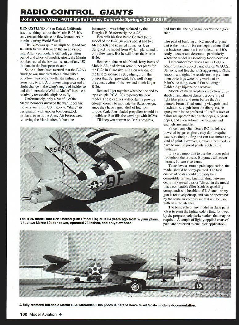 RADIO CONTROL GIANTS Fiai sW[-U ' i1E -i r-l1 r1 r ruz yL 11 LU N OSTLIND San Rafael California has thing about Martin B-26 Its reasonable since flew Marauders combat during World War II B-26 quite airplane two R-2800s pull through air rapid rate After particularly difficult gestation period host modifications Martin bomber scored lowest loss rate US airplane European theater Some authors have averred B-26s fuselage modeled after 50-caliber bulletit smooth streamlined shape nose tail bit wing area slight change wings angle incidence heretofore Widow Maker became relatively reasonable airplane fly Unfortunately handful Martin bombers survived war became aircraft US history share its designation another bomber/attack airplane Army Air Forces removing Martin aircraft inventory being replaced Douglas B-26 formerly A-26 Ben built first Radio Control RC model B-26 34 years ago two Merco 60s spanned 73 inches Ben designed model Wylam plans flew once still loves Martin B-26 Ben heard old friend Jerry Bates Mobile AL drawn some super plans B-26 Giant size Ben first acquire set Judging photos Ben provided hes well along construction new much-larger B-26 Ben got together decided try couple RCV 20s power new model engines will certainly provide enough oomph motivate Bates design since have great deal low-rpm torque Scale four-bladed propellers should possible Ben fills cowlings RCVs Ill keep current Bens progress trust big Marauder will great flier part building RC model airplane fun begins basic construction completed its ready cover decorateparticularly model essentially fabric-covered remember kid beautiful hand-rubbed paint jobs WACOs Stinsons Beecheraft Staggerwings Slick smooth tight results premium linen coverings truly works art Paints thing Im building Golden Age biplane warbird Models metal airplanes often fullysheeted almost demand covering light fiberglass resin before theyre painted final-sanding viewpoint maximum strength fiberglass epoxy resin preferred filler host paints appropriate nitrate dopes buytrate dopes automotive lacquers enamels suitable Since Giant Scale RC models powered gas engines dont require extensive fuclproofing can use almost kind paint However glow-engined models have use fuelproof paints such buytrates very important use proper paint throughout process Butyrates will cover nitrates vice versa achieve smooth paint application model should spray-painted first couple coats should probably compatible primer Light sanding between coats may reveal dips dings model compatible filler such spackling compound will able fill small spray gun relatively cheap can powered same air compressor will used airbrush later basic rule model airplane paint job paint lighter colors first followed progressively darker colors may required couple lightly-applied coats paint preferred thick application 100 Model Aviation model Ben Ostlind San Rafael CA built 34 years ago Wylam plans two Merco 60s power spanned 73 inches flew once fully-restored full-scale Martin B-26 Marauder photo part Bens Giant Scale models documentation less chance paint run surface will remain smooth fabric-covered models its good idea start light coat fabric starch will fill fabrics pores prevent paint runs inside covering Camouflage paint jobs may require model extensively masked second subsequent paint colors applied check documentation will reveal camouflage patches masked prototype aircraft applied spraying device latter will leave indistinct line between colors can achieved full-scale airplane An airbrush wide nozzle will give proper effect Masking large areas model can cost fortune masking tape theres easier way accomplish same thing using ordinary newspaper cut desired pattern applied wet primed model Spray over masked line toward wet newspaper mask will work particularly well Overspray will kept minimum fully-painted model almost cries painted-on insignia other smallish decorations Painting lighter colors first simple light-card masks cut proper shape will job file folders good source preparation smaller stencils Taped down firmly insignia numbers may airbrushed onto model small amount overspray occurs may removed application automotive rubbing compound applied soft rag affecting appearance painted-on decorations Dont forget paint applications warbirds field often sloppy paint jobs done harried mechanics Pristine paint applications exception rule distorted insignia can copied documentation photographs some great purveyors thin vinyl model decorations will make final paint job look factory fresh Theres prototype precedent application stick-on insignia US Air Force aircraft Early jet conventional aircraft received massive sticky-backed decals applied factory field cut down time application painted-on insignia required Often decals printed pieces aligned stuck airplane used until low-visibility gray paint jobs instituted USAF combat aircraft fun jobs paint camouflage patterns found German Italian fighters served North African desert can spend aimost full day squirting blobs green brown gray model using airbrush Japanese fighters also fun decorate frequently featured squiggly lines over upper surfaces airbrush can duplicateparticularly using finer nozzles However theres old saw about paint jobs adding weight good-looking Scale models Although will take heap paint achieve professional-looking airplane added weight easily handled average Giant Scale model regular-size Scale model too much paint will required finish off lightly-fiberglassed model new iron-on fabric coverings used much paint will soaked up airframe least-complicated model paint job cant accomplished day Its good practice allow color shade dry thoroughly week isnt too long before proceeding subsequent ones particularly have use masking tape latter paint colors use low tack tapethe kind recommended drafting purposes its less likely pull up already-applied paint remove tape soon after paint youve applied over has set isnt thoroughly dry mentioned use aut