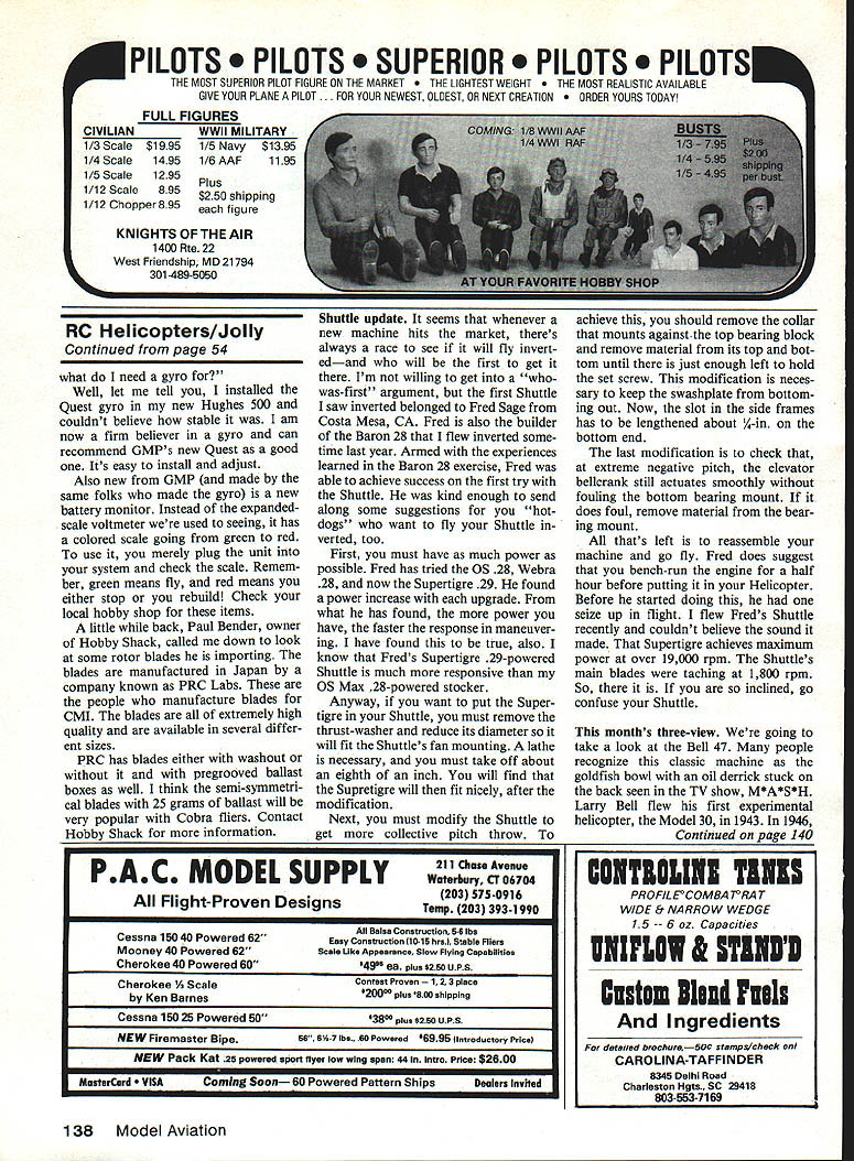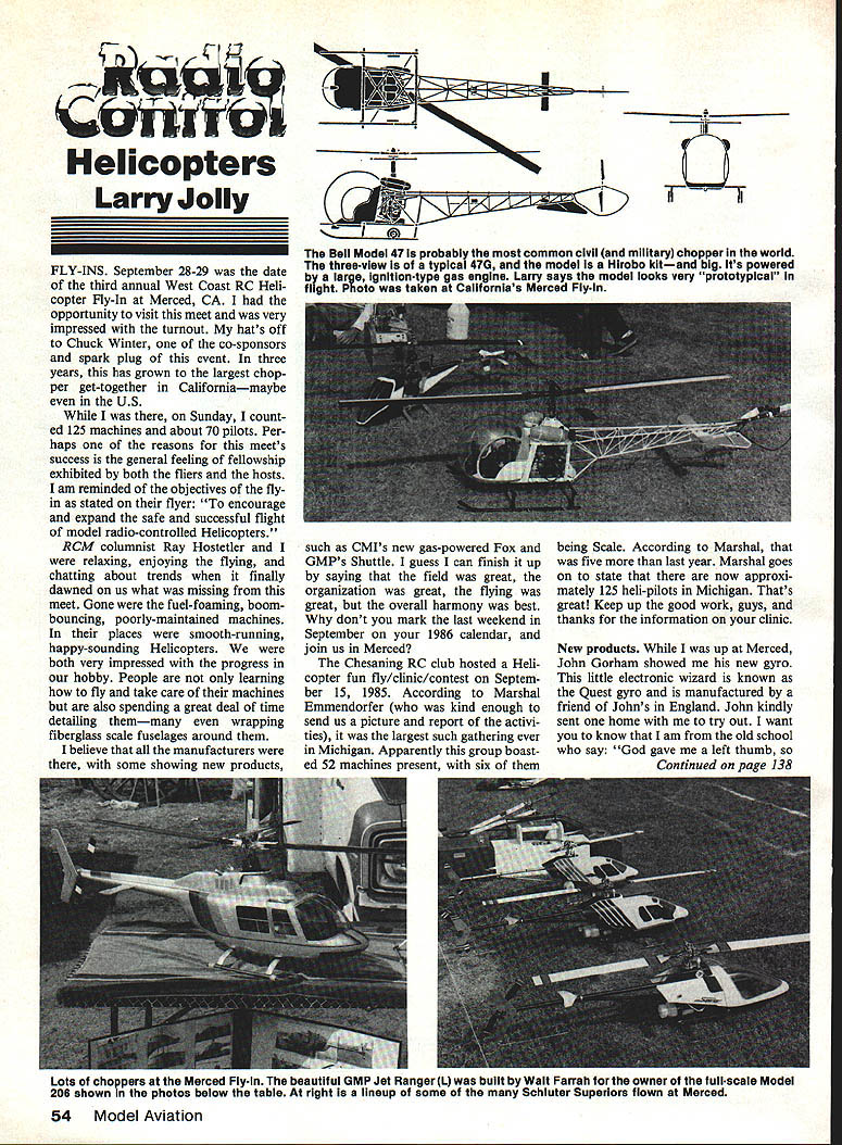 Helicopters Larry Jolly FLY-INS September 28-29 date third annual West Coast RC Heli copter Fly-In Merced CA opportunity visit meet very impressed turnout hats off Chuck Winter co-sponsors spark plug event three years has grown largest chop per get-together Californiamaybe US Sunday count ed 125 machines about 70 pilots Per haps reasons meets success general feeling fellowship exhibited both fliers hosts am reminded objectives flyin stated flyer encourage expand safe successful flight model radio-controlled Helicopters RCM columnist Ray Hostetler relaxing enjoying flying chatting about trends finally dawned us what missing meet Gone fuel-foaming boombouncing poorly-maintained machines places smooth-running happy-sounding Helicopters both very impressed progress hobby People learning fly take care machines also spending great deal time detailing themmany wrapping fiberglass scale fuselages around believe manufacturers some showing new products V- Bell Model 47 probably common civil military chopper world three-view typical 47G model ilirobo kitand big Its powered large ignltlontype gas engine Larry says model looks very prototypical flight Photo taken Californias Merced Flyin being Scale According Marshal five last year Marshal goes state now approxi mately 125 heli-pilots Michigan Thats great Keep up good work guys thanks information clinic New products up Merced John Gorham showed new gyro little electronic wizard known Quest gyro manufactured friend Johns England John kindly sent home try out want know am old school say God gave left thumb Condnued nate 138 such CMIs new gas-powered Fox GMPs Shuttle guess can finish up saying field great organization great flying great overall harmony best dont mark last weekend September 1986 calendar join us Merced Chesaning RC club hosted Heli copter fun fly/clinic/contest Septem ber 15 1985 According Marshal Emmendorfer kind enough send us picture report activi ties largest such gathering ever Michigan Apparently group boast ed 52 machines present six Lots choppers Merced Flyln beautiful GMP Jet Ranger 1 built Walt Farrah owner full-scale Model 206 shown photos below table right lineup some Schiuter Superiors flown Merced 54 Model Aviation L U LOTS TS RIOR TS TS THE MOST SUPERIOR PILOT FIGURE ON THE MARKET LIGHTEST WEIGHT MOST REALISTIC AVAILABLE GIVE YOUR PLANE PILOT FOR YOUR NEWEST OLDEST OR NEXT CREATION R YOURS TODAY FULL FIGURES CIVILIANWWII MILITARY 1/3 Scale $19951/5 Navy $1395 1/4ScaIe14951/6AAF1195 1/5 Scale1295 Plus 1/12 Scale895$250 shipping 1/12 Chopper 895each figure KNIGHTS OF THE AIR 1400 Rte 22 West Friendship MD 21794 301-489-5050 RC Helicopters/Jolly Continued page 54 what need gyro Well let tell installed Quest gyro new Hughes 500 couldnt believe stable am now firm believer gyro can recommend GMPs new Quest good Its easy install adjust Also new GMP made same folks made gyro new battery monitor Instead expandedscale voltmeter used seeing has colored scale going green red use merely plug unit system check scale Remem ber green means fly red means either stop rebuild Check local hobby shop items little back Paul Bender owner Hobby Shack called down look some rotor blades importing blades manufactured Japan company known PRC Labs people manufacture blades CMI blades extremely high quality available several differ ent sizes PRC has blades either washout pregrooved ballast boxes well think semi-symmetri cal blades 25 grams ballast will very popular Cobra fliers Contact Hobby Shack information Shuttle update seems whenever new machine hits market theres always race see will fly invert edand will first get Im willing get was-first argument first Shuttle saw inverted belonged Fred Sage Costa Mesa CA Fred also builder Baron 28 flew inverted some time last year Armed experiences learned Baron 28 exercise Fred able achieve success first try Shuttle kind enough send along some suggestions hot dogs want fly Shuttle verted too First must have much power possible Fred has tried 05 28 Webra 28 now Supertigre 29 found power increase upgrade what has found power have faster response maneuver ing have found true also know Freds Supertigre 29-powered Shuttle much responsive OS Max 28-powered stocker Anyway want put Super tigre Shuttle must remove thrust-washer reduce its diameter will fit Shuttles fan mounting lathe necessary must take off about eighth inch will find Supretigre will fit nicely after modification Next must modify Shuttle get collective pitch throw PAC MODEL SUPPLY 211 Chase Avenue Waterbury CT 06704 203 S7S0916 Flight-Proven DesignsTemp 203 3931990 Balsa Construction 5-Bibs Cessna 15040 Powered 62Easy construction 10-15 hrs Stable Fliers Mooney 40 Powered 62Scale Like Appearance Slow Flying Capabilities Cherokee 40 Powered 60*4995 ea plus $250 UPS Cherokee 1/3 ScaleContest Proven place Ken Barnes lus 800 shipping Cessna 15025 Powered 50 plus $250 UPS NEW Firemaster Bipe56 6A-7 lbs 50 Powered $6995 Introductory Pricel NEW Pack Kat 25 powered sport flyer low wing span 44 intro Price $2600 MasterCard e VISA Coming Soon 60 Powered Pattern Ships Dealers Invited achieve should remove collar mounts againstthe top bearing block remove material its top bot tom until just enough left hold set screw modification neces sary keep swashplate bottom ing out Now slot side frames has lengthened about -in bottom end last modification check extreme negative pitch elevator bellcrank still actuates smoothly fouling bottom bearing mount does foul remove material bear ing mount thats left reassemble machine go fly Fred does suggest bench-run engine half hour before putting Helicopter Before started doing seize up flight flew Freds Shuttle recently couldnt believe sound made Supertigre achieves maximum power over 19000 rpm Shuttles main blades taching 1800 rpm So inclined go confuse Shuttle moaths three-view going take look Bell 47 people recognize classic machine goldfish bowl oil derrick stuck back seen TV show M*A*S*H Larry Bell flew first experimental he