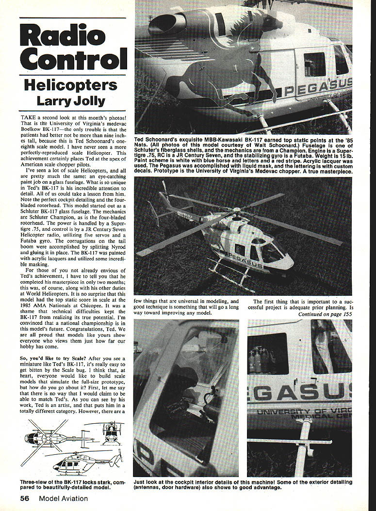 Radio Control Helicopters LarryJolly TAKE second look months photos tile University Virginias medevac Boelkow BK-i 17the trouble patients better nine inch es tall because Ted Schoonards oneeighth scale model have never seen perfectly-reproduced scale Helicopter achievement certainly places Ted apex American scale chopper pilots Ive seen lot scale Helicopters pretty much same eye-catching paint job glass fuselage What unique Teds BK-i 17 incredible attention detail us could take lesson him Note perfect cockpit detailing four bladed rotorhead model started Out Schluter BK-I 17 glass fuselage mechanics Schluter Champion four-bladed rotorhead power handled Super tigre 75 control JR Century Seven Helicopter radio utilizing five servos Futaba gyro corrugations tail boom accomplished splitting Nyrod gluing place BK-i 17 painted acrylic lacquers utilized some incredi ble masking already envious Teds achievement have tell completed masterpiece two months course along other duties World Helicopters no surprise model top static score scale 1985 AMA Nationals Chicopee shame technical difficulties kept BK-i 17 realizing its true potential Im convinced national championship models future Congratulations Ted proud models like yours show everyone views just far hobby has come So youd like try Scale After see miniature like Teds BK-i 17 its really easy get bitten Scale bug think heart everyone would like build scale models simulate full-size prototype go about First let say no way would claim able match Teds As can see work Ted artist puts him totally different category However Threeview BK117 looks stark com pared beautifullydetailed model 56 Model Aviation Ted Schoonards exquisite MBB-Kawasaki BK-117 earned top static points 85 Nats photos model courtesy Walt Schoonard Fuselage Schiuters fiberglass shells mechanics Champion Engine Super tlgre 75 RO JR Century Seven end stabilizing gyro Futaba Weight 15 lb Paint scheme white blue horse letters anda red stripe Acrylic lacquer used Pegasus accomplished liquid mask lettering custom decals Prototype University Virginias Medevac chopper true masterpiece few things universal modeling andThe first thing important suc good technique something will go longcessful project adequate prior planning way toward improving modelContinued naee 155 Just look cockpit Interior details machine Some exterior detailing antennas door hardware also shows good advantage