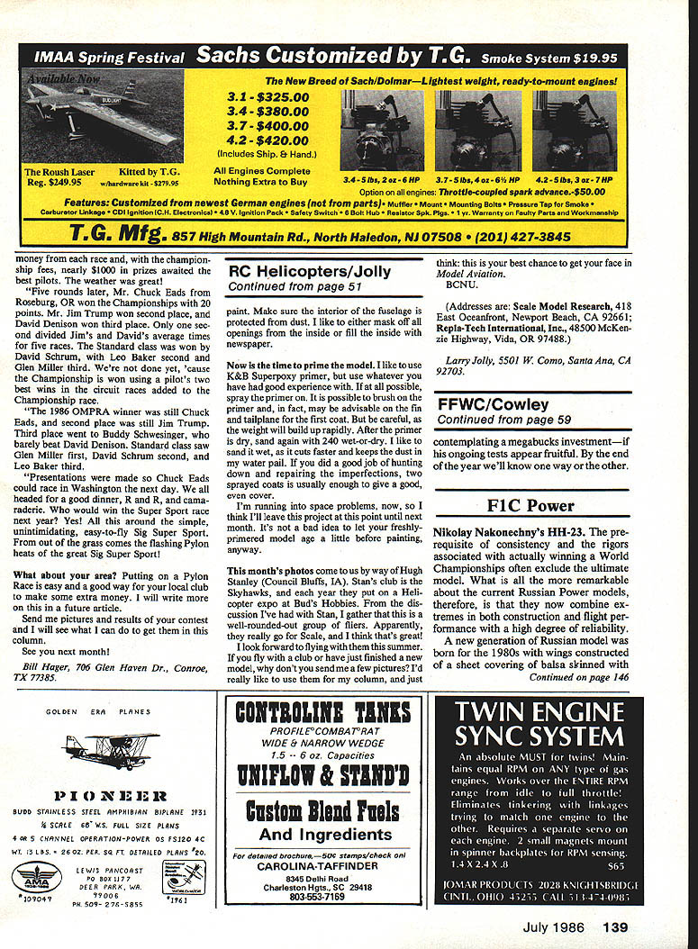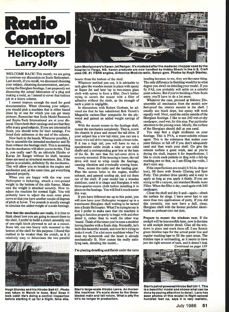 Radio Control Helicopters Larry Jolly WELCOME BACK month going continue discussion Scale Helicopters Last month recall discussed choosing subject obtaining documentation pro curing fiberglass fuselage am purposely discussing actual fabrication plug making mold intend cover tedious job future column cannot impress enough need good documentation choosing subject should pick machine either based close can get pictures Remember Scale Model Research Repla-Tech International dis posal have both catalogs see offer good subjects Ifyou interested Scale should write catalogs Ive listed addresses end column Now back bench Whenever possible like assemble intended mechanics fly fuselage shell assuming mechanics will allow you really cant fly old-style Hirobo Kavan Jet Ranger its shell because used structural members option available definitely fly mechanics will allow break-in engine mechanics same time get everything adjusted properly happy way Helicopter behaving attach two-pound weight bottom side frames Make sure weight attached securely Now re adjust machine normal flight will probably have adjust main rotor pitch curve have another couple degrees pitch hover Two pounds usually enough simulate added weight scale fuselage Now mechanics ready time think about going mount shell prefer build crutch assembly out one-eigth birch plywood act mount Some kits use two heavy rails mounted bottom shell purpose found method weaker crutch relatively easy delaminate two parallel beams bottom shell Whatever method use advisable tack-glue wooden mount place epoxy Super Jet later lay two-ounce glass cloth epoxy form fillet Dont bother trying secure mount fillet adhesive cloth strength such joint negliglble discussions Robert Gorham ad vised has substituted Bob Violetts Magnalite carbon-fiber composite ply wood gained added weight savings 20% mount secure fuselage shell mount mechanics completely screw chassis place mount tail drive subject has low tail rotor can use music wire tail drive running inside brass tube has high tail will have run speedometer cable inside tube use solid shafts corresponding gear box base fin sure tail-rotor drive securely mounted housing loose tail drive will tend whip inside fuselage causing vibration eventually coming loose Now mount radio landing gear Plan access holes englne muffler exhaust general cooling air cut out shell model has wooden stabilizer sand shape fiberglass three-quarter-ounce cloth before installing place fuselage will find much easier way have followed up point will now have Helicopter wrapped up translucent fiberglass shell waiting turned Scale Helicopter What Im trying say prefer make sure machine going function properly begin detail rather work other way round Think times youve seen modeler having hassles Scale ship Normally hes built beautiful model now hes trying make work Im lot confident Ive done homework beast already mechanically fit Now comes really satis fiing task detailing model. Im placing detailing finish under same heading because same thing difference finishing would what degree dwell detailing model fly FM probably will settle colorful paint scheme youre building Nats Scale entry youll have lot Whatever case proceed follows Dis assemble mechanics model now fuel-proof interior mounts shell usually use black dope epoxy will work equally well Next sand entire outside fiberglass fuselage like use 240 wet-or-dry sandpaper used wet step Pay particular attention joining seam Ideally surface fiberglass should dull sand may feel slight stickiness fuselage PVA water-soluble release agent substance makes paint fisheye fall off dont adequately sand wash shell Go glve outside surface good wash youre drying shell inspect imperfections like circle pinhole ding felt-tip marking pen am filling voids dont miss imperfections small 1/16-in deep less fill Bondo Glazing Spot Putty product dries quickiy easy apply long apply thinly trying fill canyon use standard Bondo Auto Filler filler dry sand again 240 sandpaper Clean shell dry andagaincheck surface dings have never use two applications putty did correctly now have dull clean fiberglass shell former pinholes identi fiable pinhead-size red dots Prepare mount windows next cockpit will inaccessible later now time add cockpit interior detail Glue win dows place mask off use Scotch green thinline tape actual paint line regular masking tape fill open areas thinline tape outstanding seems have just right amount tack doesnt leak Continued paze 139 July1986 51 Lynn Montgomerys Kavan Jet Ranger Its modeled afterthe medevac chopper used bythe hospital Fargo ND Kavan products now handled Hobby Shack US Craft uses 05 61 FSRH engine Alrtronics Module radio Sanyo gyro Photos Hugh Stanley Hugh Stanley Hirobo Bell 47 Photo taken March Iowa Boy Does look cold Hes doing control inspection before starting up flight Nice site Stans iarge-scaie Hirobo Lama An incred ible machine Its scale down three bladed main taii rotors What pity kits no longer production Stans petrol-powered Hirobo Bell UH-1 beautiful model shows what can done paying attention detail Larry has seen photos model flight several hundred feet up says very realistic TG Mfg 857 HIgh Mountain Rd North JaIqdon NI 07508 27-3841 money race champion ship fees nearly $1000 prizes awaited best pilots weather great Five rounds later Mr Chuck Eads Roseburg OR won Championships 20 points Mr Jim Trump won second place David Denison won third place Only sec ond divided Jims Davids average times five races Standard class won David Schrum Leo Baker second Glen Miller third done yet cause Championship won using pilots two best wins circuit races added Championship race 1986 OMPRA winner still Chuck Eads second place still Jim Trump Third place went Buddy Schwesinger barely beat David Denison Standard class saw Glen Miller first David Schrum second Leo Baker third Presentations made Chuck Eads could race Washington next day headed good dinner R R cama raderie would win Super Sport race ne