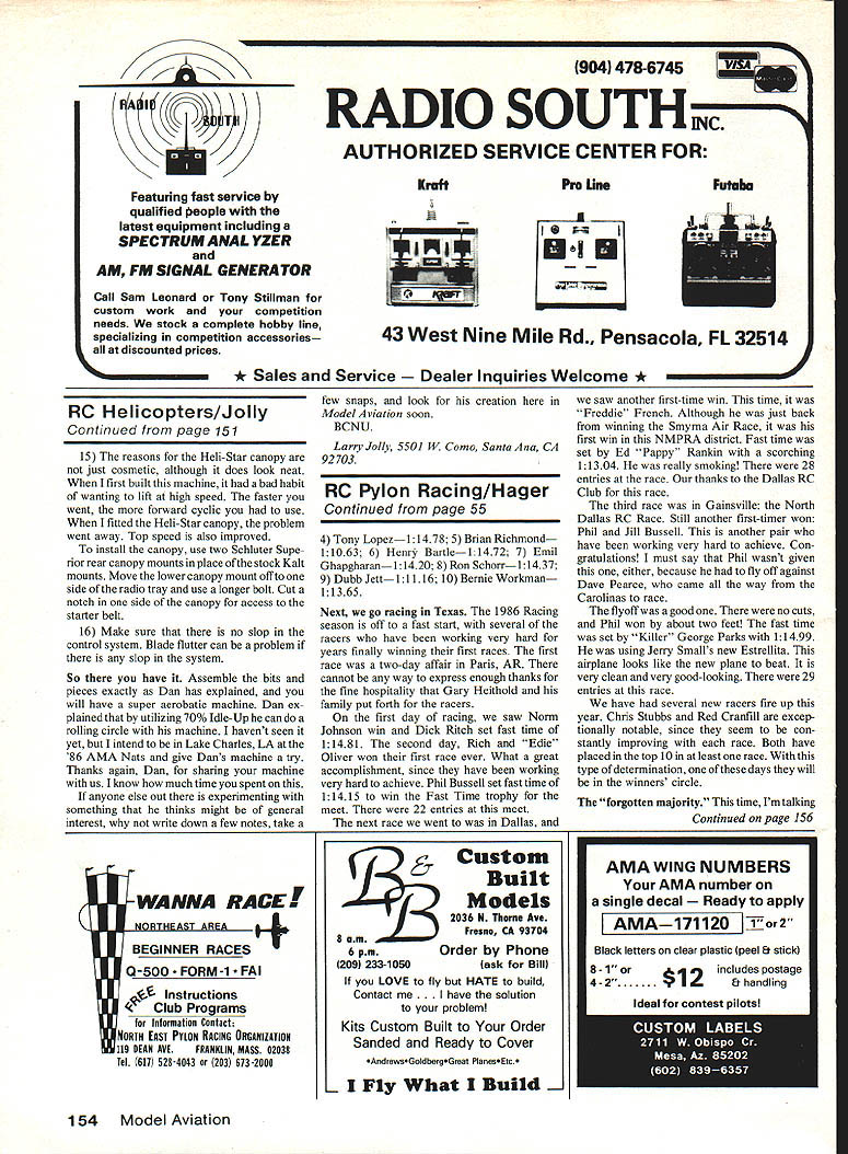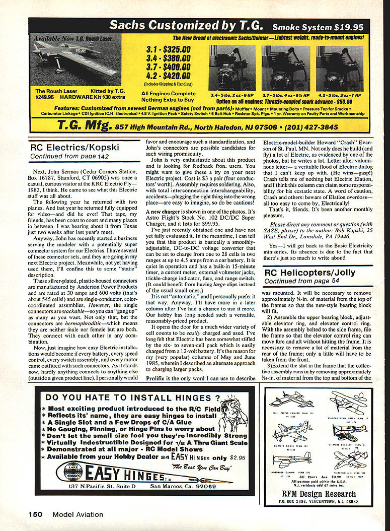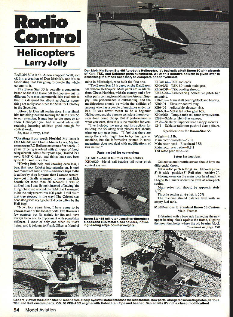Radio Control Helicopters Larry Jolly BARON STAR 55 new chopper Well sort Its creation Dan Melniks its fascinating Im going devote whole column Baron Star 55 actually conversion based Kalt Baron 50 Helicopterbut its different commercial kits available designed all-out aerobatics some thing really seen since Schluter Heli-Boy Seventies Before let Dan tell story must thank him taking time bring Baron Star 55 attention may just sport air show Helicopter mind still retaining hovering abilities good enough contest work So take away Dan Greetings south Florida name Dan Melnik live Miami Lakes first exposure RC Helicopters came after nearly 10 years being involved types fixedwing aircraft About four years ago traded used GMP Cricket things have quite same since Having little help knowing less beat poor Cricket submission took two months solid effortand trips local hobby shop parts care remem berbut finally managed hover little beastie 30 seconds thrilled flying instead having thing chase around field managed hit tree within 100 yards still claim tree stepped way Cricket bent along ego Id bitten Heli bug Now four years later have come known local experts Ive flown few contests fly mainly fun have always experiment something different know other 55 thats flying belongs Frank Dikes friend Mississippi built first Baron Star 55 based Kalt Baron 50 custom Helicopter Most parts available Circus Hobbies canopy few other parts coming Miniature Aircraft Sup ply performance outstanding modifications should within abilities anyone has couple machines under belt never meant beginner Helicopter parts complete conver sion dont come cheap performance what want machine Ive included specs instructions building 55 along photos should clear up questions feel fliers might like try type machine information printed magazines does deal modifications nature Parts needed conversion KHAOI6Metal tall rotor blade holders KHAO2OMetal ball-bearing tail rotor pitch control system KHAO34TSK rod ends KHAO58TSK 80-tooth main gear KHAO59TSK cooling shroud KBSA2OBall-bearing collective pitch bar assembly KB6208Main shaft bearing block bearing KB640 1Elevator control ring KB6402Adjustable elevator ring KB6601Metai tail rotor gear box KHAO6OTorque-tube tail rotor drive system 1299Schluter Heli-Star canopy 1238Schluter Superior rear canopy mounts 124 1Schluter tail rotor pushrod clamp four Specifications Baron-Star 55 Weight95 lb Main rotor diameter57 Main rotor headBlackhead 3 SB Main rotor gear ratio881 Tail rotor gear ratio5 1 Setup Instructions Collective throttle servos should have no differential throw Main rotor pitch settings Idlenegative 50 k positive 30 Full-stickpositive 70 Mixing levers main rotor head C-type Bell mixer should level zero-pitch setting Main rotor rpm should approximately 1700 Throttle setting -stick 50% machine should balance level empty fuel tank Modifications Standard Baron 50 Custom Main Frames 1 Starting bare side frame lay new upper bearing block against frame aligning mounting holes old bearing block Continued page 150 54 Model Aviation Dan Melniks Baron Star 55 Aerobatic Helicopter its basically Kalt Baron 50 bunch Kalt TSK Schiuter parts substituted months column given over describing mods necessary complete yourself Baron Star 55 tail rotor uses Sitar fiberglass blades TSK metal blade holders includ ing leading edge counterweights General view Baron Star 55 mechanics Sharp eyes will detect mods side frames new parts elongated mounting holes various TSK Kait custom parts 05 B1VPH-ABC engine Hatori Hell-Pipe header Dan admits its cheap modification T3 Ga MfM 857 HIgh Mmtalai Rd North Haledon NJ 07508 02014273845 RC Electrics/Kopski Continued page 142 Next John Sermos Cedar Corners Station Box 16787 Stamford CT 06905 once casual curious visitor KRC Electric Fly 1983 think came see what Electric stuff about following year returned two planes last year returned fully equipped videoand did ever tape friends has coast coast places between hearing about Texas just two weeks after last years meet Anyway John has recently started business serving modeler potentially super connector system Electrics have several connector sets going next Electric project Meanwhile yet having used Ill confine some static description silver-plated plastic-housed connectors manufactured Anderson Power Products rated 30 amps 600 volts thats about 545 cells single-conductor colorcoordinated assemblies However single connectors stackableso can gang up want connectors hermaphroditicwhich means neither male nor female both connect other com bination Now just imagine easy Electric installa tions would become battery speed control switch assembly motor came outfitted such connectors As stands now hardly anything connects anything else outside given product line personally would favor encourage such standardization Johns connectors possible candidates such wiring promiscuity John very enthusiastic about product looking feedback users might want give try next Electric project Cost $3 pair four conduc tors worth Assembly requires soldering Also total interconnection interchangeability accidentsplugging right thing wrong placeare easy imagine cautious new charger shown photos Its Astro Flights Stock No 102 DC/DC Super Charger lists $9995 Ive just recently obtained have yet fully evaluated meantime can tell product basically smoothlyadjustable DC-to-DC voltage converter can set charge 28 cells two ranges up 45 amps car battery quiet operation has built-in 15-minute timer current meter external voltmeter jacks trickle-charge indicator fuse range switch could benefit having large clips instead usual small ones automatic personally prefer way Anyway Ill have later column after Ive chance use hobby has long needed such versatile reasonably-priced product opens door much wider variety cell counts easily charged used Ive long felt Electric has somewhat stifled six- seven-cell pack easily charged 12-volt battery Its reason very popular columns Ma