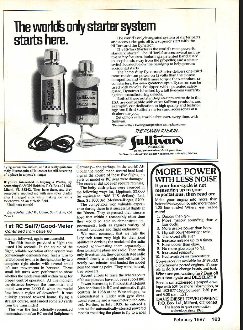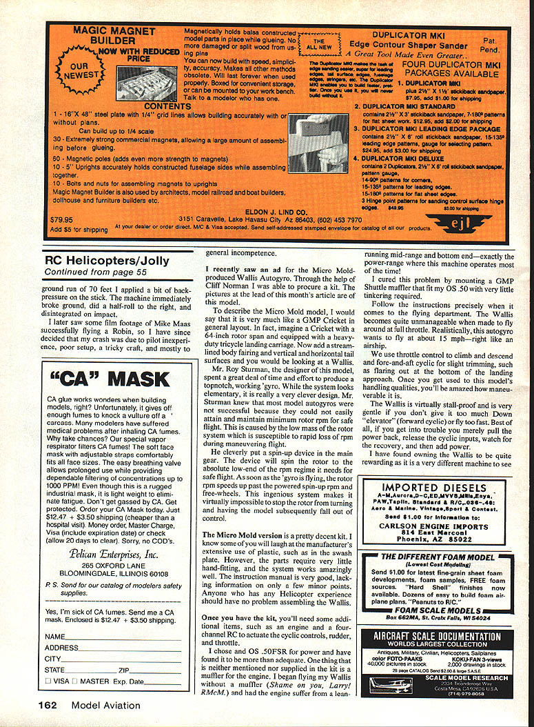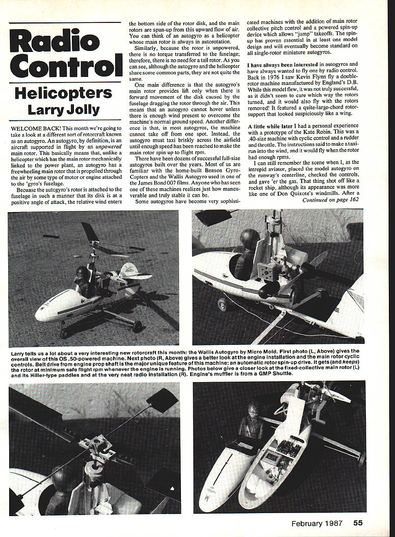 Radio Control Helicopters Larry Jolly WELCOME BACK month going take look different sort rotorcraft known autogyro An autogyro definition aircraft supported flight unpowered main rotor basically means unlike helicopter has main rotor mechanically linked power plant autogyro has freewheeling main rotor propelled through air some type motor engine attached gyros fuselage Becuase autogyros rotor attached fuselage such manner its disk positive angle attack relative wind enters bottom side rotor disk main rotors spun-up upward flow air can think autogyro helicopter main rotor always autorotation Similarly because rotor unpowered no torque transferred fuselage therefore no need tail rotor As can see although autogyro helicopter share some common parts quite same main difference autogyros main rotor provides lift forward movement disk caused fuselage dragging rotor through air means autogyro cannot hover unless enough wind present overcome machines normal ground speed Another differ ence autogyros machine cannot take off spot Instead autogyro must taxi briskly across airfield until enough speed has reached make main rotor spin up flight rpm have dozens successful full-size autogyros built over years Most us familiar home-built Benson GyroCopters Wallis Autogyro used James Bond 007 films Anyone has seen machines realizes just maneu verable truly stable can Some autogyros have become very sophisti cated machines addition main rotor collective pitch control powered spin-up device allows lump takeoffs spinup has proven essential least model design will eventually become standard single-rotor miniature autogyros have always interested autogyros have always wanted fly radio control Back 1976 saw Kevin Flynn fly doublerotor machine manufactured Englands DB model flew truly successful didnt seem care way rotors turned would also fly rotors removed featured quite-large-chord rotorsupport looked suspiciously like wing little later personal experience prototype Kate Robin 40-size machine cyclic control rudder throttle instructions said make taxirun wind would fly rotor enough rpms can still remember scene intrepid aviator placed model autogyro runways centerline checked controls gave er gas thing shot off like rocket ship although its appearance like Don Quixotes windmills After Continued page 162 Larry tells us lot about very interesting new rotorcraft month Wallis Autogyro Micro Mold First photo L Above gives overall view OS 50-powered machine Next photo R Above gives better look engine installation main rotor cyclic controls Belt drive engine prop shaft isthe major unique feature machine automatic rotorspin-up drive gets keeps rotor minimum safe flight rpm whenever engine running Photos below give closer look fixed-collective main rotor 1 its Hiller-type paddles very neat radio installation R Engines muffler GMP Shuttle February 1987 55 ground run 70 feet applied bit backpressure stick machine immediately broke ground did half-roll right disintegrated impact later saw some film footage Mike Mass successfully flying Robin have since decided crash due pilot inexperi ence poor setup tricky craft mostly CA MASK CA glue works wonders building models right Unfortunately gives oft enough fumes knock vulture f carcass modelers have suffered medical problems after inhaling CA fumes take chances special vapor respirator filters CA fumesl soft face mask adjustable straps comfortably fits face sizes easy breathing valve allows prolonged use providing dependable filtering concentrations up 1000 PPM though rugged industrial mask light weight elimi nate fatigue Dont get gassed CA Get protected Order CA Mask today Just $1247 shipping cheaper hospital visit Money order Master Charge Visa include expiration date check allow 20 days clear Sorry no CODs Pelican Enterprises Inc 265 OXFORD LANE BLOOMINGDALE ILLINOIS 60108 P S Send catalog modelers safety supplies Yes Im sick CA fumes Send CA mask Enclosed $1247 shipping NAMF recently saw ad Micro Moldproduced Wallis Autogyro Through help Cliff Norman able procure kit pictures lead months article model describe Micro Mold model would say very much like GMP Cricket general layout fact imagine Cricket 64-inch rotor span equipped heavyduty tricycle landing carriage Now add stream lined body fairing vertical horizontal tail surfaces would looking Wallis Mr Roy Sturman designer model spent great deal time effort produce topnotch working gyro system looks elementary really very clever design Mr Sturman knew model autogyros successful because could easily attain maintain minimum rotor rpm safe flight caused low mass rotor system susceptible rapid loss rpm during maneuvering flight cleverly put spin-up device main gear device will spin rotor absolute low-end rpm regime needs safe flight As soon gyro flying rotor rpm speeds up past powered spin-up rpm free-wheels ingenious system makes virtually impossible stop rotor turning having model subsequently fall out control Micro Mold version pretty decent kit know some will laugh manufacturers extensive use plastic such swash plate However parts require very little hand-fitting system works amazingly well instruction manual very good lack ing information few minor points Anyone has Helicopter experience should have no problem assembling Wallis Once have kit youll need some addi tional items such engine fourchannel RC actuate cyclic controls rudder throttle chose OS 5OFSR power have found adequate thing neither mentioned nor supplied kit muffler engine began flying Wallis muffler Shame Larry RMcM engine suffer lean162 Model Aviation running mid-range bottom endexactly power-range machine operates time cured problem mounting GMP Shuttle muffler fit 05 50 very little tinkering required Follow instructions precisely comes flying department Wallis becomes quite unmanageable made fly around full throttle Realistically autogyro wants fly about 15 mphright like alrship use throttle control climb descend fore-and-aft cyclic slight trimming such flar