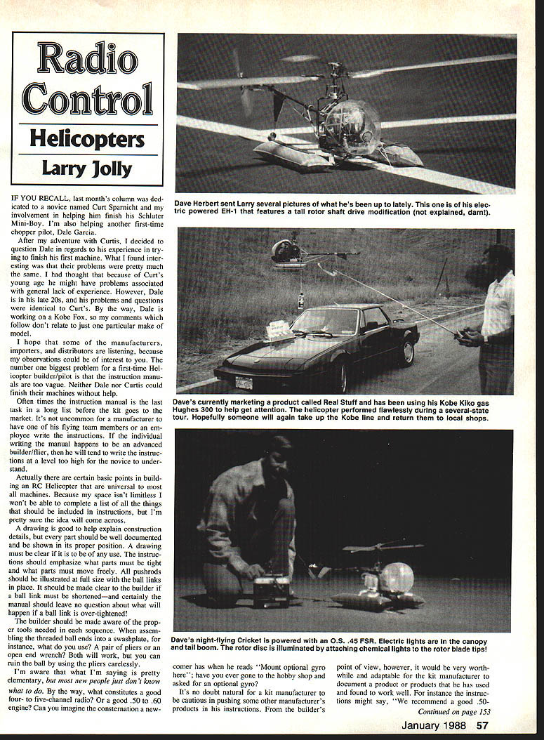 IF YOU RECALL last months column ded icated novice named Curt Sparnicht involvement helping him finish Schluter Mini-Boy Im also helping another first-time chopper pilot Dale Garcia After adventure Curtis decided question Dale regards experience try ing finish first machine What found inter esting problems pretty much same thought because Curts young age might have problems associated general lack experience However Dale late 20s problems questions identical Curts way Dale working Kobe Fox comments follow dont relate just particular make model hope some manufacturers importers distributors listening because observations could interest number biggest problem first-time Hel icopter builder/pilot instruction manu als too vague Neither Dale nor Curtis could finish machines help Often times instruction manual last task long list before kit goes market Its uncommon manufacturer have flying team members em ployee write instructions individual writing manual happens advanced builder/flier will tend write instruc tions level too high novice under stand Actually certain basic points build ing RC Helicopter universal machines Because space isnt limitless wont able complete list things should included instructions Im pretty sure idea will come across drawing good help explain construction details part should well documented shown its proper position drawing must clear sf use instruc tions should emphasize what parts must tight what parts must move freely pushrods should illustrated full size ball links place should made clear builder ball link must shortenedand certainly manual should leave no question about what will happen ball link over-tightened builder should made aware prop er tools needed sequence assem bling threaded ball ends swashplate instance what use pair pliers open end wrench Both will work can ruin ball using pliers carelessly Im aware what Im saying pretty elementary new people just don t know what way what constitutes good four- five-channel radio good 50 60 engine Can imagine consternation newcomer has reads Mount optional gyro have ever gone hobby shop asked optional gyro Its no doubt natural kit manufacturer cautious pushing some other manufacturers products instructions builders point view however would very worth adaptable kit manufacturer document product products has used found work well instance instruc tions might say recommend good 50Continued page 153 January 1988 57 Radio Control Helicopters Larry Jolly Dave Herbert sent Larry several pictures what hes up lately elec tric powered EH-1 features tail rotor shaft drive modification explained darn Daves currently marketing product called Real Stuff has using Kobe Kiko gas Hughes 300 help get attention helicopter performed flawlessly during several-state tour Hopefully someone will again take up Kobe line return local shops Daves night-flying Cricket powered OS 45 FSR Electric lights canopy tail boom rotor disc illuminated attaching chemical lights rotor blade tips CO ~pS ADULTS $300 CHILDREN 6-12 $100 wladult SENIOR CITIZENS $200 NEW PAVILION & EXPO HALL WESTERN WASHINGTON FAIRGROUNDS PUYALLUP WASHINGTON N. FOR INFO CONTACT DON SWEASY 206 847-1279 PO BOX 73939 PUYALLUP WA 98373 DAVE TURNER 206 537-9613 John de Vrzes 4610 Moffat Liz Colorado Springs CO 80915 RC Pylon Racing/Hager Continued page 56 Polekitty/l207 7 Wayne Yeager Michigan Rivets/i 170 8 Duane Gall ColoradoP-51/ 1232 9 Dave Latsha PennsylvaniaNapier/ 1180 10 Steve Kovach GeorgiaP-39/l 231 * indicates positions determined flyoffs Heres second race reported John Kils donk 1987 Midwest Quickie 500 Nationals Westland MI September 20 1987 Host Signal Seekers RC fifth Q500 event re maining CAPS circuit 1987 nice cool day greeted tremendous turnout 37 fliers traditionally biggest Q500 event year because prizes chance fly six rounds turned out due large entry impending weather conditions five rounds could completed used standard CAPS handicap rules Supertigre Como enginesno Rossis tone set early Ken Heatlie turned quick 1299 first round Unfortunately day Ken con frontation ground very next round Old Lady Mrs Murphy far done though second round Dave Keats Ace Merlino spectacular midair collision club reporter has ever seen second lap tried high-speed mating maneuver both airplanes going straight up locked together powered Aces en gine planes finally wiggled enough Daves unpowered airplane broke loose did series slow-motion tumbles fell back ground Meanwhile Ace still trying fly fuselage succeeded doing perfect stall-turn ending arrow-shot directly stan/finish line An added attraction contest use police radar gun No 2 pylon Much everyones amazement airplanes clocked around 100 mph top ones running fast 111 mph entering turn No 2 interesting note since CAPS changed rules require use stock muf flers two-second difference race times all-time record ST- Como powered Q500s 1264 Ace Merlino ST MACS Quickie-X muffler another good race lots close competitive flying Adrian Apaza won perfect score John Kilsdonk Denny Sumner tied point downbut decided fly off Joe Cohen got act back together fourth place Jim Widman continued season-long steady flying fifth Mel Baker won Best Novice award fliers workers received souvenir hats workers got merchandise prize special raffle results 1 Adrian Apazal317 2 Denny Sumner12841 3 John Kils donkl327 4 Joe Cohenl353 5 Jim Widmanl342 6 Chuck Wooley1334 7 Barney Polzinl338 8 Bob Hisey1350 9 Bob Nicholasl 373 10 Tom Melita 1311 Fast time Joe Dodd 12831 Best Novice Met Baker Thanks again Brian Palacios John Kils donk contest reports Remember guys want need photos contest nouncements race results etc pay photos used column Im always glad hear Racers write sometime Bill Hager 706 Glen Haven Dr Conroe 7X 77385 RC Helicopters/Jolly Continued page 57 60-size engine machine have tested OS FSR Enya 60X Supertigre 60 prototype found reliable easy adjust What about servos structions could specify ball-raced output servo minimum 45 in-oz torque kit manufacturer 