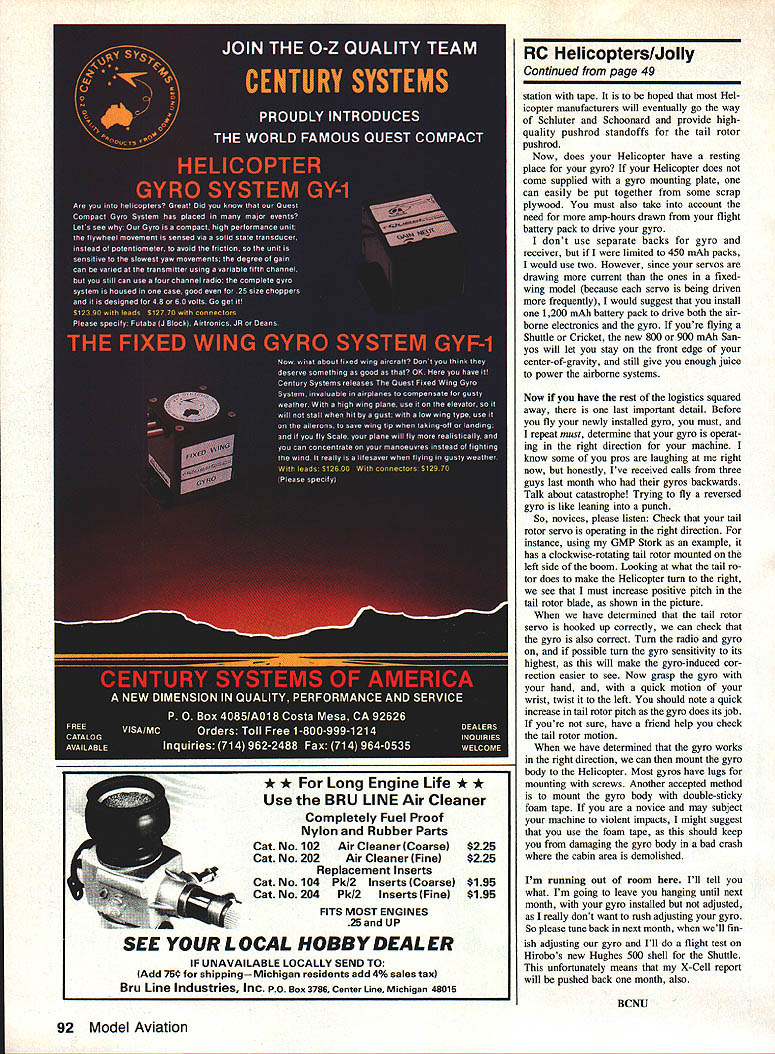 THIS MONTH going look gyros know ever since Collin Cameron Tough started publishing RC Helicopters Magazine youve told gyros necessarybut gyro used model Helicopter employed dampen movement around yaw axis Depending much gain authority gyro possesses tail can transformed gentle kitten instead twisting feisty tiger What gyro exactly very sensitive magnetic motion sensor have think little black box makes tail rotor much manageable imagine quite few novice Hel icopter pilots Out reading please listen gyro mandatory make RC Helicopter fly will however decrease flight workload left thumb good thing because cases try ing control tail can cause overload thinldng department youre learning So recommend use gyro learning fly taking advantage its ability decrease radius learning curve once proficient will learn kick gyro Out depending need Lets assume youve now decided get RC Helicopters youre collecting equip ment youll need So gyro buy Tough question see seems everyone sells gyro system Futaba Sanwa Circus Min iature Aircraft Supply Gorham Century Sys tems America hope didnt forget anybody Whenever forget get letter bombs anyway get idea suppliers sell gyros work Trying decide system better other tough think ultimately has preference cant honestly say preference based solely gyro performance theres just noticeable difference example going look two gyros First now-legendary KO gyro Japan once imported Krafthence name Kraft gyroandnow imported solely Gorham Model Products GMP KG-lK called stick-authority gyro What means tail rotor lever transmitter neutral position gyro can exercise its max imum authority machine Likewise control lever deflected its maxi mum throw gyro has its minimum authority would expect amount author ity linear corresponding movement tail rotor control lever KG-lK very simple gyro install operate adjustment needs make sensitivity must determined particular model has wellaccepted unit perfect sport flier second example Futaba 152 gyro As picture shows gyro has few com ponents KG-IK 152 featuring two distinct gyro output sensitivity rates typifies contest-type unit What means type gyro no stick authority so-called high low rates gain authority pilot decides rate re quires given maneuver via auxiliary channel transmitter switches high low vice-versa pretty nice setup appears way gyros going Now go local field see gy ros locals using Chances will several aforementioned types use may decide go gyro radio manu facturer sells case find fits needs find someone help give hand setting yours up first time Before installing gyro must first sure Helicopter reedy mean must make reasonable ef fort ensure no slop binding tail rotor linkage must flimsy twisting double-centering pushrod will make RC Helicopter Some hints subject very careful taping plastic pushrod housing tail boom check smooth operation hand secure Continued page 92 March 1988 49 Radio Control Helicopters Larry Jolly 5501 W Como Santa Ana CA 92703 Hirobos beautiful little Hughes 500E shell Shuttlestraight out box Lar ry will talk about next month Larry shows mounted Futaba 152 gyro GMP StorkLook closely Gyro self rounded box off Large white disk Airtronics servo-output wheelfor creased collective pitch travel Just below Futaba gyros black boxes Two Helicopter gyros available Above GMP KG-i K stick-authority type useful stabilizing both choppers stiff-wing birds Below Futaba 152 different kind gyro has adjustable high- low-gain sensltivty settings can Interchanged radio command Heres check see gyro hooked up correctly Left Looking down tail rotor Larrys GMP Stork shows high pitch needed right rudder Right sharp twist gyro case left should result right rudder Completely Fuel Proof Nylon Rubber Parts Cat No 102 Air Cleaner Coarse Cat No 202 Air Cleaner Fine Replacement Inserts Cat No 104 PkI2 Inserts Coarse Cat No 204 PkI2 Inserts Fine FITS MOST ENGINES 25and UP SEE YOUR LOCAL HOBBY DEALER IF UNAVAILABLE LOCALLY SEND TO Add 75 shippingMichigan residents add 4% sales tax Bru Line Industries Inc PO Box 3786 Center Line Michigan 48015 $225 $225 $195 $195 RC Helicopters/Jolly Continued page 49 station tape hoped Hel icopter manufacturers will eventually go way Schiuter Schoonard provide highquality pushrod standoffs tail rotor pushrod Now does Helicopter have resting place gyro Helicopter does come supplied gyro mounting plate can easily put together some scrap plywood must also take account need amp-hours drawn flight battery pack drive gyro dont use separate backs gyro receiver limited 450 mAb packs would use two However since servos drawing current ones fixedwing model because servo being driven frequently would suggest install 1200 mAh battery pack drive both air borne electronics gyro youre flying Shuttle Cricket new 800 900 mAh San yos will let stay front edge center-of-gravity still give enough juice power airborne systems Now have rest logistics squared away last important detail Before fly newly installed gyro must repeat must determine gyro operat ing right direction machine know some pros laughing right now honestly Ive received calls three guys last month gyros backwards Talk about catastrophe Trying fly reversed gyro like leaning punch So novices please listen Check tail rotor servo operating right direction instance using GMP Stork example has clockwise-rotating tail rotor mounted left side boom Looking what tail ro tor does make Helicopter turn right see must increase positive pitch tail rotor blade shown picture have determined tail rotor servo hooked up correctly can check gyro also correct Turn radio gyro possible turn gyro sensitivity its highest will make gyro-induced cor rection easier see Now grasp gyro hand quick motion wrist twist left should note quick increase tail rotor pitch gyro does its job youre sure have friend help check tail rotor motion have determined gyro works right direction can mount gyro body Helicopter Most gyros have lugs mounting screws Another accepted method mount gyro body double-sticky f