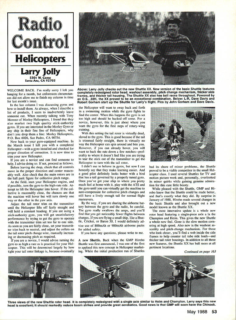 WELCOME BACK Im really sorry left hanging month unforeseen circumstan ces did allow finish column time last months issue last column discussing gyros install As always describe list products seem inadvertently leave someone out recently talking Tony Moreno Morley Helicopters found also market two high quality stick-authority gyros interested Morley Gyro ship fine line Helicopters dont drop line Morley Helicopters PO Box 6026 San Pedro CA 90734 Now back gyro-equipped machine March issue left completed Helicopterwith gyro installed checked proper direction correction now time trim new Helicopter novice can find someone help advise doing proceed follows Before leaving shop check controls move proper direction center reason ably well Also check main rotors ball park figure collective pitch range field start Helicopter engine possible turn gyro high-rate side tempt lift Helicopter hover col lective reasonably close chances machine will hover will turn slowly way other yaw axis Adjust tail rotor trim transmitter until Helicopter lifts off fairly straight will hold constant heading using stick-authority gyro will get unsatisfactory performance trying get gyro operate transmitter trim set too far side As soon fairly close set transmit ter trim back neutral adjust collets tail rotor pitch change wire manually increas ing decreasing pitch required novice would advise turning gyro high rate practical Hel icopter will determined largely tight tail rotor linkage because eventually Helicopter will want sway back forth swimming motion gyro fights find center happens gyro set too high should backed off some novice however just about want gyro first steps rotary-wing training setting tail rotor virtually dead slaved gyro good because tail trimmed fairly straight virtually no way Helicopter can spin around bite However can already hover will want back rate down few notchespref erably doesnt feel like trying tear stick out transmitter get Helicopter turn tail rotor didnt use believe gyros now can honestly say make learning easier good pilot definitely looks better bird has tail governed properly tuned gyro Once youve got ship pretty much feel home play ATS gyro until can virtually get machine auto-compensate collective pitch changes still have lively enough tail normal flight maneuvers way sharing airborne bat tery between gyro radio careful gyro really swallows amps youll find get noticeably fewer flights between charges flying small ship like Shut tle Cricket Baron 30 would definitely ad vise use 800mAh 900mAh airborne packs added safety have questions please write its share minor problems Shuttle proved viable competitor small Hel icopter class used several Shuttles TV motion picture work personally overlooked its minor quirks gaining genuine admira tion cute little beasty pleased Shuttle GMP Hi robo knew Shuttle could made better thats exactly what did surprise January 1988 Hirobo made several changes basic Shuttle also brought out new model known Shuttle XX innovative update whole new rotor head featuring single-piece axle Ia Champion Helm gives new Shuttle whole new feel Gone slow motion corn ering high speed Also new washout sembly pitch-change mechanism look closer youll find web inside side frames help counter tail tube side loadsand thicker tail rotor housings addition new features Shuttle XX has ball races pertinent locations new Shuttle Back GMP Hirobo Shuttle first announced first applaud new concept Helicopter market ing initial production run Shuttles Continued page 163 May 1988 53 Radio Control Helicopters Larry Jolly 5501 W Como Santa Asia CA 92703 Above Larry Jolly checks out new Shuttle XX New version basic Shuttle features completely redesigned rotor head washout assembly pitch change mechanism thicker side frames thicker tail housing Shuttle XX also has ball races throughout Powered OS 32H XX proved exceptional combination Below L-R Dave Davis Robert Gorham start up Shuttle Larrys flight Pica John Gorham Dave Davis Three views new Shuttle rotor head completely redesigned single axle similar Helm Champion Larry says new head excellent should markedly reduce boom strikes provide great aerobatics Good news GMP will soon have Chinook YellowMills Air- 301 956-2868 Hambleton Jacketplane3308Riva MD 21140 Models See next month RC Helicopters/Jolly Continued page 53 got fly new XX models very pleased finished product 05 32 XX really performa talking big-ship performance believe could better called Shuttle no excuses some wont end up tinkering its cer tainly necessary to enjoy way little cutie flies Check out both local dealer new Shuttles canopy aqua green XX version ia white metal gear struts Hirobo has also redone decal sheet can tractively trim new machine ease checking out new Shuttle UMP factory accidentally stumbled some bigger news Shuttle glarce picture noticed semiscale model Boe ing Vertols Chinook painted Kawasakis color schemeon low approach tail low wheels about ready roll John Gorham saw checking out photo handed data sheet form telefaxed letter Hi robo fax made plain Hirobo engineers have again have produced small tandem Helicopter 39-in-dia rotors new ship features flybarless three-bladed rotor heads weighs 7 lb powered 0S 32 Before laugh 7-lb weight remem ber tail rotor eats up significant amount powerand tandem power used provide lift Also relative disc loading lower because extra rotor what could see photo model highly prefabricated new Hirobo Chinook has since shown Nuremberg big hit GMP will showing Toledo dont know about Ive waited model like long time youre inter ested contact GMP dealer details BCNU Larry LSF Level V/Vennerholm Continued page 58 max guess can handle almost anticlimactic counted down minute minute rac ing through last 60 seconds Finally announced eight hours Everybody cheered probably because could final ly go home time bring airplane down very carefully because though stayed up eight hours landing within 200 meters launch point wasnt whole flight would w