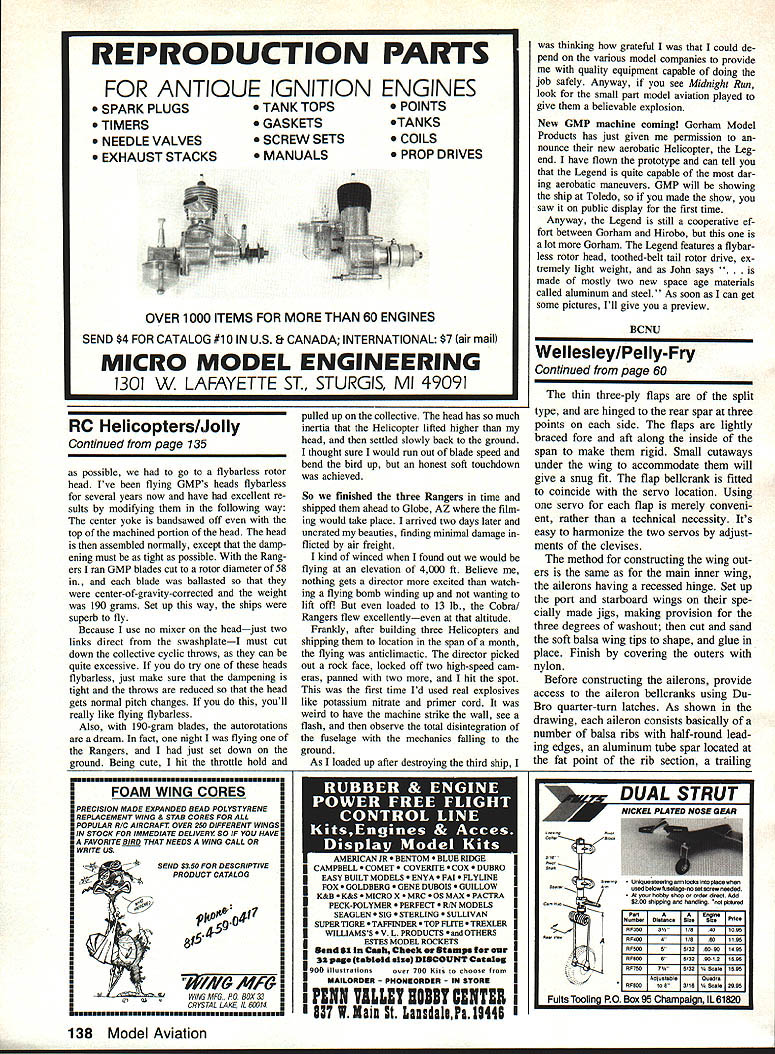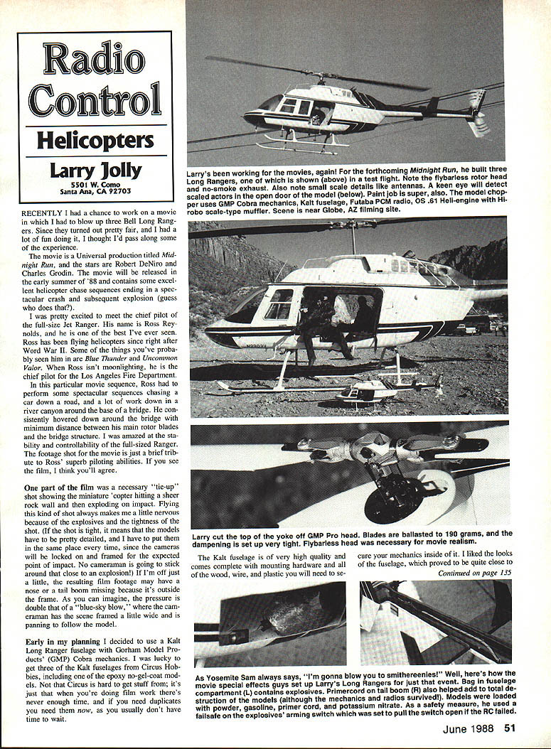 RECENTLY chance work movie blow up three Bell Long Rang ers Since turned out pretty fair lot fun doing thought Id pass along some experience movie Universal production titled Mid night Run stars Robert DeNiro Charles Grodin movie will released early summer 88 contains some excel lent helicopter chase sequences ending spec tacular crash subsequent explosion guess does pretty excited meet chief pilot full-size Jet Ranger name Ross Rey nolds best Ive ever seen Ross has flying helicopters since right after Word War II Some things youve proba bly seen him Blue Thunder Uncomnwn Valor Ross isnt moonlighting chief pilot Los Angeles Fire Department particular movie sequence Ross perform some spectacular sequences chasing car down road lot work down river canyon around base bridge con sistently hovered down around bridge minimum distance between main rotor blades bridge structure amazed sta bility controllability full-sized Ranger footage shot movie just brief trib ute Ross superb piloting abilities see film think youll agree part film necessary tie-up shot showing miniature copter hitting sheer rock wail exploding impact Flying kind shot always makes little nervous because explosives tightness shot shot tight means models have pretty detailed have put same place time since cameras will locked framed expected point impact No cameraman going stick around close explosion Im off just little resulting film footage may have nose tail boom missing because its outside frame As can imagine pressure double blue-sky blow cam eraman has scene framed little wide panning follow model Early planning decided use Kalt Long Ranger fuselage Gorham Model Pro ducts GMP Cobra mechanics lucky get three Kalt fuselages Circus Hob bies including epoxy no-gel-coat mod els Circus hard get stuff its just youre doing film work theres never enough time need duplicates need now usually dont have time wait Larrys working movies again forthcoming Midnight Run built three Long Rangers shown above test flight Note flybarless rotor head no-smoke exhaust Also note small scale details like antennas keen eye will detect scaled actors open door model below Paint job super also model chop per uses GMP Cobra mechanics Kalt fuselage Futaba PCM radio OS 61 Hell-engIne Hi robo scale-type muffler Scene near Globe AZ filming site As Yosemite Sam always says Im gonna blow smithereenies Well heres movie special effects guys set up Larrys Long Rangers just event Bag fuselage compartment L contains explosives Primercord tail boom R also helped add total de struction models although mechanics radios survived Models loaded powder gasoline primer cord potassium nitrate As safety measure used failsafe explosives arming switch set pull switch open lithe RC failed June 1988 51 Radio Cono Helicopters Larry Jolly 5501 W Como Santa Ana CA 92703 Larry cut top yoke off GMP Pro head Blades ballasted 190 grams dampening set up very tight Flybarless head necessary movie realism Kalt fuselage very high quality cure mechanics inside liked looks comes complete mounting hardware fuselage proved quite close wood wire plastic will need Se-Ctrnd nn naQe 135 RC Old-Timers/Mathews Continued page 49 clety will sponsor Nostalgia Gas Free Flight events SAM Champs will AA A B C Ignition classes details send SASE MJ Whittemore Jr RR #1 Box 296 New Palestine IN 46163 Mark calendars now largest best SAM Champs ever Reno NV June 19-22 1989 site may also used AMA Nats following week As have tended Nats air races Stead AFB can attest likely finest site West meet may finest modeling event decade Youll find pleasant weather resort set ting excellent facilities What could ask Remember S&H Green Stamps such tale modeler wife sent him grocery store pick up few items As checked out checker asked save stamps Whereupon replied Nab build model airplanes RC Pylon Racing/Hager Continued page 50 Cant victorious race say dont have latest engine trick prop No should have positive attitude efforts Racers have ability win heat although other factorscompletely unrelated may affect winning attitude pilots consistently win have attitude built everything have worked long hard alsotans merely go through motions participat ing buddies have no real intentions ing Number circuit district na flon can Yes So go next race give tryput smile have good time important don rforger winning attitude youve leaving home until now noted poem subject sums up very well Racers Lament think beaten you think dare dont like win think cant Its almost cinch wont think youll lose youre lost Out real world find Success begins fellows will Its state mind think youre outclassed Youve got think high rise Youve got sure yourself before can ever win Next month Racers past surface years Phoenix air races See races responding advertisers mention read about ModelAviation RC Helicopters/Jolly Continued page 51 scale almost free blemishes prob lem tail boom didnt fit fu selage too well joint however wasnt bad easily faired little Bondo two trusty sidekicks Greg Ford Alex Bereczky helped major portion building Dennis Brandt handled mask ing spraying three-color paint scheme mechanics chose GMPs Cobras autorotation Pro heads really like Co bra usually use film work have found very quick build easy fit scale fuselage powerful reli able particular Cobras used 05 61 Hel power coupled Hirobo scale-type muffler quiet engine get exhaust out cabin either building thinking build ing Kalt Long Rangers might think about using Hirobo muffler fuse lage pretty narrow much room muffler course could use rearexhaust engine solve problems Anyway Cobra/OS/Hirobo muffler combo lay right Kalts fuselage perfect fit Lately Ive using PCM FM pulse-code modulationRMcM radios movie work especially scenes copter must blown up feel safer fall-safe function set move servo arm away detona tion switch Rangers used Futaba PCMs have very pleased per formance Since Rangers close scale Continued page 138 June 1988 135 ELECTRICNQAdEi& Buzz skies search RED BARON DSCs neat 
