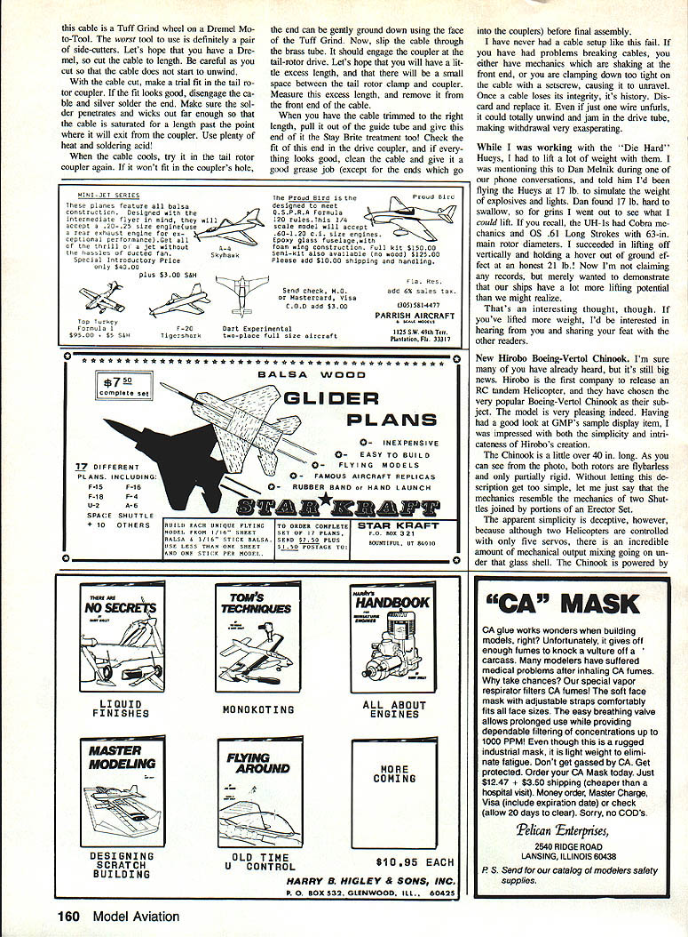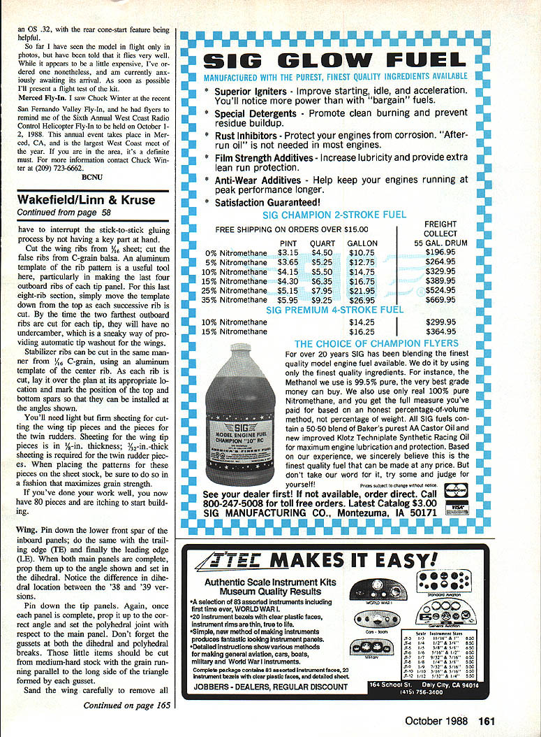 DIE HARD REVISITED Welcome back Two months ago told about large-scale UH-ls flying movie Die Hard end column promised Id give description inexpensive tail drive used models So goes have given thought flying Scale Helicopters youve undoubtedly found some best full-size ships have high-mounted tail rotors can real problem must figure Out some system drive models highmounted tail rotorone doesnt leave ugly nonscale parts hanging out the- breeze sys tem use old speedometer-cable-running-inthe-curved-brass-tube trick Now realize system old Dieters Hegi Cobra worksand works well advantage system has over solidshaft-and-bevel-gearbox arrangement cheap noncritical alignment cheap has fewer setscrews loosen cheap has easy access repair damage occursand course its cheap So youre building model like Huey go down hobby shop get length 36-in K&S brass tube outside diameter /6 will also need two 12-in lengths 3A6-in-outside-diameter %2-inOD brass tube well some Stay Brite silver solder way home stup local auto parts store pick up package replacement speedometer cable next step applies GMP machine other makes basically same Remove couplers tail drive shaft both tail rotor gearbox main drive gear ends loosening setscrews giving couplers twist pair pliers Check speedometer cables outside diameter use drill appro priate size bore Out holes couplers holes should allow cable fit closely just loose interference fit Still reference GMP machine make two OK Heres home-brew simple reliable tall rotor drive setup Larry used Hueys tells set up column Larry youll just have practice Shame Actually whats left part Die Hard Huey fleet after finishing filming action sequence observes Its good thing filmmakers dont treat actors like props A-in plywood rectangles fit between will need use bending make screws would normally hold tail tube bends gradual possible dont need place Center drill rectangles kiniced tube Ideally tube should run 3/6-in drill Now temporarily mount mechan- few inches behind main frames within ics wood bearers fuselage shell inch tail rotor gear box must also se Check see much 36-in brass tube Continued page 158 Hope head-on shot Die Hard Hirobos new Boeing-Vertol Chinook tandem Huey its landing lights comes out rotor chopper Theres just 05 32 FSR OK Note flight crew dummies too Larry nose bird driving both rotors says lights add whole new dimension blades intermesh driven nochopper should become standard slip toothed belt Larrys ordered Scale Helicopters will report soon possible October 1988 55 Radio Control Helicopters Larry Jolly 5501 W Como Santa Ma CA p2703 Handfull lead blocks Larry holding additional 7 lb 14-lb Die Hard UH-ls could lift 05 61 Long Stroke Thats 21 lb total Has anyone done better PS Im SIXTEENTh year flying Elec tric have nagging question grows continuously scope Electric grows matur ity What Earth air OHFIVE Doesnt sound like something ET would say Really folks Getting rid such nonsensical nomenclature LONG LONG overdue alternatives Please see column April 1987 issue MA RC Pylon Racing/Hager Continued page 54 registration given two cards numbered contestant number both with b cards placed under respective model contestant judges viewed aircraft getting no closer standing over rated no 30 seconds took less time Periodically judges would caucus add scores average nearest Ao-point have change might recommend would disregarding high low score averaging remaining four scores thereby eliminating controversy about judging own aircraft procedure went very well quick minimum gripes Try sometime procedure went very well quick minimum gripes Try sometime may like race Dave Shadel started off zero Round 1 result aileron servo failure detected before flew Now theres good plug checking controls before flight great air racers set personal best times including yours truly round two 10924 time turned Out Fast Time day end Saturdays fly ing two people perfect scores Larry Laulom Gary Hover Close behind ever group three point down several wbo two points down Sunday started off Round 6 Times wereagain extremely fast several 1 lOs llls being posted Round 7 Bob Smith set new fast time contest 10908 Round 8 saw little change final results Following years race once again annual Calcutta pitting 13 fastest pilots against other treated two fi nal rounds since everyone double-cut firstexcept Lee VonderHey planted borrowed racer around turn three finalfinal round saw Bob Smith Dave Shadel wingslapping other allowing eventual win ner Bob Dible scoot home flag Bob Dible bought Bob Smith way $70 very interesting Thanks great planning CD Jim Sneed key workers like starter Wayne Scuri event went extremely well Looking forward next year race results listed points/best time 1 Gary Hover 32/1 0924flyofO 2 Larry Laulom 32/1 1089flyoft 3 Mike Hen sel 30/111 61flyoff 4 Ron Mendel 30/ 11809flyoff 5 Gary Long 28/11588 flyoft 6 Ed Hotelling 28/114 12flyoff 7 Dave Shadel 27/11067 8 Lyle Larson 27/ 11159 9 Scott Manning 27/11291 10 Mark Lattimore 27/11711 11 Chuck Brown 27/12332 12 Bob Smith 26/10908fast time Best finish went Lyle Larson Calcutta winner Bob Dible received $67250 winners share Send stuff like contest reports helpful hints pho tos ideas Ill best get print Model Aviation Please note Ive got new address RC Helicopters/Jolly Continued page 55 cured fuselage shell places possible along its length next step mark position Hirobos tail rotor clamp resultant tail ro tor center Secure tail tube inside fuselage cut tube appropriate length usually use several formers help secure tube Now fabricate stub shaft-guide tube will reach between front end drive tube mounted fuselage through plywood wood blocks terminate just behind drive shaft coupler tail-drive gear have approximate length solder -in length %2-in tube over joinlng end stub tube can coupled drive tube makes easy removal mechan ics Now comes tricky part now have figure approximate length speedom eter cable have found best tool cutting Stainless Steel #11 Bla
