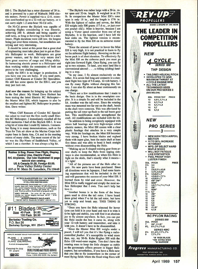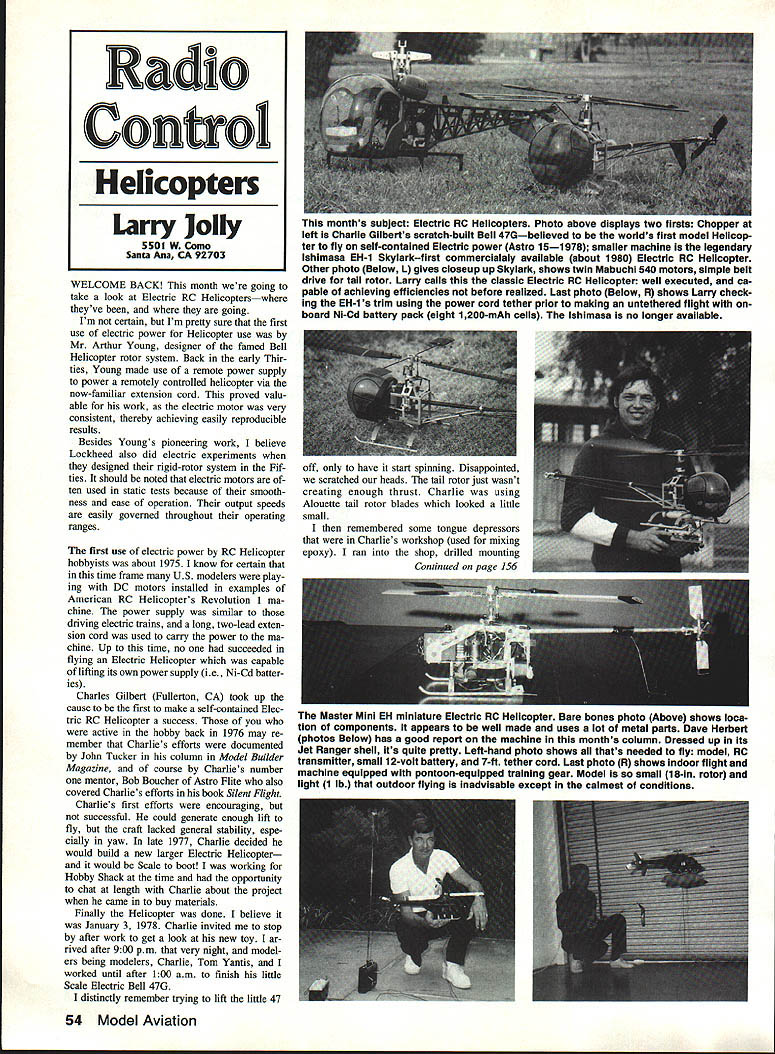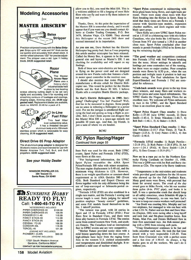 WELCOME BACK month going take look Electric RC Helicopterswhere theyve going Im certain Im pretty sure first use electric power Helicopter use Mr Arthur Young designer famed Bell Helicopter rotor system Back early Thir ties Young made use remote power supply power remotely controlled helicopter via now-familiar extension cord proved valu able work electric motor very consistent thereby achieving easily reproducible results Besides Youngs pioneering work believe Lockheed also did electric experiments designed rigid-rotor system Fif ties should noted electric motors ten used static tests because smooth ness ease operation output speeds easily governed throughout operating ranges first use electric power RC Helicopter hobbyists about 1975 know certain time frame US modelers play ing DC motors installed examples American RC Helicopters Revolution 1 ma chine power supply similar driving electric trains long two-lead exten sion cord used carry power ma chine Up time no succeeded flying Electric Helicopter capable lifting its own power supply ie Ni-Cd batter ies Charles Gilbert Fullerton CA took up cause first make self-contained Elec tric RC Helicopter success active hobby back 1976 may re member Charlies efforts documented John Tucker column Model Builder Magazine course Charlies number mentor Bob Boucher Astro Flite also covered Charlies efforts book Silent Flight Charlies first efforts encouraging successful could generate enough lift fly craft lacked general stability espe cially yaw late 1977 Charlie decided would build new larger Electric Helicopter would Scale boot working Hobby Shack time opportunity chat length Charlie about project came buy materials Finally Helicopter done believe January 3 1978 Charlie invited stop after work get look new toy ar rived after 900 pm very night model ers being modelers Charlie Tom Yantis worked until after 100 am finish little Scale Electric Bell 47G distinctly remember trying lift little 47 months subject Electric RC Helicopters Photo above displays two firsts Chopper left Charlie Gilberts scratch-built Bell 47Gbelieved worlds first model Helicop ter fly self-contained Electric power Astro 151978 smaller machine legendary Ishimasa EH-1 Skylarkfirst commercialaly available about 1980 ElectrIc RC Helicopter Other photo Below L gives closeup up Skylark shows twin Mabuchi 540 motors simple belt drive tail rotor Larry calls classic Electric RC Helicopter well executed ca pable achieving efficiencies before realized Last photo Below R shows Larry check ing EH-1 s trim using power cord tether prior making untethered flight onboard Ni-Cd battery pack eight 1 200-mAh cells Ishimasa no longer available Master Mini EH miniature Electric RC Helicopter Bare bones photo Above shows loca tion components appears well made uses lot metal parts Dave Herbert photos Below has good report machine months column Dressed up its Jet Ranger shell Its quite pretty Left-hand photo shows thats needed fly model RC transmitter small 12-volt battery 7-ft tether cord Last photo R shows indoor flight machine equipped pontoon-equipped training gear Model small 18-in rotor light 1 lb outdoor flying inadvisable except calmest conditions 54 Model Aviation Radio Conoi Helicopters Larry Jolly 5501 W Como Santa Asia CA 92703 off oniy have start spinning Disappointed scratched heads tail rotor just wasnt creating enough thrust Charlie using Alouette tail rotor blades looked little small remembered some tongue depressors Charlies workshop used mixing epoxy ran shop drilled mounting Continued page 156 COMPLETE LINE AVIALABLI AT QUALITY HOBBY SHOPS judges elected downgrade landing rather zero prompted protest USA After being reviewed FAI Jury protest denied since judges down graded both landing approach Rules rulesor sufficient time three rounds flying fact could have flown four rounds think majority teams wanted organizers permitted some odd rea son seem hung up maximum three rounds factor As turned Out split third round over two days Friday Satur day just public pars event watch Final flights completed about noon Saturday awards took place back grandstand opening ceremonies began Previous writings have alluded winners final placements wont get aspect However congratulations Phil Avonds 1988 World Champion flying FLS Eagle ducted fan Great Britain 1st Place Team Peter McDermott Brian Tay lor Mick Reeves contestants standpoint became highly obvious requisite winning combination scratch-built high-static highcomplexity-bonus four-stroke-powered model flew slowly appeared might fall out sky Any model sounded fast appar ently going too fast eyes judges un less course ducted fan WW Il-type aircraft faster went im pressed judges summary rhe US team must never overlook iota rule book doubt should get number opinions close coveted Team Championship years team little luck some better planning could have placed notch two higher Congratulations fellow team members Ramon Torres Miami FL Bob Hanft Al berta AL first world champion ships certainly last Congratulations also veteran Team Manager John Guenther complete tireless effort will notice valleys weave clearly noticeablea clear sign no ex cess epoxy sure avoids pile sticky paper throw away detail Sometimes epoxy forms light surface coating damp substance remove brush soapy water spray auto primer using very light abra sive paper sand down till get tips PEAKS weave showing repeated until valleys properly filled dont need tell careful sanding down through epoxy working glass cloth As soon peaks appear stop sanding Believe technique messy usually wind up just cleaning hands throwing sponge away Thanks Bill Ill try Bill would like hear anyone finds technique useful can reached Verdi 4580 Bit A-102 Montevideo Uruguay Attention FAI judges/fliers Mike Harrison Hot Springs AR asked announce first annual FAI Judging Scboolfeaturing Ron Chidgeywould held April 8-9 1989 800 am noon Radisson Hotel ledo OH Ron Chidgey international FAI/CIAM RC Aerobatics Subcommitte