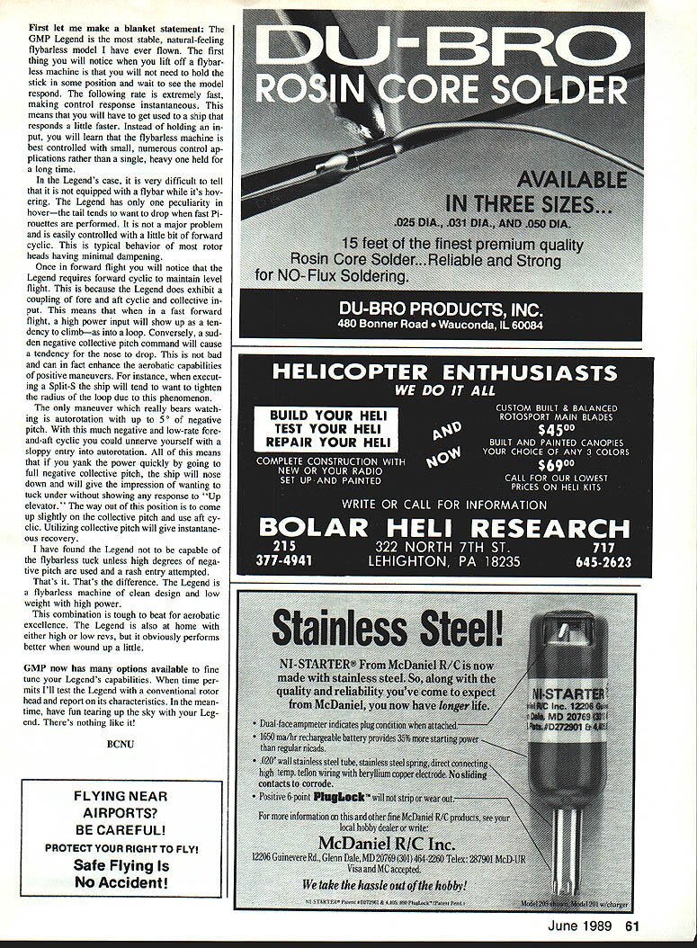 LAST MONTH took look Gorham Model Products new Legend flybarless-rotor-head sport/competition machine recall really liked Legends aerobatic prowess excep tional autorotation capabilities pick up left off Ive now got experience Legendabout five gal lons hard flyings worth Nothing has cracked fallen off have found few things watch out First keep tail rotor drive belt tight Its dif ficult describe tight makes right Its basically set properly cant rotate main rotor restraining tail rotor course must no excessive drag sys tem run tail rotor belt too loose could wear out front plastic drive pinion occurs recourse replace pin Ion symptom loose belt glitchy tail hover rapid collective pitch movements applied almost looks like ship has gyro rate too sensitive resulting hunting yaw other thing look Teflon washers collective pitch pivot will eventu ally wear will need replaced restore units original slop-free condition Last month mentioned flybarless models fly little differently used fact will gist report Flybarless models seem get perpetual bad rap Horizon won Nats general consensus Horizon rea sonable machine Hubert Bitner won de spite lack flybar So whats difference between ship has flybar flybarless obvious answer ybar Just what steel rod its two little pad dles doing us Basically Hiller flybar al lows us feed control inputs flybar turn controls main rotor blades done disturbing rotor disc flybar re turns its neutral setting forces main ro tor blades feather neutral position So effect flybar adds autostabilization ro tor head flybar also goes action rotor disc acted upon outside force such gust wind As know Hiller sys tems superstablebut also tend slow reacting control input response rate can course increased adding mixer input directly blades known Bell/Hiller system modem flybar systems based generally accepted norm basic modifications being make head tighter looser depending method dampening So what happens throw flybar away Well first thing decrease drag Note Larrys Legend equipped Larry Chris Jolly head flying ses flybarless rotor head Blade linkage tea- sion new Legend chopper Note tures delta hinge midway up rotor shaft now has flybar-type rotor head affecting rotor system Thats good means quicker response input types short its efficient system power available main rotor penalties Remember said quicker response put also includes outside influences like wind gusts other atmospheric stimuli Re member flybar tended dampen out effects Without flybar things controlling system servos herent stability blades As know rotor blades have center-of-gravity aft point blade rotates pitch makes blades lag tend buzz generally unsta ble pitch going depend stability blade must find some method stabilize can accomplished adding ballast leading edge blade thereby bringing its center-of-gravity pivot point closer same location benefit twofold added weight also improves blade momentum dur ing autorotation greater mass further increases job cyclic servos means flybar less model must use strongest servos best gear trains ensure precise input maximum control power course true Helicoptersbut important case So much physical differences Lets look differences practice 60 Model Aviation Radio Conoi Helicopters Larry Jolly 5501 W Como Santa ADa CA 92703 GMP Legend Helicopter doing what does bestcruising skies column Larry says Legend good acrobatic machine too shot bird inver ted flight substantiates claim First let make blanket statement GMP Legend stable natural-feeling flybarless model have ever flown first thing will notice lift off flybar less machine will need hold stick some position wait see model respond following rate extremely fast making control response instantaneous means will have get used ship responds little faster Instead holding put will learn flybarless machine best controlled small numerous control ap plications rather single heavy held long time Legends case very difficult tell equipped flybar its hov ering Legend has peculiarity hoverthe tail tends want drop fast Pi rouettes performed major problem easily controlled little bit forward cyclic typical behavior rotor heads having minimal dampening Once forward flight will notice Legend requires forward cyclic maintain level flight because Legend does exhibit coupling fore aft cyclic collective put means fast forward flight high power input will show up ten dency climbas loop Conversely sud den negative collective pitch command will cause tendency nose drop bad can fact enhance aerobatic capabilities positive maneuvers instance execut ing Split-S ship will tend want tighten radius loop due phenomenon maneuver really bears watch ing autorotation up 50 negative pitch much negative low-rate foreand-aft cyclic could unnerve yourself sloppy entry autorotation means yank power quickly going full negative collective pitch ship will nose down will give impression wanting tuck under showing response Up elevator way out position come up slightly collective pitch use aft cy clic Utilizing collective pitch will give instantane ous recovery have found Legend capable flybarless tuck unless high degrees nega tive pitch used rash entry attempted Thats Thats difference Legend flybarless machine clean design low weight high power combination tough beat aerobatic excellence Legend also home either high low revs obviously performs better wound up little GMP now has options available fine tune Legends capabilities time per mits Ill test Legend conventional rotor head report its characteristics mean time have fun tearing up sky Leg end Theres nothing like BCNU June 1989 61 FLYING NEAR Al RPORTS BE CAREFUL PROTECT YOUR RIGHT TO FLY Safe Flying No Accident