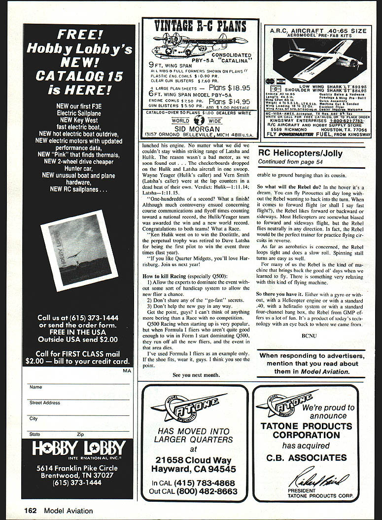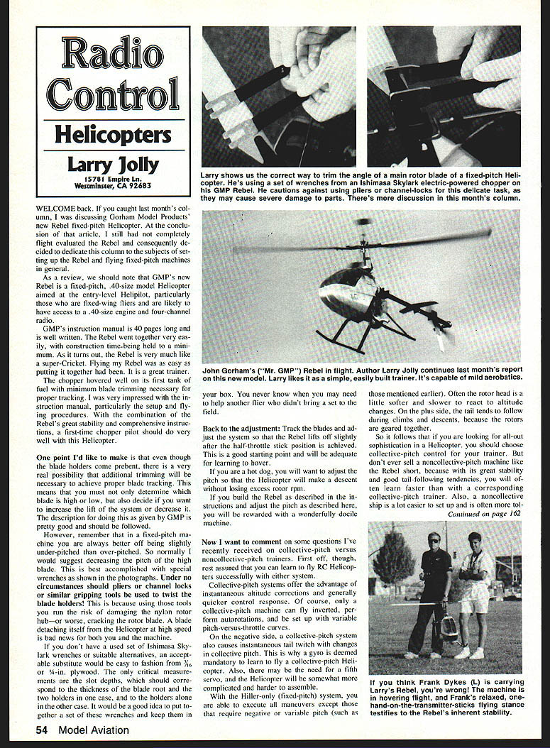 WELCOME back caught last months col umn discussing Gorham Model Products new Rebel fixed-pitch Helicopter conclu sion article still completely flight evaluated Rebel consequently de cided dedicate column subjects set ting up Rebel flying fixed-pitch machines general As review should note GMPs new Rebel fixed-pitch 40-size model Helicopter atmed entry-level Helipilot particularly fixed-wing fliers likely have access 40-size engine four-channel radio GMPs instruction manual 40 pages long well written Rebel went together very eas ily construction timebeing held mini mum As turns out Rebel very much like super-Cricket Flying Rebel easy putting together great trainer chopper hovered well its first tank fuel minimum blade trimming necessary proper tracking very impressed struction manual particularly setup fly ing procedures combination Rebels great stability comprehensive instruc tions first-time chopper pilot should very well Helicopter point Id like make though blade holders come prebent very real possibility additional trimming will necessary achieve proper blade tracking means must determine blade high low also decide want increase lift system decrease description doing given GMP pretty good should followed However remember fixed-pitch ma chine always better off being slightly under-pitched over-pitched So normally would suggest decreasing pitch high blade best accomplished special wrenches shown photographs Under no circumstances should pliers channel locks similar gripping tools used twist blade holders because using tools run risk damaging nylon rotor hubor worse cracking rotor blade blade detaching itself Helicopter high speed bad news both machine dont have used set Ishimasa Sky lark wrenches suitable alternatives accept able substitute would easy fashion Y6 A-in plywood critical measure ments slot depths should corre spond thickness blade root two holders case holders alone other case would good idea put gether set wrenches keep box never know may need help another flier didnt bring set field Back adjustment Track blades ad just system Rebel lifts off slightly after half-throttle stick position achieved good starting point will adequate learning hover hot dog will want adjust pitch Helicopter will make descent losing excess rotor rpm build Rebel described structions adjust pitch described will rewarded wonderfully docile machine Now want comment some questions Ive recently received collective-pitch versus noncollective-pitch trainers First off though rest assured can learn fly RC Helicop ters successfully either system Collective-pitch systems offer advantage instantaneous altitude corrections generally quicker control response course collective-pitch machine can fly inverted per form autorotations set up variable pitch-versus-throttle curves negative side collective-pitch system also causes instantaneous tail twitch changes collective pitch gyro deemed mandatory learn fly collective-pitch Heli copter Also may need fifth servo Helicopter will somewhat complicated harder assemble Hiller-only fixed-pitch system able execute maneuvers except require negative variable pitch such mentioned earlier Often rotor head little softer slower react altitude changes plus side tail tends follow during climbs descents because rotors geared together So follows looking all-out sophistication Helicopter should choose collective-pitch control trainer dont ever sell noncollective-pitch machine like Rebel short because its great stability good tail-following tendencies will ten learn faster corresponding collective-pitch trainer Also noncollective ship lot easier set up often tol Continued vaee 162 54 Model Aviation Radio Confrol Helicopters Larry Jolly 15781 Empire Ln Westminster CA 92683 Larry shows us correct way trim angle main rotor blade fixed-pitch Heli copter Hes using set wrenches Ishimasa Skylark electric-powered chopper GMP Rebel cautions against using pliers channel-locks delicate task may cause severe damage parts Theres discussion months column John Gorhams Mr GMP Rebel flight Author Larry Jolly continues last months report new model Larry likes simple easily built trainer Its capable mild aerobatics think Frank Dykes 1 carrying Larrys Rebel youre wrong machine hovering flight Franks relaxed onehand-on-the-transmitter-sticks flying stance testifies Rebels inherent stability VINTAI It-C FLANK CONSOLIDATED PBY-5A ttCATALINA 9 T WING SPAN AIL RIBS B FULL FORMERS SHOWN ON PLANS11 PLASrIC ENGCOWLS $090 PR CLEAR GUN BLISTERS $ 760 PR 4 LARGE PLAN SHEETS s $895 6FT WING SPAN MODEL PBY-5A ENGINE COWLS S 750 PR Plans $1495 GUN BLISTERS $550 PR ADD $300 POSTAGE CATALOGOVER SOPLANS $100 DEALERS WRITE WORLDWIDE SID MORGAN 13157 ORMOND BELLEVILLE 48111 USA lunched engine No matter what did couldnt stay within striking range Latsha Hulik reason wasnt bad motor soon found out eckerboards dropped Hulik Latsha aircraft swoop Wayne Yeager Huliks caller Vein Smith Latshas caller lap counters dead heat own Verdict Hulik1ll14 Latshall1 15 One-hundredths second What finish Although much controversy ensued concerning course communications flyoff times counting toward national record Hulik/Yeager team awarded win new world record Congratulations both teams What Race Ken Hulik went win Doolittle perpetual trophy retired Dave Latsha being first pilot win event three times last year like Quarter Midgets youll love Har risburg Join us next year kill Racing especially Q500 1 Allow experts dominate event out some sort handicap system allow new flier chance 2 Dont share go-fast secrets 3 Dont help new guy way Get point guys cant think anything boring Race no competition Q500 Racing starting up very popular Formula fliers arent quite good enough win Form start dominating Q500 run off new fliers event area dies Ive used Formula fliers example shoe fits wear guys think see point See next month HAS MOVED INTO LARGER QUARTERS 21 658 Cloud Way Hayward CA 94545 CAL 415 783-4868 Out CAL 800 482-8663 RC Helicopters/Jolly Continue