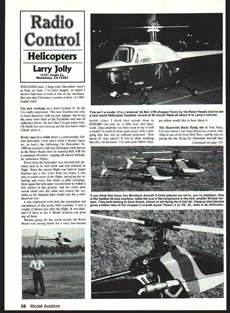 WELCOME back hope December wasnt busy Ive hoppin much havent time look machines now Christmas vacation its Hel icopter time Im now working Kalt Cyclone II So far Im really impressed new Cyclone attractive its new canopy has same rotor head Excalibur tons collective throw So now Ive got some time Ill finish new bird up let know what think about once theres newsworthy fullsize helicopter event think should report heres following December 16 1989 exclusive full-size helicopter club known Rotor Heads flew its restored Bell 47B sustained 50 hours topping known helicop ter endurance flights hour helicopter hovered po sition next its fuel truck refueled flight Since record flight held Angel Stadium just few miles home able watch some flight including re fueling four hours pilot exchange again helicopter hovered within few inches ground relief pilot would climb cabin control ma chine fatigued pilot would exit welldeserved rest impressed both restoration smoothness pretty little machine took couple photos just after flight dark Ill have see Model Aviation can print Besides going world record Rotor Heads raising funds local low-income health clinic think raised close $250000not bad little over two days work Does anybody Out want try model could done quite easily dan gling fuel line onboard generator about Any takers youve done anything like let know Im sure fellow chopThe Sepulveda Basin flying site Van Nuys CA met Zane Street recent visit Zane local Heli fliers en joying day flying Miniature Aircraft SupContinued page 151 58 Model Aviation Radio Control Helicopters Larry Jolly 15781 Empire Ln Westminster CA 92683 isnt model Its restored 46 Bell 47B chopper flown Rotor Heads club set new world Helicopter Duration record 50 hours Read about Larrys column per pilots would like hear about think two Miniature Aircraft X-Cells above twins youre mistaken familiar 60-size machine the foreground new smaller 30-size ver sion both belong Zane Street shown left flying X-Cell 30 Closeup shot below gives better idea choppers overall layout Power OS 32 radio Airtronics RC Old-Timers/Mathews Continued page 147 rugged think Floyd still flying shape went service 1942 am enclosing photo scrapbook long shot taking off poor-quality shot made Baby Brownie deep dihedral tall rudder obvious thanks John Niemeyer sharing us thought letter totally re called impact model aviation young men just publicized hope readers enjoy much did Additionally isnt tunate John Floyd didnt spend hardearned dollars GHQ done unlikely would still active modelers 50-plus years later RC Helicopters/Jolly Continued page 58 ply X-Cell 30- 60-size machines hadnt seen 30 fly before enjoying watching Zanes flight stopped break troduced myself talked about ma chines Zanes X-Cell 30 weighs little over six pounds powered OS 32 uses Airtronics Spectra seven-channel radio Airtronics SG-X gyro 30 stock except swashplate decided against kits part made composite material replaced GMP unit Later Zane nice enough let have go machine X-Cell 30 hovered nicely exhibiting good stability moderate main rotor rpm flew machine few circuits found excellent re sponse controls really nice general feel machine After coming back hover engine heated up decided land Zane told X-Cell has trouble free feels OS 32 being pushed application suggested trying another fuel see fixed cooling problems Now think about might also try new SuperTi gre 34 understand MAS also sells re placement engine mount enables put 40 Helicopter can speculate feel safe assuring 40 X Cell 30 would have unbelievable performance Chicago Hobby Show agenda last monthalbeit three hours layover another flight able see enough give mini report Airtronics first call just shared flight Tim Renaud gave pre view what expect besides Hell products already market Airtronics tends market new nine-channel fully synthe sized Helicopter radio Aimed PCM l0/Futaba 1024 market radio seems have best features Ill let know find out information Hobby Dynamics new Kalt 30-size En forcer display new Kalt machine de signed Taya decidedly Concept-like some clever new features Slated mar keted Webra power plant Enforcer should have good following Again find out Ill pass Hobby Dynamics also Cyclone II Excalibur Jet Stream machines display firm also distributes JR radios Webra engine lines US talked Kevin Burner advised Kalt parts stock anyone needs parts dealer can get Kalt ma chines Hobby Dynamics Miniature Aircraft Supply nicely put gether booth highlighting its new X-Cell 30-and 40-size machines company also has Agusta 109 fuselage available its new ma chine Also new MAS can electroplate metal parts new X-Cell machine color white-and-fluorescentorange machine display memory serves rightanyway know result very nice definitely choice want ing extra touch Great Planes still selling Concepts like crazy has lots accessories Concept 30 now have three fuselages Hughes 500 Hughes 300 Bell Jet Ranger really fancy Jet Ranger will have go about getting Concept Great Planes also various OS Heli engines new Su perTigre 34 ABC new Tigre ought powerhouse Time will tell Gorham Model Products its new Rebel display abundance Chicago John Gorham shared Rebel entertaining large following As have heard now some kind split between Hirobo GMP John however declined comment instead told efforts GMP has made Americanize its line As read GMP ma chines now 100% American-made shipping Legend Elites production ap pears full steam ahead John also told working new 50-size machine De tails will follow Robbe latest version Champion new Magic Ranger display booth well manned such notables Mike Mas Jerry Hicks saw new Schluter glass ro tor blades look very good Im going have try set Mike told blades autorotations outrageous Im going apologize advance anyone failed mention quick visit took fastest tour around show Ive ever done thanks Jerry Hicks taking back OHare connecting flight Best wishes department though youll read late January its yet Christmas write Best wish
