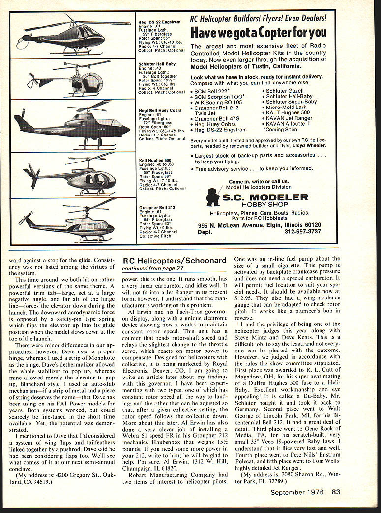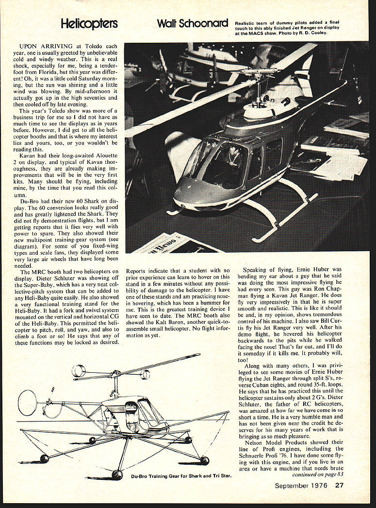 Hehcopters UPON ARRIVING Toledo year usually greeted unbelievable cold windy weather real shock especially being tender foot Florida year differ ent Oh little cold Saturday morn ing sun shining little wind blowing mid-afternoon actually got up high seventies cooled off late evening years Toledo show business trip did have much time see displays years before However did get heli copter booths interest lies yours too wouldnt reading Kavan long-awaited Alouette 2 display typical Kavan thor oughness already making im provements will very first kits should flying including time read col umn Du-Bro new 60 Shark dis play 60 conversion looks really good has greatly lightened Shark did fly demonstration flights am getting reports flies very well power spare also showed new multipoint training-gear system see diagram some fixed-wing types scale fans displayed some very large air wheels have long needed MRC booth two helicopters display Dieter Schluter showing off Super-Baby has very neat col lective-pitch system can added Heli-Baby quite easily also showed very functional training stand Heli-Baby fork swivel system mounted vertical horizontal CU Heli-Baby permitted heli copter pitch roll yaw also climb foot says functions may locked desired Reports indicate student no prior experience can learn hover stand few minutes possi bility damage helicopter have stands am practicing nosein hovering has bummer greatest training device have seen date MRC booth also showed Kalt Baron another quick-toassemble small helicopter No flight infor mation yet / / Du-Bro Training Gear Shark Tn Star Speaking flying Ernie Huber bending ear about guy said doing impressive flying seen guy Ron Chap man flying Kavan Jet Ranger does fly very impressively super smooth realistic like should opinion shows tremendous control machine also saw Bill Cur tis fly Jet Ranger very well After demo flight hovered helicopter backwards pits walked facing nose Thats far out Ill someday kills probably will too Along others privi leged see some movies Ernie Huber flying Jet Ranger through split Ss re verse Cuban eights round 35-ft loops says has practiced until helicopter sustains about 2 Us Dieter Schluter father RC helicopters amazed far have come short time very humble man has given near credit de serves years work bringing us much pleasure Nelson Model Products showed line Profi engines including Schnuerle Profi 76 have done some fly ing engine live area have machine needs brute continued page 83 September 1976 27 Realistic team dummy pilots added final touch ably finished Jet Ranger display MACS show Photo R 0 Cooley Hegi DS 22 Engstrom Engine 61 Fuselage Lgth 59 Fiberglass Rotor Span 55 Flying Wt 51/210 lbs Radio 4-7 Channel Collect Pitch Optional Schluler Hell Baby Engine 40 Fuselage Lgth 36 Bolt together Rotor Span 40 Flying Wt 6V2 lbs Radio 4 Channel Collect Pitch Cotional Hegi Bell Huey Cobra Engine 61 Fuselage Lgth 72 Fiberglass Rotor Span 60 Flying WI81/2-1 43/4 ha Radio 4-7 Channel Collect Pitch Optional Kalt Hughes 500 Engine 40 60 Fuaelage Lgth 59 Fiberglass Rotor Span 56 Flying Wt 7-10 Iba Radio 4-7 Channel Collect Pitch Optional Graupner Bell 212 Engine 61 Fuselage Lgth 55 Fiberglass Rotor Span 63 Flying Wt 9 lbs Radio 4-7 Channel Collective Pitch SChiuter Gazell SChluter Hell-Baby SChiuter Super-Baby Micro-Mold Lark KALT Hughes 500 KAVAN Jet Ranger KAVAN Alloutte II Coming Soon RC Helicopter Builders Flyers Dealers Have got Copter largest extensive fleet Radio Controlled Model Helicopter Kits Country today Now larger through acquisition Model Helicopters Tustin California Look what have stock ready instant delivery Compare what can find anywhere else SCM Bell 222* SCM Scorpion T00 WiK Boeing BO 105 Graupner Bell 212 Twin Jet Graupner Bell 47G Hegi Huey Cobra Hegi DS-22 Engstrom model built tested approved own RC Heli ex perts headed renowned builder flyer Lloyd Wheeler Largest stock back-up parts accessories keep flying Free advisory service ep informed Come write call us ftK Model Helicopters Division SC MODELER HOBBY SHOP Helicopters Planes Cars Boats Radios Parts RC Hobbiests 995 N McLean Avenue Elgin Illinois 60120 Dept312-697-3737 ward against stop glide Consist ency listed among virtues system time around both hit rather powerful versions same theme powerful trim tablarge set large negative angle far aft hinge lineforces elevator down during launch downward aerodynamic force opposed safety-pin type spring flips elevator up its glide position model slows down top launch minor differences ap proaches however Dave used proper hinge whereas used strip Monokote hinge Daves dethermalizer allowed whole stabilizer pop up whereas allowed merely elevator pop up Blanchard style used auto-stab mechanismif strip metal piece string deserves namethat Dave has using FAI Power models years Both systems worked could scarcely fine-tuned short time available Yet potential demon strated mentioned Dave Id considered system wing flaps tailfeathers linked together pushrod Dave said considering flaps too Well see what comes next semi-annual conclave address 4200 Gregory St Oak land CA 94619 RC HeliCopters/SChoonard continued page 27 power runs smooth has very linear carburetor idles well will fit Jet Ranger its present form however understand man ufacturer working problem Al Erwin Tach-Tron governor display along unique electronic device showing works maintain constant rotor speed unit has counter reads rotor-shaft speed relays slightest change throttle servo reacts motor power compensate Designed helicopters collective being marketed Royal Electronis Denver CO am going write article later about findings governor have experi menting two types has constant rotor speed way land ing other can adjusted after given collective setting rotor speed follows collective down about later Al Erwin has also done very clever job installing Webra 61 speed FR Groupner 212 mechanics Haubenbox weighs 15 pounds need some power tn 212 write him will glad help Im s