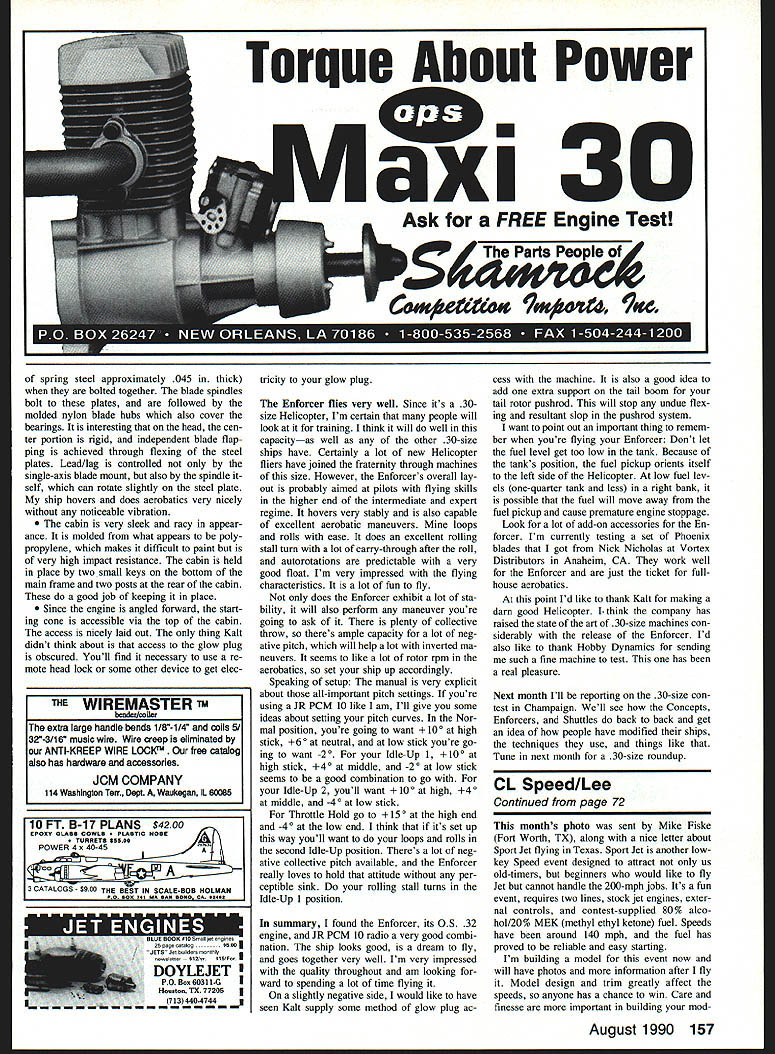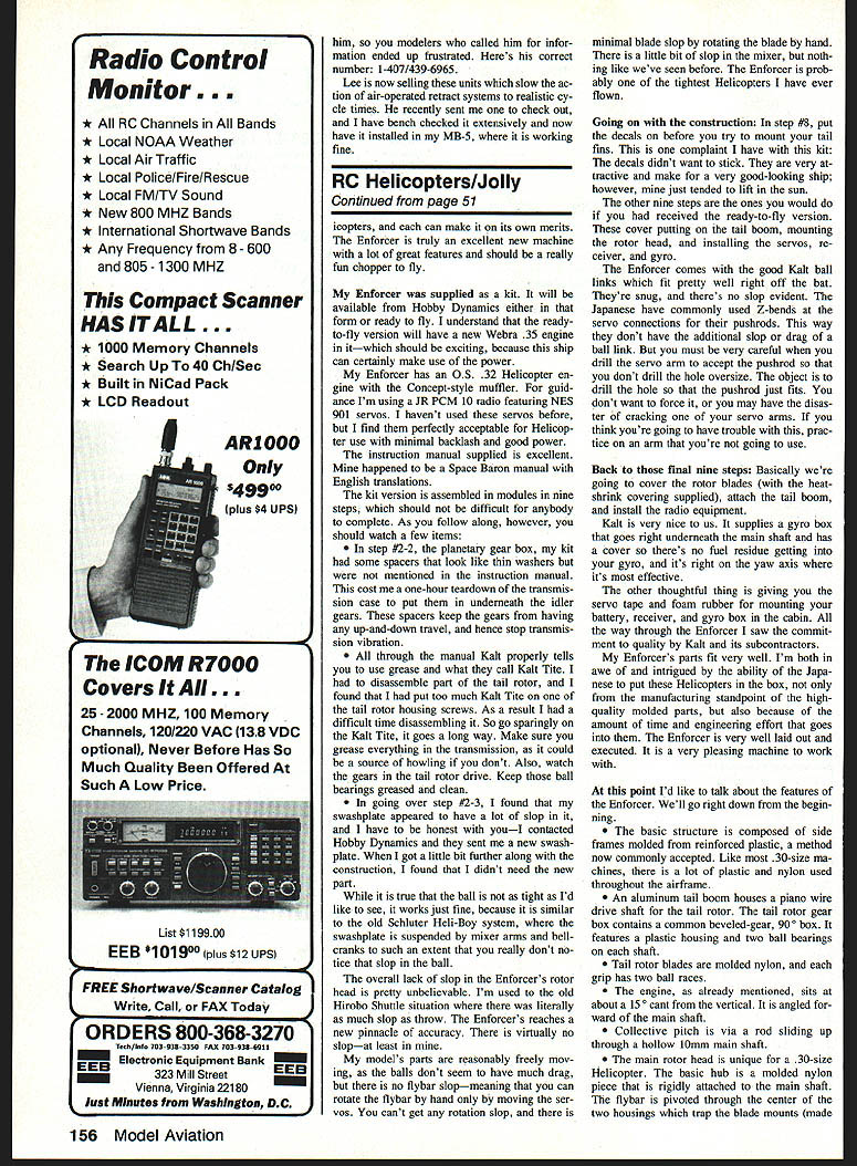 WELCOME BACK month have plea sure introducing new Helicopterthe Kalt Enforcer distributed US Hobby Dynamics Enforcer derivative Kalt Space Baron same machine some subtle differences main difference gear box the Space Baron socalled planetary design tended chatter problem traced idler gears turned plain bushing-type bearings instead ball bearings Enforcer uses needle bear ings idler gears previous trouble vibration transmission has now eliminated other difference rotor blades now produced Tech Specialities instead Kalt items what make new ma chine Enforcer Space Baron lot similarities between lat ter Kalt Helicopters Kyoshos Concept 30 main feature shared two designs originated drawing board Taya Both 30-size Helicopters lot highly sophisticated molded parts ever two machines quite different look similar parts interchangeable Enforcer certainly just another Con cept compare larger component groups two machines find Enforcers trans mission much different Con cept engine positioned forward Enforcers tail feathers Nothing unique Larry says hes never seen such unique ro Its ordinary hardware thats well made tor head other Helicopter gives model exceptionally good flying qualities has lot say about portion Kalt Enforcer column Note engines starter cone inside cir cular access hole below nearest rotor blade main shaft angled approximately 15 ward vertical big difference rotor heads have seen anything quite like the Enforcer before other machine respect Enforcer equivalent Concept SE inasmuch has ball bearings nearly everywhere Taya has done lot things differently Enforcer though Whether reason change things whether free rein Helicopter just wanted different dont know Enforcer Concept both fine Hel August 1990 51 Radio Conoi Helicopters Larry Jolly 15781 EmpIre Ln Westninster CA 92683 Larry gives us impressions new Kalt Enforcer 30-size chopper imported Hobby Dynamics Larry installed 05 32 engine JR PCM 10 radio likes Continued page 1S6 Larry really appreciates well-executed orderly way RC equipment can mounted engines unique forward-canted mounting evident Note pushrods reasonably short straight have bali joints far ends Z-bends used servo arms gyro mounts covered box down low under rotor shaft its control module sits atop servo holder 25- 2000 MHZ 100 Memory Channels 1201220 VAC 138 VDC optional Never Before Has So Much Quality Been Offered Such Low Price List $119900 EEB 101900 pIus $12 UPS FREE Shortwave/Scanner Catalog Write Call FAX Today ORDERS 800-368-3270 Td/inf 703 038-3350 FAX 703-033 6011 Elec EEB tronic Equipment Bank 323 Miii Street EEB Vienna Virginia 22180 Just Minutes Washington DC him modelers called him infor mation ended up frustrated Heres correct number 1-407/439-6965 Lee now selling units slow ac tion air-operated retract systems realistic cy cle times recently sent check Out have bench checked extensively now have installed MB-5 working fine RC Helicopters/Jolly Continued page 51 icopters can make its own merits Enforcer truly excellent new machine lot great features should really fun chopper fly Enforcer supplied kit will available Hobby Dynamics either form ready fly understand readyto-fly version will have new Webra 35 engine itwhich should exciting because ship can certainly make use power Enforcer has 05 32 Helicopter en gine Concept-style muffler guid ance Im using JR PCM 10 radio featuring NES 901 servos havent used servos before find perfectly acceptable Helicop ter use minimal backlash good power instruction manual supplied excellent Mine happened Space Baron manual English translations kit version assembled modules nine steps should difficult anybody complete As follow along however should watch few items step #2-2 planetaiy gear box kit some spacers look like thin washers mentioned instruction manual cost one-hour teardown transmis sion case put underneath idler gears spacers keep gears having up-and-down travel hence stop transmis sion vibration through manual Kalt properly tells use grease what call Kalt Tite disassemble part tail rotor found put too much Kalt Tite tail rotor housing screws As result difficult time disassembling So go sparingly Kalt Tite goes long way Make sure grease everything transmission could source howling dont Also watch gears tail rotor drive Keep ball bearings greased clean going over step #2-3 found swashplate appeared have lot slop have honest youI contacted Hobby Dynamics sent new swash plate got little bit further along construction found didnt need new part true ball tight Id like see works just fine because similar old Schluter Heli-Boy system swashplate suspended mixer arms bellcranks such extent really dont no tice slop ball overall lack slop Enforcers rotor head pretty unbelievable Im used old Hirobo Shuttle situation literally much slop throw Enforcers reaches new pinnacle accuracy virtually no slopat least models parts reasonably freely mov ing balls dont seem have much drag no flybar slopmeaning can rotate flybar hand moving ser vos cant get rotation slop minimal blade slop rotating blade hand little bit slop mixer noth ing like weve seen before Enforcer prob ably tightest Helicopters have ever flown Going construction step #8 put decals before try mount tail fins complaint have kit decals didnt want stick very tractive make very good-looking ship however just tended lift sun other nine steps ones would received ready-to-fly version cover putting tail boom mounting rotor head installing servos re ceiver gyro Enforcer comes good Kalt ball links fit pretty well right off bat Theyre snug theres no slop evident Japanese have commonly used Z-bends servo connections pushrods way dont have additional slop drag ball link must very careful drill servo arm accept pushrod dont drill hole oversize object drill hole pushrod just fits dont want force may have disas ter cracking servo arms think youre going have trouble prac tice arm youre going use Back final nine steps Basically going cover rotor blades heatshrink covering supplied at