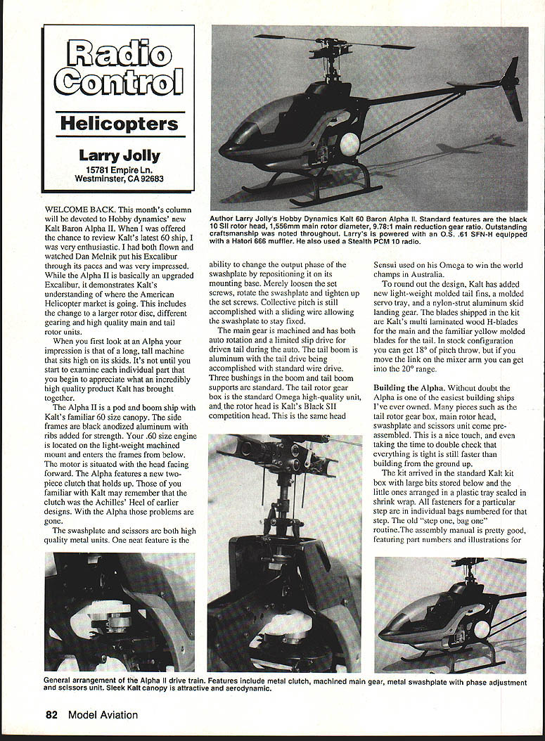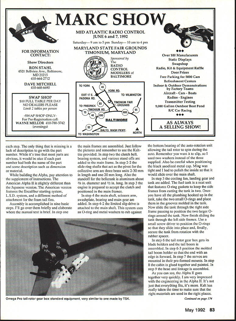 WELCOME BACK months column will devoted Hobby dynamics new Kalt Baron Alpha II offered chance review Kalts latest 60 ship very enthusiastic both flown watched Dan Melnik put Excalibur through its paces very impressed Alpha II basically upgraded Excalibur demonstrates Kalts understanding American Helicopter market going includes change larger rotor disc different gearing high quality main tail rotor units first look Alpha impression long tall machine sits high its skids Its until start examine individual part begin appreciate what incredibly high quality product Kalt has brought together Alpha II pod boom ship Kalts familiar 60 size canopy side frames black anodized aluminum ribs added strength 60 size engine located light-weight machined mount enters frames below motor situated head facing forward Alpha features new twopiece clutch holds up familiar Kalt may remember clutch Achilles Heel earlier designs Alpha problems gone swashplate scissors both high quality metal units neat feature ability change output phase swashplate repositioning its mounting base Merely loosen set screws rotate swashplate tighten up set screws Collective pitch still accomplished sliding wire allowing swashplate stay fixed main gear machined has both auto rotation limited slip drive driven tail during auto tail boom aluminum tail drive being accomplished standard wire drive Three bushings boom tail boom supports standard tail rotor gear box standard Omega high-quality unit rotor head Kalts Black 811 competition head same head Sensui used Omega win world champs Australia round Out design Kalt has added new light-weight molded tail fins molded servo tray nylon-strut aluminum skid landing gear blades shipped kit Kalts multi laminated wood H-blades main familiar yellow molded blades tail stock configuration can get 180 pitch throw move link mixer arm can get 20 range Building Alpha Without doubt Alpha easiest building ships Ive ever owned pieces such tail rotor gear box main rotor head swashplate scissors unit come pre assembled nice touch taking time double check everything tight still faster building ground up kit arrived standard Kalt kit box large bits stored below little ones arranged plastic tray sealed shrink wrap fasteners particular step individual bags numbered step old step bag routineThe assembly manual pretty good featuring part numbers illustrations General arrangement Alpha II drive train Features include metal clutch machined main gear metal swashplate phase adjustment scissors unit Sleek Kalt canopy attractive aerodynamic 82 Model Aviation Helicopters Larry Jolly 15781 Empire Ln Westminster CA 92683 Author Larry Jollys Hobby Dynamics Kalt 60 Baron Alpha II Standard features black lOSII rotor head 1556mm main rotor diameter 9781 main reduction gear ratio Outstanding craftsmanship noted throughout Larrys powered OS 61 SFN-H equipped Hatori 666 muffler also used Stealth PCM 10 radio Show Directors RON STAHL 4521 Bellvieu Ave Baltimore MD 21215 410-664-2712 DAVE MITCHELL 410-668-6690 step thing missing lack description go part number its true parts obvious would nice part number both name part some description such dimension material building Alpha pay attention supplement instructions American Alpha II slightly different Japanese version American version features Excalibur starting system LSD system different method attachment foam tail fins Assembly accomplished nine basic steps Ill go over briefly elaborate manual text brief step Sponsored RADIO CONTROL MODELERS BALTIMORE PADONIA RD TO FREDRICKGROUNDS TIMONIUM RD95 BALTIMORE BALTO WASH PKWYA TO WASHINGTONNORTH main frames assembled Just follow pictures remember use Kalt tite provided step two clutch bell bearing system various stand offs added main frame step 2-2 slide ring shafts act pivot collective arm three brass units 2-30 mm length 20 mm long Also standoff bellcrank aluminum about 3/g diameter /2 long step 3 engine prepared accept clutch positioned main frames step 4 main shaft scissors arm swashplate bearing main gear added step 4-2 limited slip drive attached main shaft system uses 0-ring metal washers rub against Over 100 Manufacurers Static Displays Swapshop Radio Kit & Equipment Raffle Door Prizes Free Parking 5000 Cars Refreshment Centers Indoor & Outdoor Demonstrations Factory Teams Aircraft Cars Boats Radios Engines Transmitter Testing 9000 Gallon Outdoor Boat Pond K/C Car Racing AS ALWAYS SELLING SHOW bottom bearing auto-rotation unit allowing tail rotor spin during auto Remember want slip used two washers instead three supplied Also careful positioning black anodized metal cap Mine tight polish inside would slide over main shaft step 5 cooling fan landing gear tank added fuel tank neat unit features 0-ring gaskets keep side frames cutting tank two Once have plumbing hooked up tank take two small 0-rings place grooves molded tank Now slide tank through right side frame pausing position two larger 0rings around tank Now finish sliding tank through left side frames Use small screw driver position 0-rings slide place finally secure tank rotation rubber spacer step 6 tail rotor gear box gets its blade holders tail boom assembled step 6-3 position molded tail boom holder end edge forward step 7 servos mounted pre-formed mounts step 8 cabin glued together painted step 9 head linkage assembled As can see Alpha II goes together very quickly am very impressed engineering Alpha II Its just everything fits its Kalt has really taken time make sure right materials used right places Continued page 174 May 1992 83 FOR INFORMATION CONTACT MARC SHOVAY MID ATLANTIC RADIO CONTROL JUNE 6 7 1992 Saturday 9 am 5 pm Sunday 10 am 4 pm MARYLAND STATE FAIR GROUNDS TIMONIUM MARYLAND C SWAP SHOP $10 FULL TABLE PER DAY NO DEALERS PLEASE Limit 2 tables per person -SWAP SHOP ONLYFor Pre-Registration call WAYNE MELLOR 410-788-3742 evenings Omega Pro tail rotor gear box standard equipment very similar made TSK C-130 HERKY-BIRD 130118 Wingspan515 Wing area 87 272aq 752aq