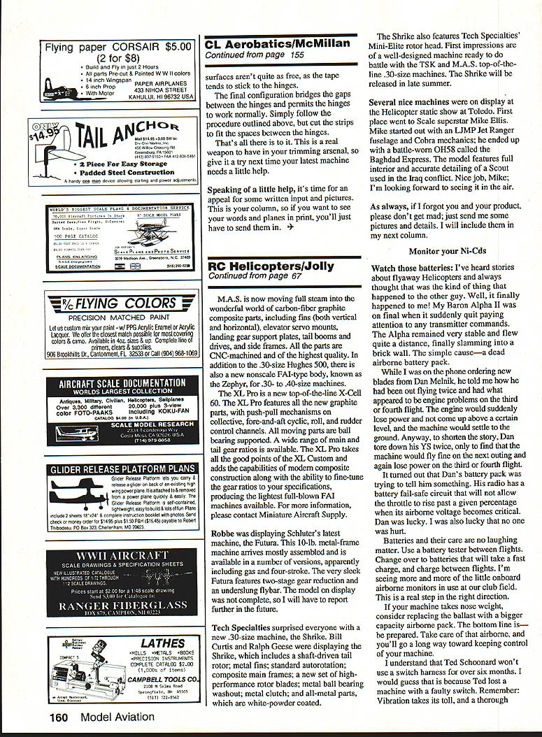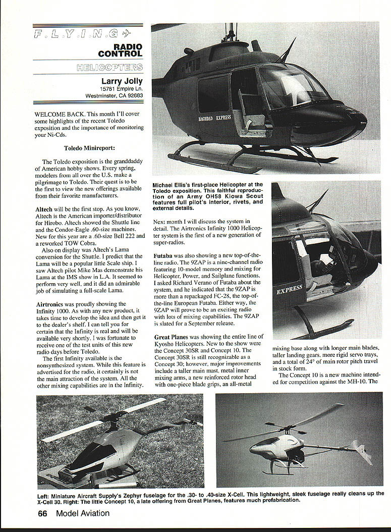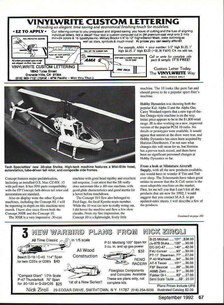 RADIO CONTROL Larry Jolly 15781 Empire Ln Westminster CA 92683 WELCOME BACK month Ill cover some highlights recent Toledo exposition importance monitoring Ni-Cds Toledo Minireport Toledo exposition granddaddy American hobby shows spring modelers over US make pilgrimage Toledo quest first view new offerings available favorite manufacturers Altech will first stop As know Altech American importer/distributor Hirobo Altech showed Shuttle line Condor-Eagle 60-size machines New year 60-size Bell 222 reworked TOW Cobra Also display Altechs Lama conversion Shuttle predict Lama will popular little Scale ship saw Altech pilot Mike Mas demonstrate Lama IMS show LA seemed perform very well did admirable job simulating full-scale Lama Airtronics proudly showing Infinity 1000 As new product takes time develop idea get dealers shelf can tell certain Infinity real will available very shortly fortunate receive test units new radio days before Toledo first Infinity available nonsynthesized system feature advertised radio certainly main attraction system other mixing capabilities Infinity Next month will discuss system detail Airtronics Infinity 1000 Helicop ter system first new generation super-radios Futaba also showing new top-of-theline radio 9ZAP nine-channel radio featuring 10-model memory mixing Helicopter Power Sailplane functions asked Richard Verano Futaba about system indicated 9ZAP repackaged FC-28 top-ofthe-line European Futaba Either way 9ZAP will prove exciting radio lots mixing capabilities 9ZAP slated September release Great Planes showing entire line Kyosho Helicopters New show Concept 305R Concept 10 Concept 305R still recognizable Concept 30 however major improvements include taller main mast metal inner mixing arms new reinforced rotor head one-piece blade grips all-metal mixing base along longer main blades taller landing gears rigid servo trays total 240 main rotor pitch travel stock form Concept 10 new machine intend ed competition against MH-l0 Left Miniature Aircraft Supplys Zephyr fuselage 30- 40-size X-Cell lightweight sleek fuselage really cleans up X-Cell 30 Right little Concept 10 late offering Great Planes features much prefabrication 66 Model Aviation Michael Elliss first-place Helicopter Toledo exposition faithful reproduc tion Army 0H58 Kiowa Scout features full pilots interior rivets external details VINYLWRITE CUSTOM LElTERING Providing elegant time saving economical finishing touch modelers U TO APPLY Our lettering comes prespaced aligned-saving hours cutting fuss aligning individual letters decal text custom computer cut 3M premium cast vinyl 2 mils PEEL PROTYCilVO RACEIWO thin24 colors & 15 typestylesinc MilitaryBlock1/4to 12 highStencil Mask color outliningas well stars symbols & much pricea can easily affordll PUCE OR YOUR SURFACEPEEL 0FF ThE CARRIER TAPE ARC ft US MOfdmptOChSAdApUfiFFCAAMA VINYLWRITE CUSTOM LElTERING 16043 Tulsa Street Granada Hills CA 91344____________________ 818 363-7131_10AM_- 4PM_Pacific Mon_thru_Thur_____________________________________________[v33][b204780618397040]] example AMA ec 1/2 high Sl25 1 high $2252 high $325 S150 P&H CA res add tax Sn RACE AUMIRE YOUR WORECall write complete info YOU RU DOREpack & sample ITS FREE ai Custom Letter Today VINYLWRITE Way MAIL ORDER ONLY Concept features major prefabrication including installed 05 Max CZ-HX 15 pull start has 50% parts compatibility EP Concept belt-driven tail rotor autorotation standard Also display other Kyosho machines including Concept 60 will reporting depth machine next month have also since flown both Concept 305R Concept 10 305R very impressive 30-size machine good head rigidity excellent tail response can attest SR really does autorotate like 60-size machine good glide characteristics good inertia hover before touchdown Concept 101 flew also belonged Fred Sage local Kyosho team member 10 too new really wring out did hover machine flew few slow circuits first impression Concept 10 lightweight lively little machine 10 looks like pure fun should prove popular sport fliers machine Hobby Dynamics showing both popular Kalt Alpha II Alpha Gas Carey Woolard reports new top-of-theline Omega-style machine way Initial price appears $1800 retail range JR also working new improved version popular PCM 10 radio No details prototypes available would appear rumors show true Hobby Dynamics has since acquired Horizon Distributors Im sure what changes will mean us Horizon has proven track record have no significant personnel changes Hobby Dynamics far look Miniature Aircraft Supply new products available would have wonder Tim Ted ever sleep Schoonards have taken great strides ensure X-Cell series adaptable machine market First let tell cant list products new 1992 would suggest contact MAS get updated sales sheets will describe few products Continued page 160 3 jI~YI ~O Time Classic in 1/5 scale Wood Beech D-18/C-45 114 spanConstruction twin 035s G38s $40 Compact Giant 1/7th Scale P-47 Thunderboh 70 Span 90-120 G-23/Q35 $25 1st New Series P-51 Mustang 100 Span 3 cu up gas power $32 RENO RACER! Fiberglass Components Canopies Available plans complete kits Plans Prices Include UPS Nick Ziroli 29 EDGAR DRIVE SMITHTOWN N Y 11787 516 234-5038 Illustrated Catalog $200 September 1992 67 Tech Specialties new 30-size Shrike High-tech machine features Mini-Elite head autorotation tube-driven tail rotor composite side frames B-25 Mitchell101 .$3800 Ju-87B Stuka100 3000 DC-3/C-47140 4200 F4U Corsair93 3000 PT-i 7 Stearman 77 P-40 Warhawk 000 AT-6 Texan 1 3000 F8F Bearcat86 3000 A6M5 Zero91 3000 Fokker Dr-I63 2700 Semi Scale Taube88.25O0 Mail 91455300 se Div-OrAl Marine Inc 450 WillOw Crossing 00 jLAIL ANCH Greensburo PAlSOOl 412837-5150 FAX 412-8345161 2 Piece Easy Storage Padded Steel Construction handy oil man device allowing ste4rng power adjustments Antiques_Military Civilian Hetlooptera SalipianasI Over 3300 different20000 pius 3-viewI Color FOTO-PAAKSIncluding KOKU-FAN CATALO6 $404 USA CL AerobaticslMcMil