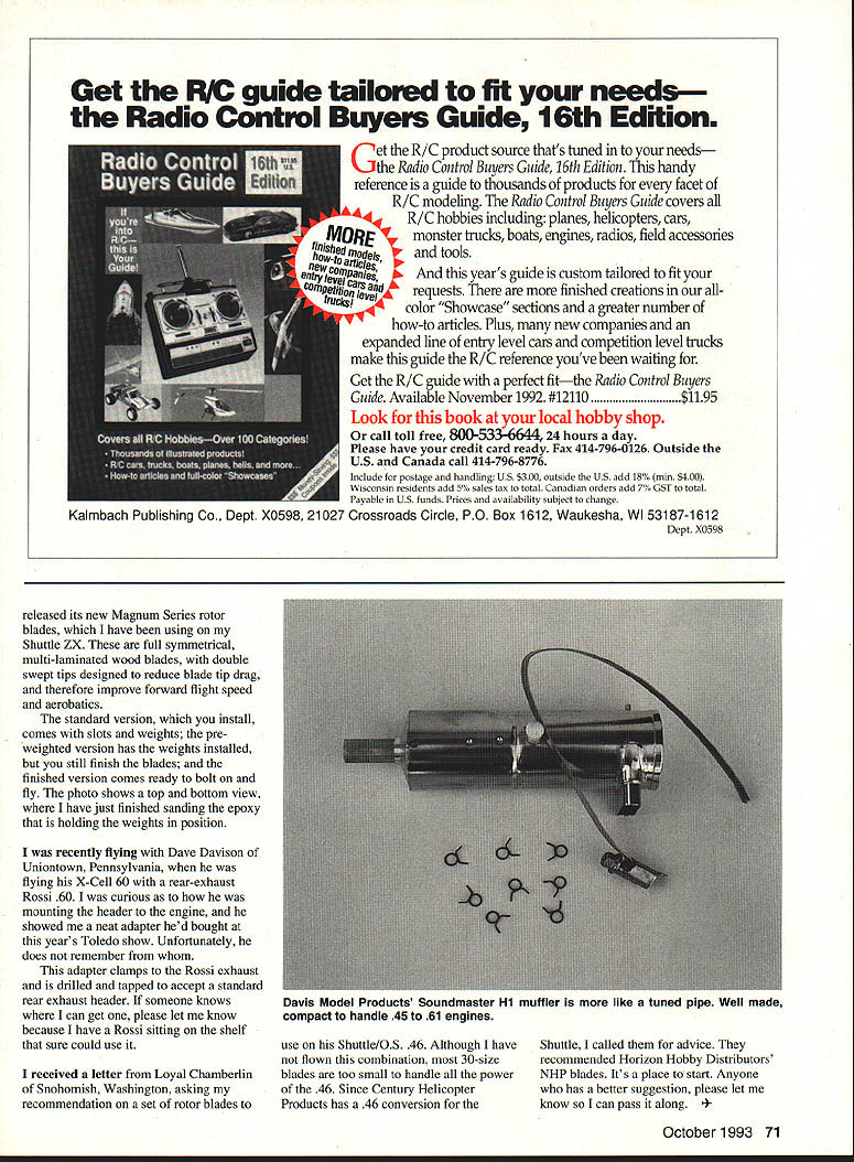 RADIO CONTROL HELICOPTERS iiTi IN THE SEPTEMBER ISSUE MA talked about using computer heli radio set up straight-line pitch curve once have determined high low pitch end points However measuring high low end points requires use pitch gauge put another way helicopter fly designed personal desires pitch gauge enables set pitch angle attack rotor blades whatever position range desire must set correctly within certain limits Although several pitch gauges market sometimes its difficult determine best recommend both easy use gives repeatable results Notice did say has accurate First have no way knowing pitch gauges accurate just take reading assume manufacturers have made gauge correctly say gauge accurate another depends largely manufacturing process cannot evaluate Plus will see later accuracy readings depends gauge also level flybar swashplate well visually align everything about later two pitch gauges easy use give repeatable results reason ably priced made Miniature Aircraft other Kalt Both slip blade easily easy align visually have large easy-to-read numbers Some others complicated require levels hold gauge position very easy use flying field overall accuracy isnt better Whatever pitch gauge use its important follow least few basic principles get accurate repeatable readings First recommend placing gauge rotor blade near root rather tip its easier line up make sure flyhar swashplate level parallel before readings taken Kalt Cyclone II helicopter shown photos notice swashplate flybar parallel level perpen dicular main shaft Once accomplished Kalt pitch gauge may adjusted top surface again parallel flybar pitch reading degrees taken directly Kalt gauge Kalt gauge also has convenient knob locks gauge particular setting linkage adjustments can made quickly set desired pitch particularly useful initial setups manufacturers recommendations whether maximum pitch minimum pitch hover pitch just check overall range pitch movement photo can also see said accuracy gauge less important its ease use repeatability results Although human eye very accurate appears photo swashplate flybar level aligned no way absolutely sure either slightly off pitch readings gauge will inaccurate means readings taken gauge probably within 10 accuracy range work thats fine Remem ber initial setup just get blades proper flying range further adjustments made once see helicopter performs advent new computer radios has made much easier make further pitch adjustments flying fieldand almost flying helicopter Its certainly uncommon make short flight land engine idle use pitch-curve function radio make slight adjustment fly again see results case pitch gauge used make adjustment once helicopter does fly perform satisfaction gauge can used record particular pitch settings helicopter can set up again after maintenance repairs etc Another use pitch gauge flying field compare two helicopters pitch flying characteristics someone has similar helicopter flying well would easy see what pitch settings adjust machine accordingly would least place start another reason whatever gauge choose should easy use flying field recently bad chance use Soundmaster Hl muffler Davis Model Products DMP Box 141 Milford CT 06460 very impressed its performance As can see photo looks like ordinary cylindrical muffler pressure tap performs like tuned pipe quiet its light weight made almost entirely alloy steel nickel plated heat resistance its really strong helicopter applications little pin muffler opposite intake used hold metal hose clamp place assuring secure mount wont come loose under vibration Also pictured DMPs new Clip heat-tempered stainless steel fuel tubing safety clamps Yale Hobby Inc 2300 NW Corporate Blvd Suite 145 Boca Raton FL 33431 has 70 Model Aviation Kalt pitch gauge lined up flybar blade pitch read directly gauge See text Yale Hobbys Magnum Series symmetrical multilaminated rotor blades have doubleswept tips reduce tip drag released its new Magnum Series rotor blades have using Shuttle ZX full symmetrical multi-laminated wood blades double swept tips designed reduce blade tip drag therefore improve forward flight speed aerobatics standard version install comes slots weights pre weighted version has weights installed still finish blades finished version comes ready bolt fly photo shows top bottom view have just finished sanding epoxy holding weights position recently flying Dave Davison Uniontown Pennsylvania flying X-Cell 60 rear-exhaust Rossi 60 curious mounting header engine showed neat adapter hed bought years Toledo show Unfortunately does remember adapter clamps Rossi exhaust drilled tapped accept standard rear exhaust header someone knows can get please let know because have Rossi sitting shelf sure could use received letter Loyal Chamberlin Snohomish Washington asking recommendation set rotor blades use Shuttle/OS 46 Although have flown combination 30-size blades too small handle power 46 Since Century Helicopter Products has 46 conversion Shuttle called advice recommended Horizon Hobby Distributors NHP blades Its place start Anyone has better suggestion please let know can pass along ber1993 71 Get ftC guide tailoied fit needs-the Radio Control Buyers Guide 16th Edition et R/C product source thats tuned needs CIthe Radio Control Buyers Guide 16th Edition handy reference guide thousands products facet R/C modeling Radio Control Buyers Guide covers C hobbies including planes helicopters cars onster trucks boats engines radios field accessories A44\ R/ d tools years guide custom tailored fit requests finished creations allcolor Showcase sections greater number how-to articles Plus new companies expanded line entry level cars competition level trucks make guide R/C reference youve waiting Get R/C guide perfect fitthe Radio Control Buyers Guide Available November 1992 #12110$1195 Look book local hobby shop call toll free 800-533-6644 24 hours day Please have credit card ready Fax 414-796-0126 Outside US Canada call 414-796-8776 Include
