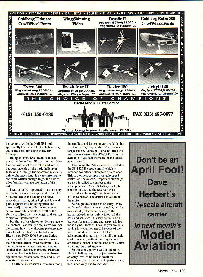 RADIO CONTROL HELICOPTERS JTWI U ONE OF THE NICE things about being helicopter enthusiastand main reason continue write columnis help given received others hobby Ive modeling years care admit helicopters past 12 years never have came close knowing seems always someone out has little different way doing something neat new idea Its always pleasure hear such person can pass infonnation along Helicopter Wings such idea came recently letter Michael Homic Austin Texas seems Michael has hovering process two years did feel comfortable progressing forward flight having help Michaels hovering advanced could figure eights 50 feet front day long stand center circle fly helicopter around 100- 150-foot circles near hover high speed yet could break last barrier fact hovering swooping skills getting advanced point pilots didnt realize couldnt perform forward flight Mike now crossroads helicopter flier has either faced will face near future make transition hovering forward flight maximize success minimizing chance hurting much-loved helicopter have actually seen fliers Mikes position still training gear firmly attached helicopter Training gear may help keep oriented helicopter gets further away believe training gear mainly security blanket discarded After giving lot thought Mike came up middle-of-the-road solution replaces training gear something else keep flier oriented helicopter Michaels idea replace training gear six-foot aluminum flagpolethe kind comes $599 flag kits Its easy transport because comes two sections Michael painted white red blue tip orientation mounted skids rubber bandswith red tip rightcreating highly-visible wing prevents disorientation practices forward flight Michael states first flight just like Id returned old trusty high-wing trainer airplane third flight making inside turns before realized what doing flying buddies completely dumbfounded week Im off hovering corner next Im standing normal pilots position flying standard aircraft traffic pattern As proficiency comfort level increases plan gradually shorten wing until ceases exist sounds like great idea especially have flown airplanes decide give Mikes idea try please let know works you have ideas make better Bulls Eye Rotor Disk Another technique staying oriented helicopter increasing its visibility distant flight turn top portion rotor disk bulls eye 60-size helicopters white blades cut black covering material MonoKote etc three-inch strips put piece blade tipleaving three inches regular white bladeand add another three-inch black strip Just attach black strips top blade trimming along trailing edge wrapping about around leading edge keep air picking up produces black white bulls eye top rotor disk easy see normally harder-to-see plain white rotor disk bottom Now see bulls eye flight know rotor disk tilted toward visible distance care fly Focus Heli 5E Radio Hitec RCD Inc 10729 Wheatlands Ave Suite C Santee CA 92071 has recently released Focus Heli 5 FM radio designed entry-level radio performance reliability expensive radios available two versions Heli 5 engine-powered 108 Model Aviation stment pots slide switches readily available New Supreme Series receiver electronic speed control Focus Hell 5 transmitters lower front bottom HS-80 microservo small size big quality Focus Hell 5E transmitter back basics provides functions needed basic helicopter flying Goklberg Ultimate CowV Wheel Pants WingSldnning efiollGoldbergExtra 300 Wingspan 6&5 WgIt 855 lbsGoUi Pants lMbtn Aran RAA FNC*Iin 1 9fl Fresn ure 11Desire 120ej Wing Span 68 WeIgit 85-95 lbs Wing Span W WIgt 85-90 lbs Wing Span 70 WeIgit 85-95 lbs Wing AiOa 9X sq h-i Engine 120 Wing Moo 940 sq h-i Engine 120 Wing AMa 860 sq h-i Eni 120 Please send $100 Catalog 615 455-0735 FAX 615 455-0677 rJ UlbldhI 1 215 Bi Springs Avenue homa TN 37388 helicopters Hell SE sold specifically use Electric helicopters am using EP Concept Being entry-level radio modest price Focus Heli 5E does intimidate user lot switches knobs does provide basic helicopter functions Although operation manual eight pages long its very informative well-written enough get novice pilot familiar operation radio actually impressed see helicopter features incorporated Heli 5E radio include up down revolution mixing pitch high low end point adjustments hovering pitch throttle adjustments aileron elevator servo throw adjustments well ability adjust stick length tension suit particular feel us enjoy flying Electric helicoptersespecially now wait spring thawthe airborne package also has lot nice features Included Hitecs new RCD 3000 Supreme Series receiver improvement over popular Bullet Proof receivers dual-conversion eight-channel receiver smaller seven channel Platinum receivers has tighter adjacent channel rejection greater sensitivity less sensitive vibration HS-80 microservos use among smallest fastest servos available still have very respectable 32 inch-ounce torque rating Although have tried metal-gear version HS-8OMG available feel need added gear strength Focus Heli 5E version also includes SP- 1803 H speed control intended either helicopters airplanes compact variable-speed controller have seen Proper adapter plugs also installed connect helicopters 6- 96-volt battery pack electric motor receiver Also prewired on/off switch start button prevent accidental activation motor Although Focus 5 entry-level moderately priced radio system gives same solid performance higher-priced radios bells whistlesThis may actually big plus fliers especially flying Electrics because paying what need Because limited performance Electric helicopters radio provides basic control needed wasting money advanced electronic mixing circuits would used anyway So would like try Electric helicopters just looking entry-level radio small complexity large basic performance certainly consider 4March 1994 109 0 q 4 S Extra 300 Wing Span 62 WIgit 95-100 lbs Wing Alga 965sq Enw 60 0 0