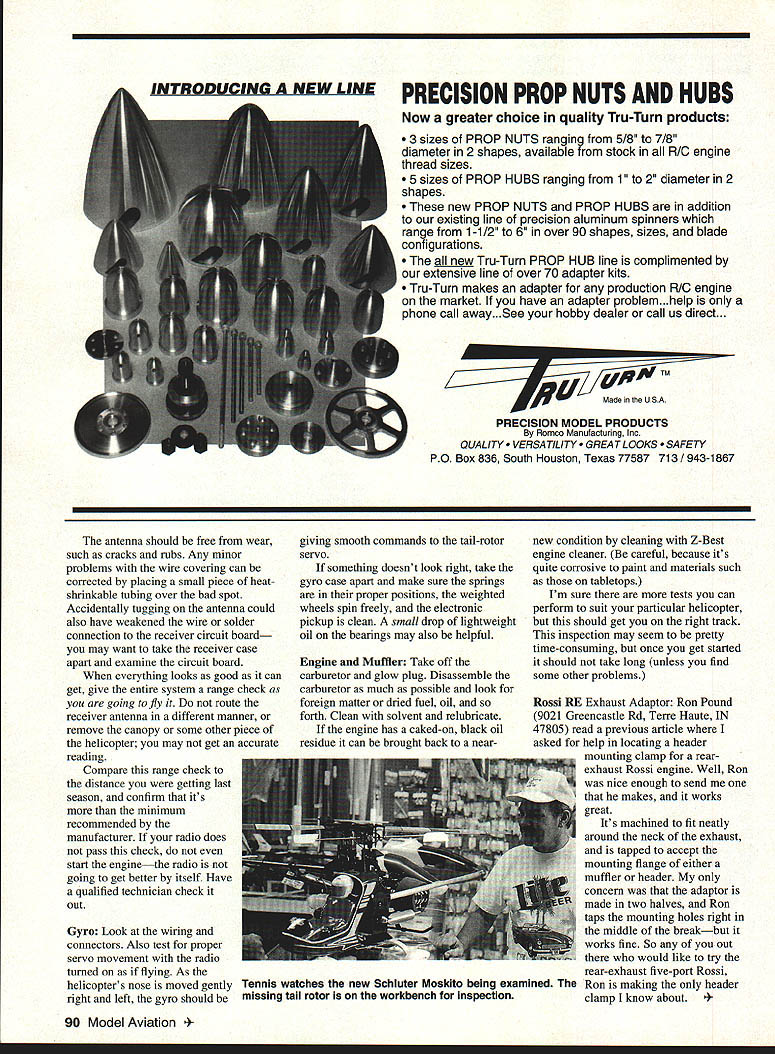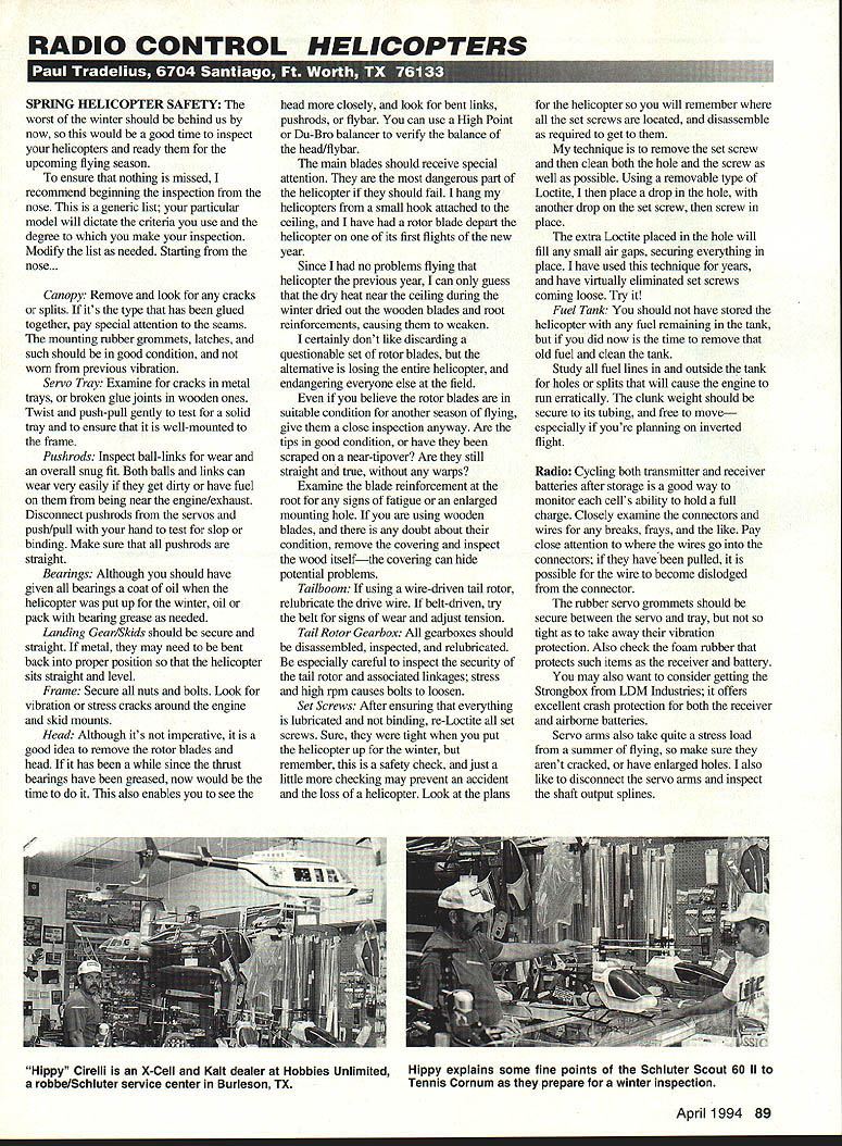 RADIO CONTROL HELICOPTERS U n-I-I SPRING HELICOPTER SAFETY worst winter should behind us now would good time inspect helicopters ready upcoming flying season ensure nothing missed recommend beginning inspection nose generic list particular model will dictate criteria use degree make inspection Modify list needed Starting nose. Canopy Remove look cracks splits its type has glued together pay special attention seams mounting rubber grommets latches such should good condition worn previous vibration Servo Tray Examine cracks metal trays broken glue joints wooden ones Twist push-pull gently test solid tray ensure well-mounted frame Pushrods Inspect ball-links wear overall snug fit Both balls links can wear very easily get dirty have fuel being near engine/exhaust Disconnect pushrods servos push/pull hand test slop binding Make sure pushrods straight Bearings Although should have given bearings coat oil helicopter put up winter oil pack bearing grease needed Landing Gear/Skids should secure straight metal may need bent back proper position helicopter sits straight level Frame Secure nuts bolts Look vibration stress cracks around engine skid mounts Head Although its imperative good idea remove rotor blades head has since thrust bearings have greased now would time also enables see head closely look bent links pushrods flybar can use High Point Du-Bro balancer verify balance head/flybar main blades should receive special attention dangerous part helicopter should fail hang helicopters small hook attached ceiling have rotor blade depart helicopter its first flights new year Since no problems flying helicopter previous year can guess dry heat near ceiling during winter dried out wooden blades root reinforcements causing weaken certainly dont like discarding questionable set rotor blades alternative losing entire helicopter endangering everyone else field believe rotor blades suitable condition another season flying give close inspection anyway Are tips good condition have scraped near-tipover Are still straight true warps Examine blade reinforcement root signs fatigue enlarged mounting hole using wooden blades doubt about condition remove covering inspect wood itselfthe covering can hide potential problems Tailboom using wire-driven tail rotor relubricate drive wire belt-driven try belt signs wear adjust tension Tail Rotor Gearbox gearboxes should disassembled inspected relubricated especially careful inspect security tail rotor associated linkages stress high rpm causes bolts loosen Set Screws After ensuring everything lubricated binding re-Loctite set screws Sure tight put helicopter up winter remember safety check just little checking may prevent accident loss helicopter Look plans helicopter will remember set screws located disassemble required get technique remove set screw clean both hole screw well possible Using removable type Loctite place drop hole another drop set screw screw place extra Loctite placed hole will fill small air gaps securing everything place have used technique years have virtually eliminated set screws coming loose Try Fuel Tank should have stored helicopter fuel remaining tank did now time remove old fuel clean tank Study fuel lines outside tank holes splits will cause engine run erratically clunk weight should secure its tubing free move especially youre planning inverted flight Radio Cycling both transmitter receiver batteries after storage good way monitor cells ability hold full charge Closely examine connectors wires breaks frays like Pay close attention wires go connectors have pulled possible wire become dislodged connector rubber servo grommets should secure between servo tray tight take away vibration protection Also check foam rubber protects such items receiver battery may also want consider getting Strongbox LDM Industries offers excellent crash protection both receiver airborne batteries Servo arms also take quite stress load summer flying make sure aren t cracked have enlarged holes also like disconnect servo arms inspect shaft output splines April 1994 89 Hippy Cirelli X-Cell Kalt dealer Hobbies Unlimited Hippy explains some fine points Schluter Scout 60 II robbelSchluter service center Burleson TX Tennis Cornum prepare winter inspection INTPflflhIflIMfl NEW LINE PRECISION PROP NUTS AND HUBS Now greater choice quality Tru-Turn products 3 sizes PROP NUTS ranging 5/8 7/8 diameter 2 shapes available stock RIG engine thread sizes 5 sizes PROP HUBS ranging 1 2 diameter 2 shapes new PROP NUTS PROP HUBS addition existing line precision aluminum spinners range 1-1/2 6 over 90 shapes sizes blade configurations new Tru-Turn PROP HUB line complimented extensive line over 70 adapter kits Tru-Turn makes adapter production RIG engine market have adapter problem. help phone call away. See hobby dealer call us direct. upjtf TM Rd Made U S PRECISION MODEL PRODUCTS Romco Manufacturing Inc OUALITY VERSA TILITY T LOOKS TY PO Box 836 South Houston Texas 77587 713/ 943-1867 antenna should free wear such cracks rubs Any minor problems wire covering can corrected placing small piece heatshrinkable tubing over bad spot Accidentally tugging antenna could also have weakened wire solder connection receiver circuit board may want take receiver case apart examine circuit board everything looks good can get give entire system range check going fly route receiver antenna different manner remove canopy some other piece helicopter may get accurate reading Compare range check distance getting last season confirm its minimum recommended manufacturer radio does pass check start enginethe radio going get better itself Have qualified technician check out Gyro Look wiring connectors Also test proper servo movement radio turned flying As helicopters nose moved gently right left gyro should giving smooth commands tail-rotor servo something doesnt look right take gyro case apart make sure springs proper positions weighted wheels spin freely electronic pickup clean small drop lightweight oil bear