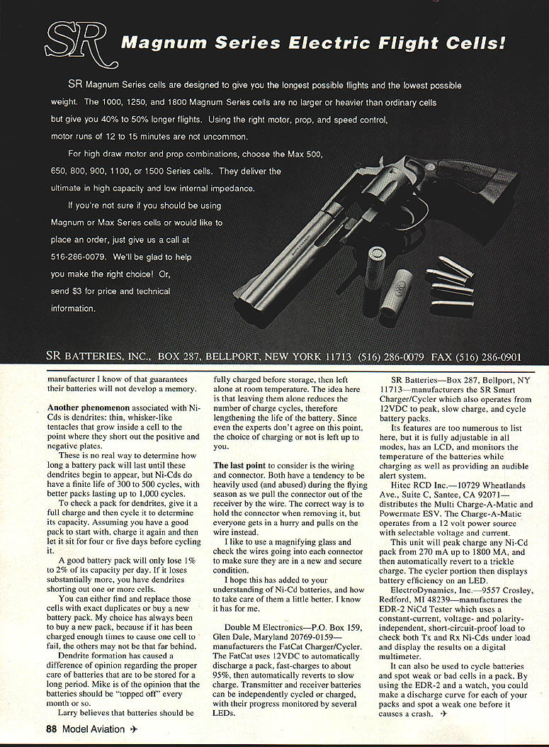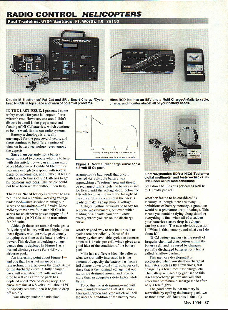 RADIO CONTROL HELICOPTERS IN THE LAST ISSUE presented some safety checks helicopter after winters rest However area didnt discuss detail proper care feeding Ni-Cd batteries continue weak link radio systems Battery technology virtually unchanged past several years continue different points view battery technology among experts Since am certainly battery expert asked two people help article can learn Mike Mahoney Double M Electronics nice enough respond several pages information talked length Larry Sribnick SR Batteries get opinions ideas article could have written help basic Ni-Cd battery referred cell has nominal working voltage under loadsuch running servos transmitterof 12 volts Most radio systems have four such Ni-Cds series airborne power supply 48 volts eight Ni-Cds transmitter 96 volts Although nominal voltages fully charged battery will read higher figures voltage obviously dropping over time battery delivers power decline working voltage versus time depicted Figure 1 normal discharge curve 48-volt airborne pack An interesting point about Figure 1 aware until researching articleis exact shape discharge curve fully charged pack will read about 52 volts will drop 48 volts after pack has depleted about 25% its capacity curve remains 48 volts until about 15% capacity remains begins drop off rapidly always under mistaken 52 48 BtUy V&bg 007550250 PtgIThtt,y R ,inigaaFnctio d sr cne fr48i-d pk Figure 1 Normal discharge curve 48-volt Ni-Cd pack assumption bad word once reached 48 volts battery approaching caution area should recharged Larry feels battery safe flying until voltage drops below 48-volt level shown far right curve indicates pack ready make sharp drop voltage digital voltmeter would handy accurate measurements reading 48 volts dont know exactly discharge curve Another good way test batteries cycle periodically Most battery cyclers available cycle batteries down 11 volts per cell gives us good idea condition battery pack Mike has different idea believes what really interested amount capacity battery has full charge down 12 volts per cell since nominal voltage radios designed around provide adequate safety factor flying designingand will soon manufacturethe FatCat II PeakCharging Cycler/Analyzer will tell user condition battery pack both down 12 volts per cell well 11 volts per cell Another factor considered memory Although definitions battery memory good would premature drop voltage means could flying along thinking everything fine sudden batteries start drop voltage causing crash next obvious question What memory what can about Ni-Cd battery memory result irregular chemical distribution within battery cell caused charging partially discharged batteries what called shallow cycling memory development accelerated shallow-charge high rates such fly few times fast charge fly few times fast charge etc battery will actually get used discharge-charge pattern will enter premature discharge mode after few flights good news memory reversible cycling battery pack two three times SR Batteries May1994 87 Double M Electronics Fat Cat SRs Smart Charger/Cycler Hitec RCD Inc has ESV Multi Charge-A-Matic cycle keep Ni-Cds top shape warn potential problems charge monitor almost battery needs ElectroDynamics EDR-2 NiCd Testera digital multimeter testerchecks Ni Cds under actual load conditions manufacturer know guarantees batteries will develop memory Another phenomenon associated Ni Cds dendrites thin whisker-like tentacles grow inside cell point short out positive negative plates no real way determine long battery pack will last until dendrites begin appear Ni-Cds have finite life 300 500 cycles better packs lasting up 1000 cycles check pack dendrites give full charge cycle determine its capacity Assuming have good pack start charge again let sit four five days before cycling good battery pack will lose 1% 2% its capacity per day loses substantially have dendrites shorting out cells can either find replace cells exact duplicates buy new battery pack choice has always buy new pack because has charged enough times cause cell fail others may far behind Dendrite formation has caused difference opinion regarding proper care batteries stored long period Mike opinion batteries should topped off month Larry believes batteries should fully charged before storage left alone room temperature idea leaving alone reduces number charge cycles therefore lengthening life battery Since experts dont agree point choice charging left up last point consider wiring connector Both have tendency heavily used abused during flying season pull connector out receiver wire correct way hold connector removing everyone gets hurry pulls wire instead like use magnifying glass check wires going connector make sure new secure condition hope has added understanding Ni-Cd batteries take care little better know has Double M ElectronicsPO Box 159 Glen Dale Maryland 20769-0159 manufacturers FatCat Charger/Cycler FatCat uses l2VDC automatically discharge pack fast-charges about 95% automatically reverts slow charge Transmitter receiver batteries can independently cycled charged progress monitored several LEDs SR BatteriesBox 287 Bellport NY 11713manufacturers SR Smart Charger/Cycler also operates 12VDC peak slow charge cycle battery packs Its features too numerous list fully adjustable modes has LCD monitors temperature batteries charging well providing audible alert system Hitec RCD Jnc10729 Wheatlands Ave Suite C Santee CA 9207 1 distributes Multi Charge-A-Matic Powermate ESV Charge-A-Matic operates 12 volt power source selectable voltage current unit will peak charge Ni-Cd pack 270 mA up 1800 MA automatically revert trickle charge cycler portion displays battery efficiency LED ElectroDynamics Inc9557 Crosley Redford MI 48239manufactures EDR-2 NiCd Tester uses constant-current voltage- polarityindependent short-circuit-proof load check both Tx Rx Ni-Cds under load display results digital multimeter can also used cycle batteries spot 