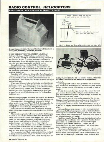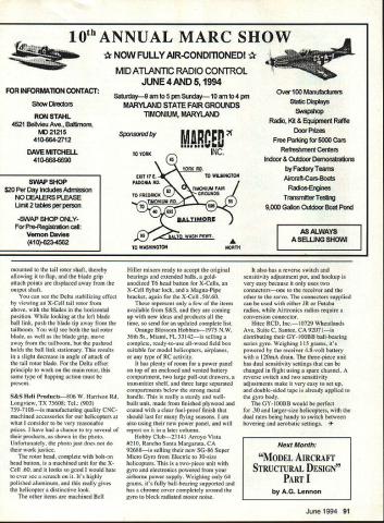 RADIO CONTROL HELICOPTERS NEW HELICOPTER PUBLICATION called Model Helicopter Technique 4926 Verdura Ave Lakewood CA 90712-3018 has recently hit streets being published Ray Hostetler give us helicopter information Rays publishing dollar quarterly publication printed black white stock paper bound staples Im really impressed attitude magazine cutting down frills beefing up informative interesting articles helps classes fliers hope give publication support because ones will benefit long run MHT articles pilot profile Curtis Youngblood responds Rays questions Although have never met Curtis seen him fly except videos Im impressed basically stock X-Cell down-to-earth attitude relying basic helicopter asked used Delta offset rotor head said no because contrary claims never saw what supposed refreshing read because know feel need latest trick item available improve flying also believe Delta offset rotor system offers no added flight improvementlets take closer look see accompanying figure shows both normal Delta offset blade grip compare illustration purposes pushrod swashplate connected bell mixer whichin case Curtis X-Cellis connected leading edge blade grip Therefore input swashplate acts blade grip through bell mixer clarity bell mixer has omitted figure simply shows push rod input going directly blade grip point normal setup has bell mixer attached blade grip point line centerline main shaft point also assumed blade flapping pivot point means wind gust causes rotor blade flap up down rotor blade will affected bell mixer/ pushrod because everything line pivot point However Delta offset has built-in stabilizing effect rotor system rotor disk disturbed because connection point blade grip now displaced main shaft point farther out blade grip Point B Now assume rotor blade again disturbed wind gust up direction raises rotor blade blade holder again pivots about point directly above 00 Ir main shaft Although point B wants move up rest blade grip rod swashplatelbell mixer will let thereby causing rotor blade rotate slightly decrease its angle attack Its decrease angle attack counters wind gust because stronger wind gust raise blade grip resultant decrease angle attack stabilize blade entire rotor system process however rests assumption rotor blade can indeed move up down can pivot about main shaft helicopters such X-Cell have semirigid rotor heads allow rotor blades flap lack flapping action defeats purpose Delta offset Although have data other rotor systems allow blade flapping action such Concept series helicopters impression flying Delta offset would have no better stabilizing affect because rotor system designed flap manner have heard new Kalt head designed allow blade flap up other flaps down has distinct possibilitiesat least theoreticallyto improve helicopter stability gusty weather conditions have opportunity try head I will let know performs improve stability However Delta offset very present tail rotor X-Cell well full-scale helicopter tail rotors believe tail rotor design X-Cell almost identical Bell Jet Ranger tail rotors hub soft90 Model Aviation t Normat blade grip has arm /attach point line main shaft Point B Delta offset has arm attach /point away maiis shaft Swashplate/Mixer Fig Normal Delta offsets shown bladc grip Orange Blossom Hobbies fuelproof finished field box holds power panel 12V battery transmitter Hobby Club SG-86 30 smaller models Hitec GY-1 OOBBwith its dual-rate featureis larger models 10th ANNUAL MARC SHOW * NOW FULLY BJR-CONDrnONEDI * MID ATLANTIC RADIO CONTROL JUNE4AND5 1994 Saturday9 am 5 pm Sunday 10 am 4 pm MARYLAND STATE FAIR GROUNDS TIMONIUM MARYLAND FOR INFORMAllON cOIrrACT Sh Direos RON STAHL 4521 BelMeu Ave Baltimore MD 21215 410-664-2712 DAVE MITCHELL 410-6686690 SWAP SHOP $20 Per Day Indudes Admission NO DEALERS PLEASE Um 2 tables per peson -SWAP SHOP ONLYFor Pre-Registration call Vernon Davies 41 0-823-4562 Sponscyed a. INC TO YORK 45 YORK RD EXIT 171 PADOMA RD TiMONIUM FAIR 83GROUNDS TO FREDRICK TIMONIUM RD95 70695 40695 IALflMBE 95T PKWY TO WASHINGTONNORTh Static Displays RadK Kit & Equipment Raffle Door Prizes Free Paildng 5000 Ca Refreshment Centers Indoor & Outdoor Demonstrations Fadory Teams Aircraft -Cars-Boats Radios-Engines Transmitter Testing 9000 Gallon Outdoor Boat Pond AS ALWAYS SELUNG SHOW TO WILMINGTON mounted tail rotor shaft thereby allowing flap blade grip attach points displaced away output shaft can see Delta stabilizing effect viewing X-Cell tail rotor above blades horizontal position looking left blade ball link push blade tip away tailboom will see both tail rotor blade well blade grip move away tailboom pushrod holds ball link stationary results slight decrease angle attack tail rotor blade Delta offset principle work main rotor same type flapping action must present S&S Hell Products806 W Harrison Rd Longview TX 75608 Tel 903 759-7106is manufacturing quality CNC machined accessories helicopters what consider very reasonable prices have chance try several products shown photo Unfortunately photo just does work justice rotor head complete bolt-on head button machined unit X Cell 60 looks good would hate ever see scratch Its highly polished aluminum really gives helicopter distinctive look other items machined Bell Hiller mixers ready accept original bearings extended balls goldanodized T6 head button X-Cells X-Cell flybar lock Magna-Pipe bracket again X-Cell 50/60 represent few items available S&S coming up new ideas products time send updated complete list Orange Blossom Hobbies1975 NW 36th St Miami FL 33142is selling complete ready-to-use all-wood field box suitable model helicopters airplanes type RC activity has plenty room power panel top enclosed vented battery compartment two large pull-out drawers transmitter shelf three large separated compartments below strong metal handle really sturdy wellbuilt unit made finished plywood coated clear fuel-proof finish should last flying seasons am also using new power panel will report 