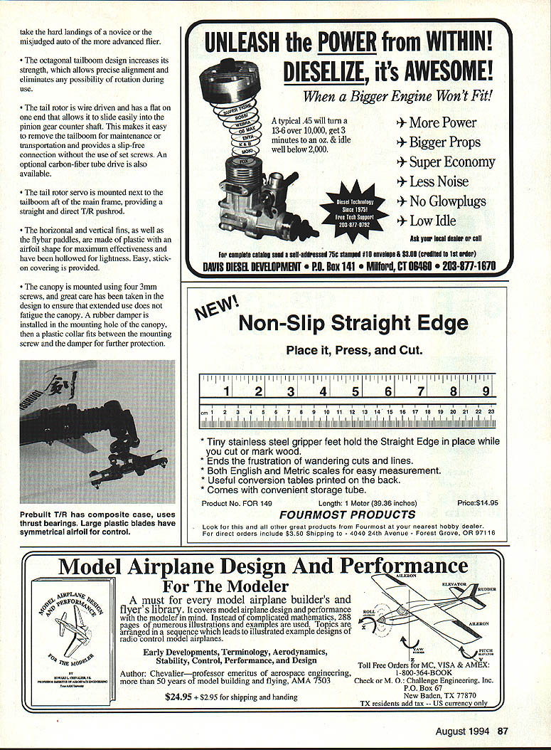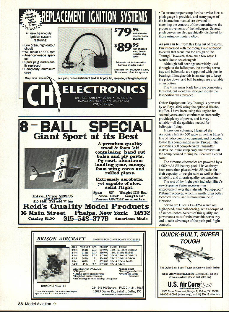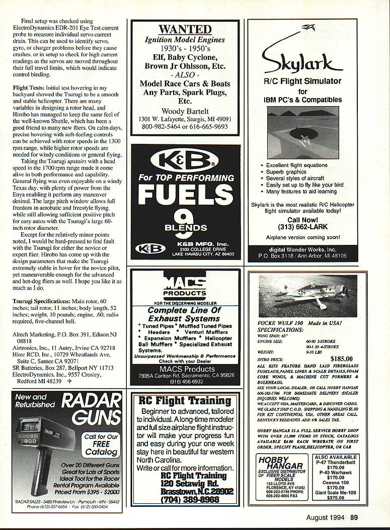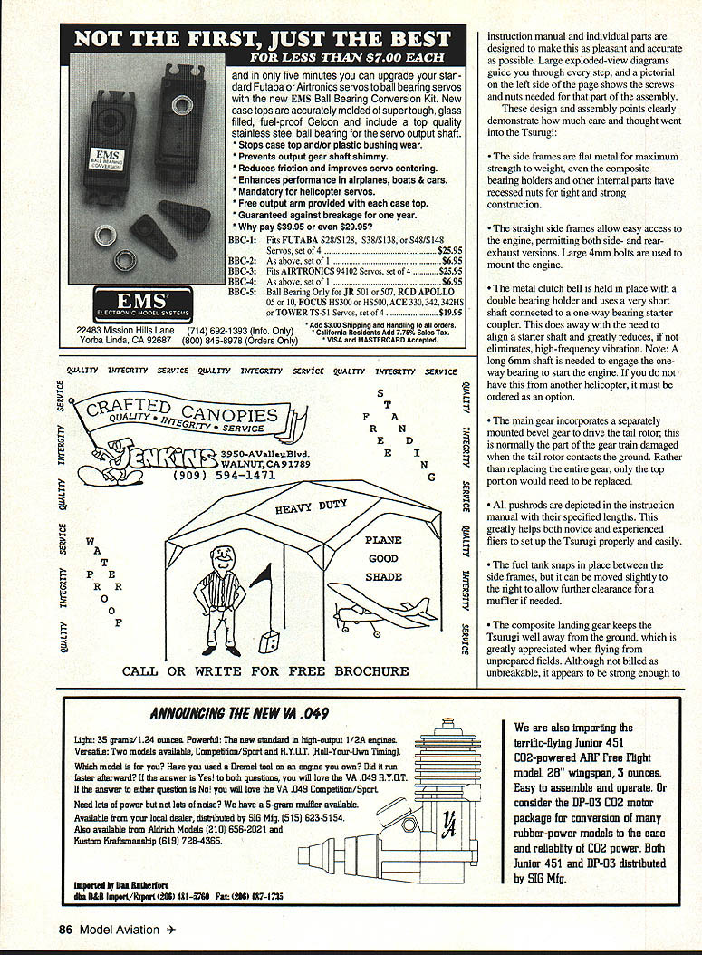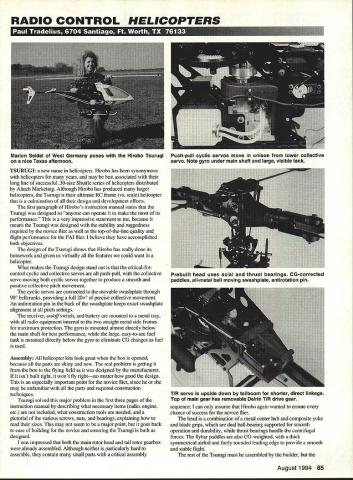 RADIO CONTROL HELICOPTERS TSURUGI new name helicopters Hirobo has synonymous helicopters years may best associated long line successful 30-size Shuttle series helicopters distributed Altech Marketing Although Hirobo has produced larger helicopters Tsurugi ultimate RC frame vs scale helicopter culmination design development efforts first paragraph Hirobos instruction manual states Tsurugi designed anyone can operate make its performance very impressive statement because means Tsurugi designed stability ruggedness required novice flier well top-of-the-line quality flight performance FM flier believe have accomplished both objectives design Tsumgi shows Hirobo has really done its homework given us virtually features could want helicopter What makes Tsurugi design stand out critical-forcontrol cyclic collective servos push-pull collective servo moving both cyclic servos together produce smooth positive collective pitch movement cyclic servos connected movable swashplate through 900 bellcranks providing full 200 precise collective movement An antirotation pin back swashplate keeps exact swasliplate alignment pitch settings receiver on/off switch battery mounted metal tray radio equipment internal two straight metal side frames maximum protection gyro mounted almost directly below main shaft best performance large easy-to-see fuel tank mounted directly below gyro eliminate CG changes fuel used Assembly helicopter kits look great box opened because parts shiny new real problem getting box flying field designed manufacturer isnt built right wont fly rightno matter good design especially important point novice flier since may unfamiliar parts required construction techniques Tsurugi solved major problem first three pages instruction manual describing what necessary items radio engine etc included what construction tools needed pictorial various screws nuts bearings explaining read sizes may seem major point goes back ease building novice ensuring Tsurugi built designed impressed both main rotor head tail rotor gearbox already assembled Although neither particularly hard assemble contain small parts critical assembly sequence can assume Hirobo again wanted ensure chance success novice flier head combination metal center hub composite yoke blade grips dual ball-bearing supported smooth operation durability thrust bearings handle centrifugal forces flybar paddles also CG-weighted thick symmetrical airfoil fairly rounded leading edge provide smooth stable flight rest Tsurugi must assembled builder August1994 85 Marion Seidel West Germany poses Hirobo Tsurugi nice Texas afternoon Push-pull cyclic servos move unison lower collective servo Note gyro under main shaft large visible tank Prebuilt head uses axial thrust bearings CG-corrected paddles all-metal ball moving swashplate antirotation pin TIR servo upside down tailboom shorter direct linkage Top main gear has removable Deirin TIR drive gear five minutes can upgrade stan dard Futaba Airtronics servos ball bearing servos new EMS Ball Bearing Conversion Kit New case tops accurately molded super tough glass filled fuel-proof Celcon include top quality stainless steel ball bearing servo output shaft * Stops case top and/or plastic bushing wear * Prevents output gear shaft shimmy * Reduces friction improves servo centering * Enhances performance airplanes boats & cars * Mandatory helicopter servos * Free output arm provided case top * Guaranteed against breakage year * pay $3995 $2995 8BC1 Fits FUTABA S28/S128 S381S138 S48/S148 Servos set 4$2595 2 As above set I$695 L3 Fits AIRTRONICS 94102 Servos set 4$2595 C4 As above set 1$695 Ball Beating Only JR 501 507 RCD APOLLO 05 10 FOCUS HS300 HS500 ACE 330342 342HS TOWER TS-51 Servos set 4$1995 Add $300 Shipping Handling orders Info OnlycalifornIa ResIdents Add 775% Sales Tax 5Orders OnlyVISA MASTERCARD Accepted U UyLL CANO PIES EGRrx-y SERVICE C 3950-A VaUyBlvd WALNUT CA 91789 909 5941471 S T F R N ED E N G n I -4 rn CALL OR WRITE FOR FREE BROCHURE instruction manual individual parts designed make pleasant accurate possible Large exploded-view diagrams guide through step pictorial left side page shows screws nuts needed part assembly design assembly points clearly demonstrate much care thought went Tsurugi side frames flat metal maximum strength weight composite bearing holders other internal parts have recessed nuts tight strong construction straight side frames allow easy access engine permitting both side- rearexhaust versions Large 4mm bolts used mount engine metal clutch bell held place double bearing holder uses very short shaft connected one-way bearing starter coupler does away need align starter shaft greatly reduces eliminates high-frequency vibration Note long 6mm shaft needed engage oneway bearing start engine have another helicopter must ordered option main gear incorporates separately mounted bevel gear drive tail rotor normally part gear traln damaged tail rotor contacts ground Rather replacing entire gear top portion would need replaced pushrods depicted instruction manual specified lengths greatly helps both novice experienced fliers set up Tsurugi properly easily fuel tank snaps place between side frames can moved slightly right allow further clearance muffler needed composite landing gear keeps Tsurugi well away ground greatly appreciated flying unprepared fields Although billed unbreakable appears strong enough light 35 grams/l24 ouns Powerful new standard high-output 1/2A engines Versatile Two models available Cmnpetition/Sport RY0T Roll-Your-Own Timing ANNOUNCING TIlE NEW KI 049 Which model Have used Drernel tool engine own Did run ster afterwail answer Yes both questions will love VA 048 H YQT answer either question No will love VA 049 Coxnpelition/Sport Need lots power lots noise have 5-gram muffler available Available frcsn local dealer distributed SIB Mfg 515 623-5154 34 Also available frtxn Aldrich Models 2101 656-2021 l5ustom liraltsmanship 619 728-4365 Imparted ly Uaa luthederd n
