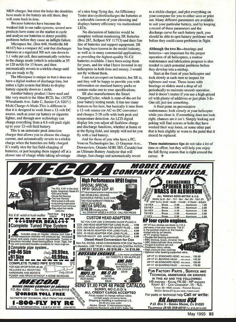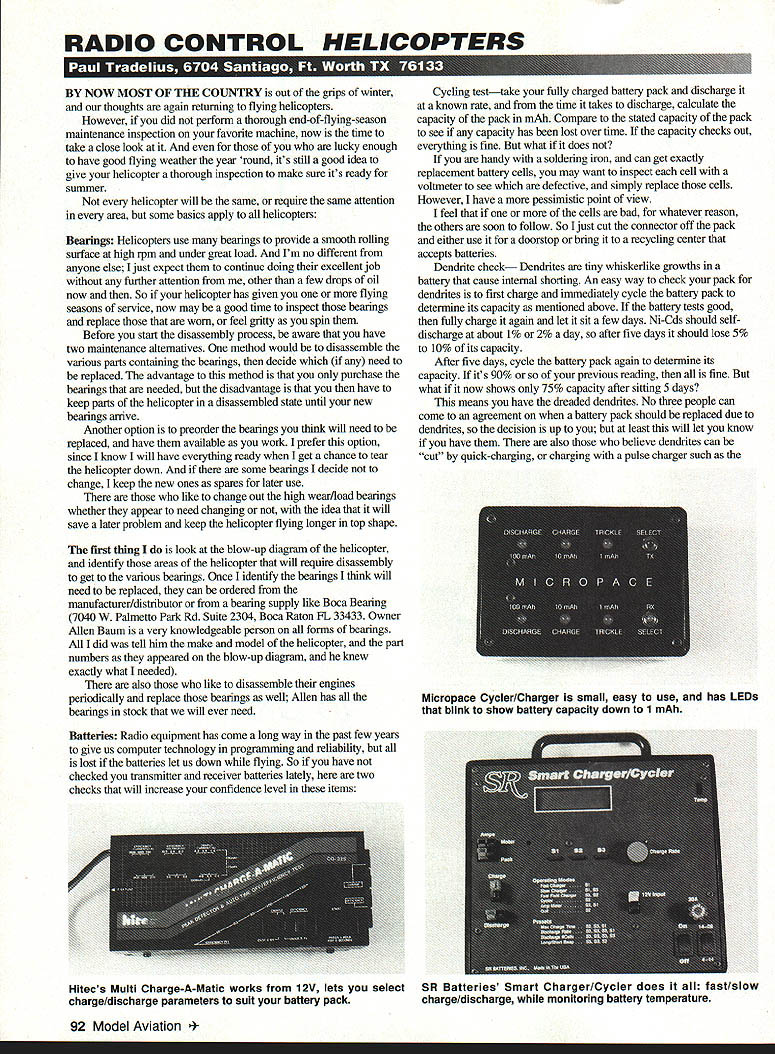 RADIO CONTROL HELICOPTERS IIm OW MOST OF THE COUNTRY out gnps winter thoughts again returning flying helicopters However did perform thorough end-of-flying-season maintenance inspection favorite machine now time take close look lucky enough have good flying weather year round its still good idea give helicopter thorough inspection make sure its ready summer helicopter will same require same attention area some basics apply helicopters Bearings Helicopters use bearings provide smooth rolling surface high rpm under great load Im no different anyone else just expect continue doing excellent job further attention other few drops oil now So helicopter has given flying seasons service now may good time inspect bearings replace worn feel gritty spin Before start disassembly process aware have two maintenance alternatives method would disassemble various parts containing bearings decide need replaced advantage method purchase bearings needed disadvantage have keep parts helicopter disassembled state until new bearings arrive Another option preorder bearings think will need replaced have available work prefer option since know will have everything ready get chance tear helicopter down some bearings decide change keep new ones spares later use like change out high wear/load bearings whether appear need changing idea will save later problem keep helicopter flying longer top shape first thing look blow-up diagram helicopter identify areas helicopter will require disassembly get various bearings Once identify bearings think will need replaced can ordered manufacturer/distributor bearing supply like Boca Bearing 7040W Palmetto Park Rd Suite 2304 Boca Raton FL 33433 Owner Allen Baum very knowledgeable person forms bearings did tell him make model helicopter part numbers appeared blow-up diagram knew exactly what needed also like disassemble engines periodically replace bearings well Allen has bearings stock will ever need Batteries Radio equipment has come long way past few years give us computer technology programming reliability lost batteries let us down flying So have checked transmitter receiver batteries lately two checks will increase confidence level items Cycling testtake fully charged battery pack discharge known rate time takes discharge calculate capacity pack mAh Compare stated capacity pack see capacity has lost over time capacity checks out everything fine what does handy soldering iron can get exactly replacement battery cells may want inspect cell voltmeter see defective simply replace cells However have pessimistic point view feel cells bad whatever reason others soon follow So just cut connector off pack either use doorstop bring recycling center accepts batteries Dendrite check Dendrites tiny whiskerlike growths battery cause internal shorting An easy way check pack dendrites first charge immediately cycle battery pack determine its capacity mentioned above battery tests good fully charge again let sit few days Ni-Cds should selfdischarge about 1% 2% day after five days should lose 5% 10% its capacity After five days cycle battery pack again determine its capacity its 90% previous reading fine what now shows 75% capacity after sitting 5 days means have dreaded dendrites No three people can come agreement battery pack should replaced due dendrites decision up least will let know have also believe dendrites can cut quick-charging charging pulse charger such 92 Model Aviation opace Cycler/Charger small easy use has LEDs blink show battery capacity down 1 mAh Hitecs Multi Charge-A-Matic works 12V lets select charge/discharge parameters suit battery pack SR Batteries Smart Charger/Cycler does fast/slow charge/discharge monitoring battery temperature MEN charger since holes dendrites have made battery still will come back time Because batteries have become weakest link radio systems several new products have come market cycle analyze batteries detect possible problems before cause inflight failure Micropace Inc Box 648 Northville MI 48167 has compact AC unit discharges batteries regulated 300 mA rare down 11 volts per cell automatically switches charge mode selectable 55 120 mAh 15 hours automatically reverts trickle charge until ready fly Micropace unique does have digital readout discharge time rather light system blinks display battery capacity down 1 mAh Another battery product have used like very much Hitec RCD Inc 10729 Wheatlands Ave Suite C Santee CA 92071 Multi Charge-A-MaticThis different designed work 12-volt DC source such car battery cigarette lighter through new technology can charge everything 48-volt pack right up 12-volt field battery automatic peak detection charger allows choose charge current automatically reverts trickle charge batteries fully charged Its realty nice fast field-charging batteries just keeping topped off slower rate charge taking advantage nice long flying day An Efficiency Tester also cycles/discharges batteries selectable current choosing displays battery efficiency via multicolored LEDs No discussion batteries would complete mentioning SR Batteries Box 287 Bellport NY 11713 fine line batteries support equipment SR has long known model industry well commercial applications providing highest-quality Ni-Cd batteries available have using years what have invested helicopters both time money would fly am expert batteries SR will happy provide information standard battery packs custom-make specifications SR also manufacturers Smart Charger/Cycler state-of-the-art battery testing needs has too features list basically runs 12-volt source AC-to-DC converter charges 2-28 cells both peak temperature detection An LCD digital display lets adjust fast/slow charge discharge functions whether home flying field simply will let fly bad battery have PC Vencon Technologies Inc 5 Graymar Ave Downsview Ontario M3H 3B5 Canada has Ultimate Battery Analyzer will charge fast-charge automatically revert trickle charger plot everything computer either save print out different p