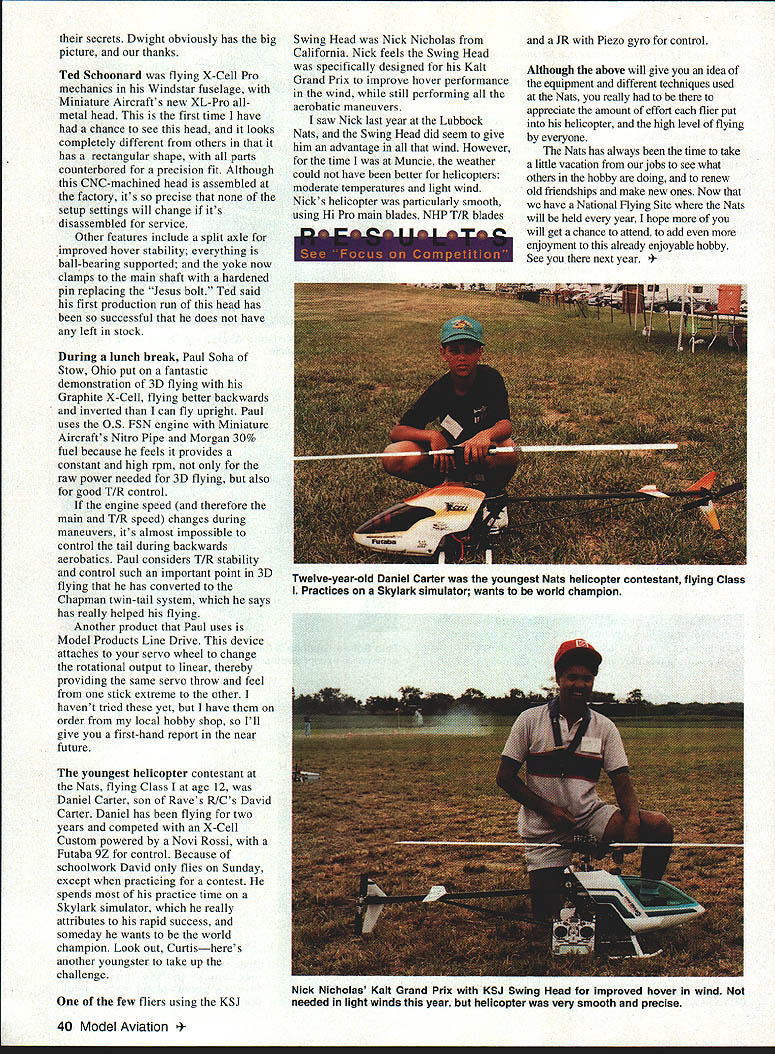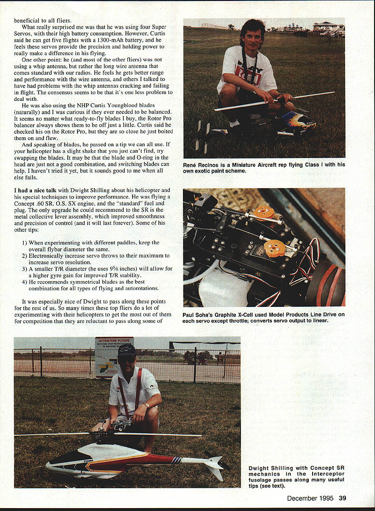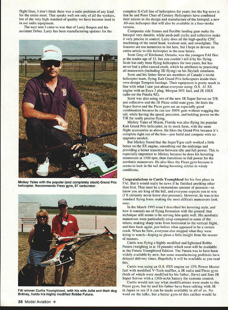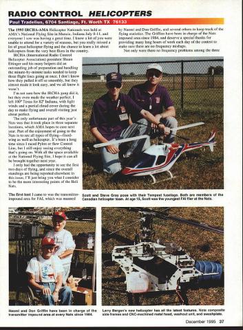 RADIO CONTROL HELICOPTERS 1995 IRCHA-AMA Helicopter Nationals held AMAs National Flying Site Muncie Indiana July 8-11 everyone saw having great time know lot unable attend variety reasons really missed lot great helicopter flying chance learn lot about helicopters very best fliers country IRCHA International Radio Control Helicopter Association president Shaun Ettinger helpers did outstanding job preparation handling minute-by-minute tasks needed keep three flight lines going once dont know pulled off smoothly almost made look easy know wasnt Im sure IRCHA gang did made weather perfect left 1000 Texas 820 Indiana light winds partial cloud cover during day make flying overall visiting just about perfect unfortunate part years Nats took place three separate locations AMA hopes cure next year Part enjoyment going Nats see types flyingfixedwing well helicopter Its long time since raced Pylon flew Control Line still enjoy seeing everything thats going space available National Flying Site hope can brought together next year opportunity see first two days flying since overall standings being reported elsewhere issue Ill just bring what consider interesting points Heli Nats Naomi Don Griffin several others keep track flying statistics Griffins have charge Nats impound area since 1984 deserve special thanks providing long hours work day contest make sure no frequency mishaps no frequency problems among three December 1995 37 first tent came transmitter- Scott Steve Gray pose Tempest fuselage Both members impound area FAI manned Canadian helicopter team age 15 Scott youngest PAl flier Nats Naomi Don Griffin have charge Larry Bergens new helicopter has latest features Note composite transmitter impound area Nats since 1984 side frames CNC-machined metal head washout unit swashplate flight lines dont think radio problem kind entire meet speaks well workers very high standard quality have become used radio equipment next tent came Larry Bergen assistant Debra Larry has manufacturing updates complete X-Cell line helicopters years big news Peter Chao Century Helicopters have combined talents design manufacture Intrepid new 60-size helicopter will also available four-stroke version Composite side frames flexible landing gear make Intrepid very durable push-pull cyclic collective make very precise control Larry does high-quality CNC machining metal head washout unit swashplate features too numerous list hope devote entire article helicopter near future Scott Gray Kitchener Ontario youngest FAI flier tender age 15 couldnt tell flying Scott has flying helicopters two years has never pilot-caused crash attributes practicing maneuvers including 3D flying Skylark simulator Scott father Steve members Canadas world helicopter team flying Kalt Grand Prix helicopters inside own-design Tempest fuselage equipment pretty much line what saw just about everyone using 0S 61 SX engine Enya 3 plug Morgan 30% fuel JR lOSX radio Futaba 9Z Scott also using two new JR Super Servos T/R collective JR Piezo solid-state gyro feels Super Servo Piezo gyro especially good combination because can use 100% gain wagging tail having speed precision holding power T/R really precise flying Mickey Yates Miami Florida also flying popular Kalt Grand Prix helicopter its stock form same flight accessories above likes Grand Prix because its complete right out boxjust build compete no upgrades needed Mickey found SuperTigre carb worked little better SX engine smoothing out midrange providing better transition between idle full power especially important Mickey because does hovering maneuvers 1500 rpm transitions full power aerobatic maneuvers also likes Piezo gyro because seems lock tail during hovering circles windy conditions Congratulations Curtis Youngblood first place FAI would really news finished anything other first must tremendous amount pressureto know king hill everyone expects win Ill certainly never know pressure However standard flying form making difficult maneuvers look easy March 1995 issue described hovering style reminds flying formation ground technique still seems serving him quite well aerobatic maneuvers particularly crisp compared some others making sharp turns horizontal vertical flight back again just before what appeared certain crash flew everyone else stopped what doing watchhoping glean little insight master masters Curtis flying highly modified lightened Robbe Futura weighing 10 pounds soon will available Futura Youngblood Edition Futura have widely available now some manufacturing problems have delayed delivery times Hopefully will available read Curtis using 0S FSN engine 15% Power Master fuel modified V-Tech muffler JR radio Piezo gyro both modified father Dave four JR Super Servos 1300-mAh battery extreme control Curtis would say what modifications made Piezo gyro father have talking JR Japan see can made available us No word talks better gyro caliber would 38 Model Aviation ey Yates popular completely stock Grand Prix helicopter Recommends Piezo gyro ST carburetor FAI winner Curtis Youngblood wife Julie dog Britney holds highly modified Robbe Futura beneficial fliers What really surprised was using four Super Servos high battery consumption However Curtis said can get five flights 1300-mAh battery feels servos provide precision holding power really make difference flying other point other fliers using whip antenna rather long wire antenna comes standard radios feels gets better range performance wire antenna others talked have problems whip antennas cracking failing flight consensus seems its less problem deal also using NHP Curtis Youngblood blades naturally curious ever needed balanced seems no matter what ready-to-fly blades buy Rotor Pro balancer always shows off just little Curtis said checked Rotor Pro close just bolted flew speaking blades passed tip can use helicopter has slight shake just cant find try swapping blades may blade 0-ring head just good combination switching blades can help havent tried 