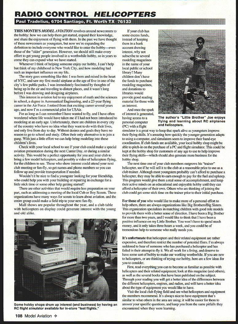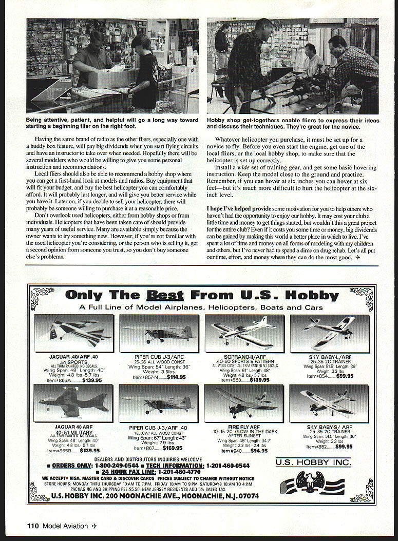 RADIO CONTROL HELICOPTERS U 1f 1 THIS MONTHS MODELAVIATIONrevolves around newcomers hobby can help get started expand knowledge share enjoyment flying past have thought newcomers youngsters now expanding definition include evexyone would like enter hobbyeven older generation However should still make effort get young people involved worthwhile hobby years come can expand what have started Whenever think helping someone enjoy hobby cant help think childhood New York City modeling such important influence life story goes something like born raised heart NYC saw first model airplane age five citys few public parks immediately fascinated thoughts being up air traveling distant places wasnt long before drawing designing airplanes interest aviation led enjoyment math sciences school degree Aeronautical Engineering 23-year flying career Air Force retired exciting career several years ago now Im commercial pilot USAir long can remember have wanted fly have often wondered life would have taken introduced modeling early age Unfortunately children city country have no idea what want lives live day day Without desires goals have no reason go school study Often alternative join gang just little effort can help bring modeling childrens lives Check local school see club could make special aviation presentation during next Career Day during similar activity would perfect opportunity club bring few model helicopters possibly video helicopters flying children see show interest could attend next club meeting fun-fly get names phone numbers can follow up provide transportation needed Wouldnt nice find youngster looking friendship could help building repairing exchange little stick time some other help getting started other activities would require less preparation part such addressing meeting local Cub Boy Scouts organizations have ways scouts learn about aviation entire group could make field trip next fun-fly Mall shows popular throughout year club table helicopters display could generate interest young old alike club has some excess funds instead keeping bank account drawing interest subscribe several modeling magazines name local public school library children dont have funds purchase modeling magazines donations libraries would provide good reading material interest once spark interest generated having access authors Little Brother Joe enjoys personal computer flying learning about RC airplanes PC flight helicopters simulator great way keep spark alive youngsters improve flying skills Its amazing quickly younger generation adapts using computer simulators seem improve hand-eye coordination club funds available local hobby shop might able pitch-in purchase PC flight simulator could kept hobby shop customers age use help improve flying skillswhich should also generate business hobby shop next time club members outgrows trainer helicopter see will sell club reasonable price use club trainer Although youngsters probably cant afford purchase helicopter may able eam enough pay fuel upkeep program would give real sense accomplishment keep active minds educational enjoyable hobby until can afford helicopter own Others thinking joining club could get some stick time trainer prior initial purchase would like make personal effort help others always organizations like Big Brothers/Big Sisters organization specializes matching children good role models provide better sense direction have Big Brother two years would like think have positive influence Little Brother wont have spend much money takes three hours week could tremendous help someone really needs Its unfortunate helicopters related equipment rather expensive therefore restrict number potential fliers Im always saddened hear someone has purehased helicopter has failed attempt fly work living deserve have some sort hobby make working worthwhile new helicopters thinking trying hobby few ideas consider First read everything can become familiar possible helicopters related equipment look magazine others well several books have published subject Through reading will get better idea differences between different helicopters engines radios will have better idea about type equipment would like have Visit local club flying field see what helicopters equipment members recommend Its always nice have equipment thats similar what others area using will easier answer specific questions keep same pitfalls encountered learning 108 Model Aviation hobby shops drum up interest business having RC flight simulator available in-store test flights Having same brand radio other fliers especially buddy box feature will pay big dividends start flying circuits have instructor take over needed Hopefully will several modelers would willing give some personal instruction recommendations Local fliers should also able recommend hobby shop can get first-hand look models radios Buy equipment will fit budget buy best helicopter can comfortably afford will probably last longer will give better service have Later decide sell helicopter will probably someone willing purchase reasonable price Dont overlook used helicopters either hobby shops individuals Helicopters have taken care should provide years useful service available simply because owner wants try something new However youre familiar used helicopter youre considering person selling get second opinion someone trust dont buy someone elses problems Whatever helicopter purchase must set up novice fly Before start engine get local fliers local hobby shop make sure helicopter set up correctly Install wide set training gear get some basic hovering instruction Keep model close ground practice Remember can hover six inches can hover six feetbut its much difficult hurt helicopter sixinch level hope Ive helped provide some motivation help others havent opportunity enjoy hobby may cost club little time money get things started wouldnt great project entire club costs some time money big dividends can gained making world better place live Ive spent l
