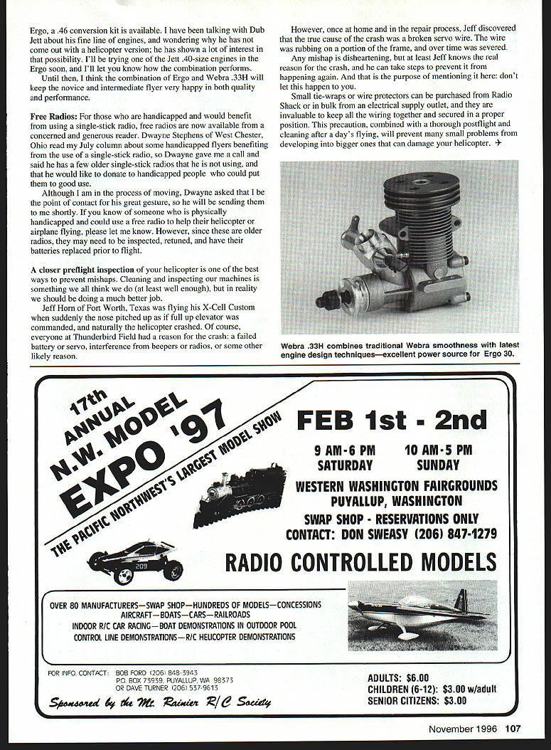 RADIO CONTROL HELICOPTERS AI11 THE JR ERGO 30/46 Helicopter presented last column since have opportunity complete setup put several flights new helicopter overall impression Ergo continues nothing less what have come expect JR products high-quality components combined expert engineering provide product will appeal novice expert flier alike Ergo slightly larger other 30size helicopters providing plenty room standard size radio rear mounted gyro Initial setup also made easy novice will appreciate because critical linkages either preformed factory assembled correct length Although swashplate deflection collective pitch range can reduced learning happy see full 200 collective pitch range available Ergo 30 special JR muffler Webra 33H takes rest Large easy-to-see unlimited aerobatics canopy landing gear keeps tail well away ground also continued impressed large white Ergo canopy Its snapped position two holding points side making canopy fast easy remove install yet held securely place eliminate vibration small cutout bottom both sides canopy makes easy see fuel running low because canopy white rather large its easy see flight canopies helicopters dont rate much describing helicopter Ergos obviously cut above new Webra 33H heli engine JR muffler used power Ergo both did excellent job However mentioned previous article engine must started using hex extended starting shaft Part # JRP960090 Also little care preplanning needed starting engine Whenever helicopter started hand must have firm grip head case engine starts position other idle other hand actuating starter However Ergo dont great rush pull starter away after engine started because spinning starter extension could cause damage canopy linkages since starter shaft engages oneway bearing starter can stopped before removing helicopter have used Webra engines past 17 years have always reputation being highest quality workmanship ultrasmooth operation Webra 33H appears just larger heat-sink head aids cooling new TNJI carb has main idle needle valve easy adjust aluminum extended throttle arm makes easy pushrod hookup Initial engine runs Ergo Webra running slightly rich no fuel tank foaming noted main idle needle valves overly sensitive adjustments important prevent two lean runs could hurt engine Initial test flights Ergo 30 showed extremely smooth stable helicopter set up general flying responding well large range head speeds Its almostvibration-free flying did really surprise because wellknown characteristics Webra engines mentioned above well elimination long starter shaft use belt-driven tail rotor Rich two-cycle engine runs head speed about 1450 rpm produced very docile flight characteristics learning hover leaner runs after little engine break-in brought head speed up 1600 rpm advanced flying Although Ergo designed handle engines up 46 certainly needed 3-D flying Webra 33H provided plenty power general flying normal aerobatics semisymmetrical main blades precovered weighted balanced ready fly although did need some final balancing gray color makes hard see flight Light-colored tape placed near tips should make blades easier see producing bulls eye rotor disk spins paddles aerodynamically shaped balanced little heavy side producing good combination stability overall feel flying especially like strong flexible landing gear holds Ergo tail rotor well away ground However impressed strong positive tail rotor Normal tall rotor throw produced very high yaw rates 3-D flying moving ball link hole closer center servo wheel made tail manageable general flying retaining good authority Because Ergo slightly larger other 30-size helicopters also slightly heavier easier see flight slight added weight does reduce performance smaller engine makes stable windy weather Although have experimented larger engines 106 Model Aviation care starter stops spinning before removing helicopter extension could damage canopy linkages Ergo 46 conversion kit available have talking Dub Jett about fine line engines wondering has come out helicopter version has shown lot interest possibility Ill trying Jett 40-size engines Ergo soon Ill let know combination performs Until think combination Ergo Webra 33H will keep novice intermediate flyer very happy both quality performance Free Radios handicapped would benefit using single-stick radio free radios now available concerned generous reader Dwayne Stephens West Chester Ohio read July column about some handicapped flyers benefiting use single-stick radio Dwayne gave call said has few older single-stick radios using would like donate handicapped people could put good use Although am process moving Dwayne asked point contact great gesture will sending shortly know someone physically handicapped could use free radio help helicopter airplane flying please let know However since older radios may need inspected retuned have batteries replaced prior flight closer preflight inspection helicopter best ways prevent mishaps Cleaning inspecting machines something think least well enough reality should doing much better job Jeff Horn Fort Worth Texas flying X-Cell Custom suddenly nose pitched up full up elevator commanded naturally helicopter crashed course everyone Thunderbird Field reason crash failed battery servo interference beepers radios some other likely reason 91 w However once home repair process Jeff discovered true cause crash broken servo wire wire rubbing portion frame over time severed Any mishap disheartening least Jeff knows real reason crash can take steps prevent happening again purpose mentioning dont let happen Small tie-wraps wire protectors can purchased Radio Shack bulk electrical supply outlet invaluable keep wiring together secured proper position precaution combined thorough postflight cleaning afrer days flying will prevent small problems developing bigger ones can damage helicopter 10 AM5 PM SUNDAY SATURDAY WESTERN WASHINGTON FAIRGROUNDS PUYALLUP WASHINGTON SWAP SHOP RESERVATIONS ONLY CONTACT DON SWEASY 206 847-12