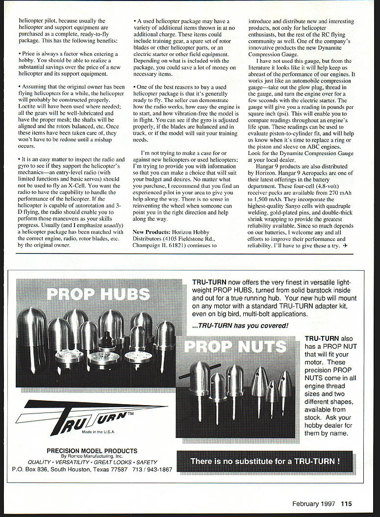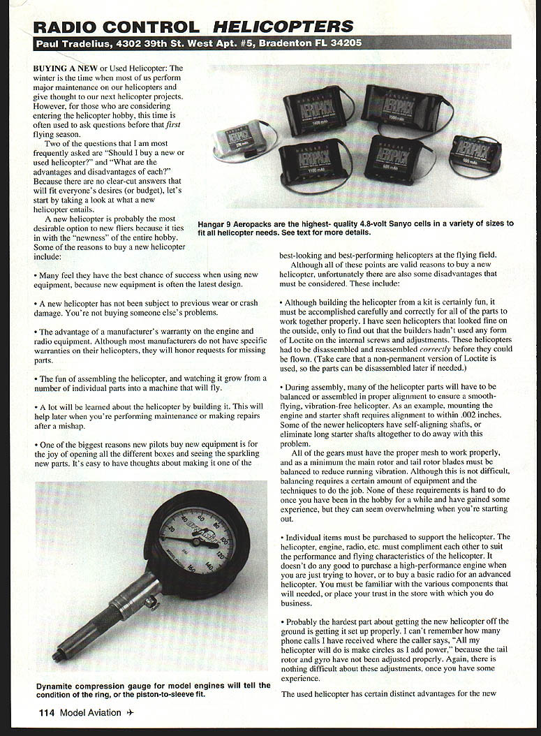 RADIO CONTROL HELICOPTERS BUYING NEW Used Helicopter winter time us perform major maintenance helicopters give thought next helicopter projects However considering entering helicopter hobby time often used ask questions before first flying season Two questions am frequently asked Should buy new used helicopter What advantages disadvantages Because no clear-cut answers will fit everyones desires budget lets start taking look what new helicopter entails new helicopter probably desirable option new fliers because ties newness entire hobby Some reasons buy new helicopter include feel have best chance success using new equipment because new equipment often latest design new helicopter has subject previous wear crash damage Youre buying someone elses problems advantage manufacturers warranty engine radio equipment Although manufacturers have specific warranties helicopters will honor requests missing parts fun assembling helicopter watching grow number individual parts machine will fly lot will learned about helicopter building will help later youre performing maintenance making repairs after mishap biggest reasons new pilots buy new equipment joy opening different boxes seeing sparkling new parts Its easy have thoughts about making best-looking best-performing helicopters flying field Although points valid reasons buy new helicopter unfortunately also some disadvantages must considered include Although building helicopter kit certainly fun must accomplished carefully correctly parts work together properly have seen helicopters looked fine outside find out builders hadnt used form Loctite internal screws adjustments helicopters disassembled reassembled correctly before could flown Take care non-permanent version Loctite used parts can disassembled later needed During assembly helicopter parts will have balanced assembled proper alignment ensure smoothflying vibration-free helicopter As example mounting engine starter shaft requires alignment within 002 inches Some newer helicopters have self-aligning shafts eliminate long starter shafts altogether away problem gears must have proper mesh work properly minimum main rotor tail rotor blades must balanced reduce running vibration Although difficult balancing requires certain amount equipment techniques job None requirements hard once have hobby have gained some experience can seem overwhelming youre starting out Individual items must purchased support helicopter helicopter engine radio etc must compliment other suit performance flying characteristics helicopter doesnt good purchase high-performance engine just trying hover buy basic radio advanced helicopter must familiar various components will needed place trust store business Probably hardest part about getting new helicopter off ground getting set up properly cant remember phone calls have received caller says helicopter will make circles add power because tail rotor gyro have adjusted properly Again nothing difficult about adjustments once have some experience used helicopter has certain distinct advantages new 114 Model Aviation ar 9 Aeropacks highest- quality 48-volt Sanyo cells variety sizes fit helicopter needs See text details Dynamite compression gauge model engines will tell condition ring piston-to-sleeve fit helicopter pilot because usually helicopter support equipment purchased complete ready-to-fly package has following benefits Price always factor entering hobby should able realize substantial savings over price new helicopter its support equipment Assuming original owner has flying helicopters helicopter will probably constructed properly Loctite will have used needed gears will well-lubricated have proper mesh shafts will aligned rotors balanced etc Once items have taken care wont have redone until mishap occurs easy matter inspect radio gyro see support helicopters mechanicsan entry-level radio limited functions basic servos should used fly X-Cell want radio have capability handle performance helicopter helicopter capable autorotation 3D flying radio should enable perform maneuvers skills progress Usually emphasize usually helicopter package has matched correct engine radio rotor blades etc original owner used helicopter package may have variety additional items thrown no additional charge items could include training gear spare set rotor blades other helicopter parts electric starter other field equipment Depending what included package could save lot money necessary items best reasons buy used helicopter package its generally ready fly seller can demonstrate radio works easy engine start vibration-free model flight can see gyro adjusted properly blades balanced track model will suit training needs Im trying make case against new helicopters used helicopters Im trying provide information can make choice will suit budget desires No matter what purchase recommend find experienced pilot area give help along way no sense reinventing wheel someone can point right direction help along way New Products Horizon Hobby Distributors 4105 Fieldstone Rd Champaign IL 61821 continues introduce distribute new interesting products helicopter enthusiasts rest RC flying community well companys innovative products new Dynamite Compression Gauge have used gauge literature looks like will help keep us abreast performance engines works just like automobile compression gaugetake out glow plug thread gauge turn engine over few seconds electric starter gauge will give reading pounds per square inch psi will enable compare readings throughout engines life span readings can used evaluate piston-to-cylinder fit will help us know its time replace ring piston sleeve ABC engines Look Dynamite Compression Gauge local dealer Hangar 9 products also distributed Horizon Hangar 9 Aeropacks latest offerings battery department four-cell 48-volt receiver packs available 270 mAb 1500 mAh incorporate highest-quality Sanyo cells quadruple welding gold-plated pins double-thick shrink wrapping provide greatest reliability