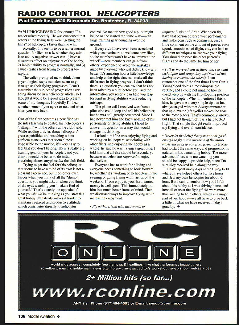 RADIO CONTROL HELICOPTERS AM PROGRESSING fast enough reader asked recently concerned others flying field getting hang helicopters faster Actually seems rather normal question fliers ask whether admit negative answer can 1 have disastrous effect enjoyment hobby 2 inhibit ability progress normally 3 cause crashes trying progress too rapidly caller prompted think about psychological steps modelers seem go through flying progresses cant remember subject progression ever being discussed helicopter article thought would good idea present some thoughts Hopefully Ill hear whether some agree what ideas may have first concerns new flier has besides learning control helicopter fitting others club field reading articles about helicopters great capabilities watching others perform maneuvers seem almost impossible novice its very easy feel dont belong Theres really big tralning gear helicopter think would better initial practicing almost anyplace club field Trying get feel helicopter seems have mind its own pleasant experience becomes harder think dumb questions might ask think eyes watching make fool yourself Thats exactly opposite what should thinking start great hobby Negativity makes harder maintain relaxed productive attitude contributes directly helicopter control No matter good pilot might started same waywith large training gear bouncing over ground club have ever associated goes overboard welcome new fliers members wont have reinvent wheelnew members can gain others experience avoid mistakes made everyone just didnt know better Its amazing little knowledge help right time can make difference flying progress dont think question can ask has asked pilot before information receive can help leap forward flying abilities reducing mishaps phone call received pilot could loop roll helicopter still greatly concerned Since never met him knew nothing personality flying abilities tried answer question way would change thinking asked him enjoying flying working helicopters associating other fliers enjoying hobby whole said having great time told him else should secondary because modelers supposed enjoy themselves Everyone has work living everyone needs something look forward whether its working helicopters evening going flying friends weekend enjoy hard-earned money well spent immediately put him much better frame mind discussed ways improve flying increasing enjoyment improve his/her abilities fly have person observe performance make constructive comments Just little comment amount power rotor speed smoothness flight etc can lead different techniques improve flying should observe other persons flights same him Talk more-advanced fliers see what techniques setup use having reinvent wheel can remember first times saw Curtis Youngblood almost-impossible routine could imagine could keep up flip-flopping position helicopter mentioned him gave very simple tip has always stayed Always remember up-elevator aft cyclic moves nose rotor blades Thats commonly known thought help 3-D flight simple thought really improved flying overall confidence Never let belief good enough tofly presence moreexperienced keep flying Everyone start same way progression natural demanding hobby moreadvanced fliers watching should happy provide help since Im sure received help along way have spent days flying field have helped others five hours flew own helicopter about 1/2 hour can remember good felt about hobby driving home us flying field willing help others major part hobbywe have give back little what have received days gone Model Aviation friend also wants to