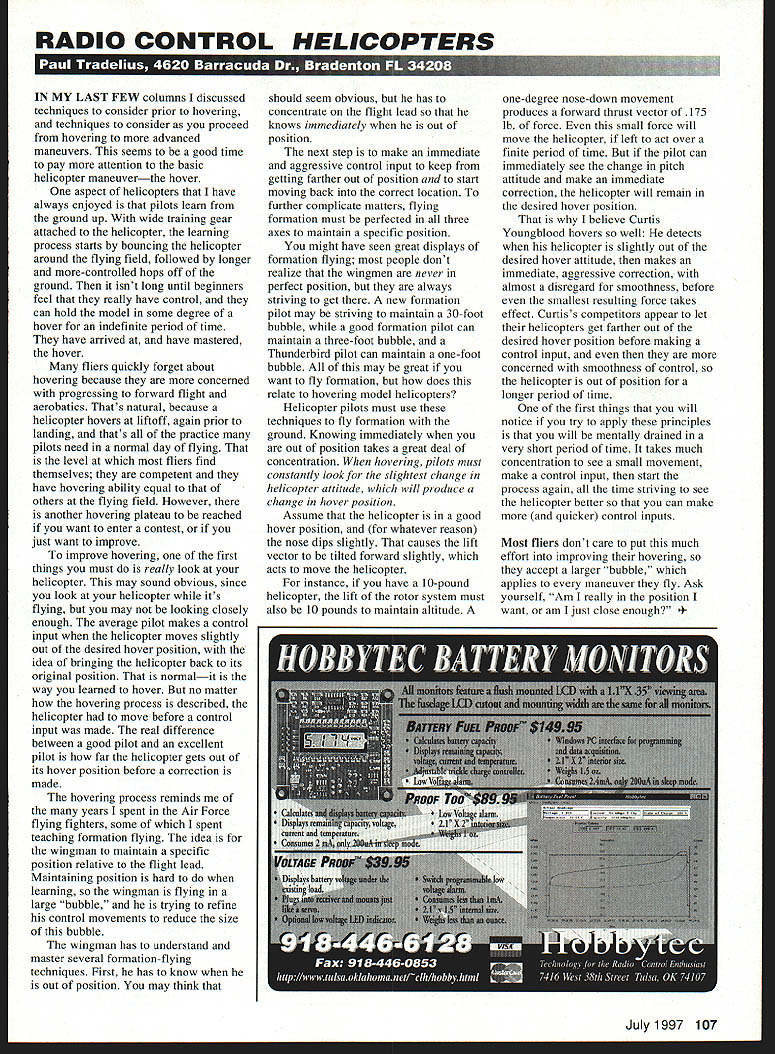 RADIO CONTROL HELICOPTERS TFI IN MY LAST FEW columns discussed techniques consider prior hovering techniques consider proceed hovering advanced maneuvers seems good time pay attention basic helicopter maneuverthe hover aspect helicopters have always enjoyed pilots learn ground up wide training gear attached helicopter learning process starts bouncing helicopter around flying field followed longer more-controlled hops off ground isnt long until beginners feel really have control can hold model some degree hover indefinite period time have arrived have mastered hover fliers quickly forget about hovering because concerned progressing forward flight aerobatics Thats natural because helicopter hovers liftoff again prior landing thats practice pilots need normal day flying level fliers find themselves competent have hovering ability equal others flying field However another hovering plateau reached want enter contest just want improve improve hovering first things must really look helicopter may sound obvious since look helicopter its flying may looking closely enough average pilot makes control input helicopter moves slightly out desired hover position idea bringing helicopter back its original position normalit way learned hover no matter hovering process described helicopter move before control input made real difference between good pilot excellent pilot far helicopter gets out its hover position before correction made hovering process reminds years spent Air Force flying fighters some spent teaching formation flying idea wingman maintain specific position relative flight lead Maintaining position hard learning wingman flying large bubble trying refine control movements reduce size bubble wingman has understand master several formation-flying techniques First has know out position may think should seem obvious has concentrate flight lead knows immediately out position next step make immediate aggressive control input keep getting farther out position start moving back correct location further complicate matters flying formation must perfected three axes maintain specific position might have seen great displays formation flying people dont realize wingmen never perfect position always striving get new formation pilot may striving maintain 30-foot bubble good formation pilot can maintain three-foot bubble Thunderbird pilot can maintain one-foot bubble may great want fly formation does relate hovering model helicopters Helicopter pilots must use techniques fly formation ground Knowing immediately out position takes great deal concentration hovering pilots must constantly look slightest change helicopter attitude will produce change hover position Assume helicopter good hover position whatever reason nose dips slightly causes lift vector tilted forward slightly acts move helicopter instance have 10-pound helicopter lift rotor system must also 10 pounds maintain altitude one-degree nose-down movement produces forward thrust vector 175 lb force small force will move helicopter left act over finite period time pilot can immediately see change pitch attitude make immediate correction helicopter will remain desired hover position believe Curtis Youngblood hovers well detects helicopter slightly out desired hover attitude makes immediate aggressive correction almost disregard smoothness before smallest resulting force takes effect Curtiss competitors appear let helicopters get farther out desired hover position before making control input concerned smoothness control helicopter out position longer period time first things will notice try apply principles will mentally drained very short period time takes much concentration see small movement make control input start process again time striving see helicopter better can make quicker control inputs Most fliers dont care put much effort improving hovering accept larger bubble applies maneuver fly Ask yourself Am really position want am just close enough 1997 107
