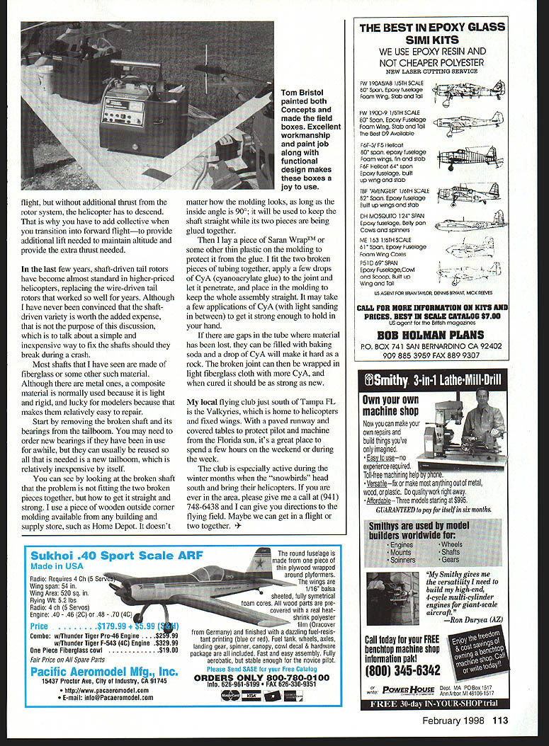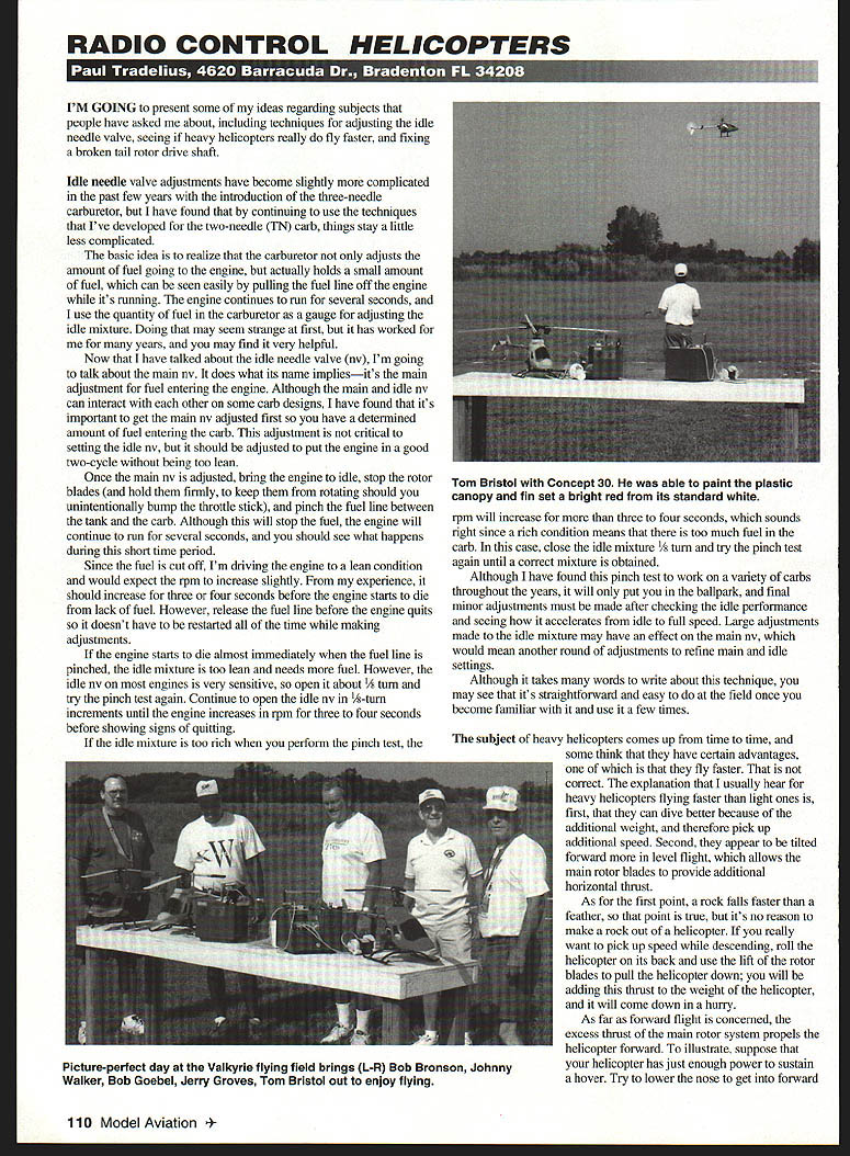 RADIO CONTROL HELICOPTERS IM GOING present some ideas regarding subjects people have asked about including techniques adjusting idle needle valve seeing heavy helicopters really fly faster fixing broken tail rotor drive shaft Idle needle valve adjustments have become slightly complicated past few years introduction three-needle carburetor have found continuing use techniques Ive developed two-needle TN carb things stay little less complicated basic idea realize carburetor adjusts amount fuel going engine actually holds small amount fuel can seen easily pulling fuel line off engine its running engine continues run several seconds use quantity fuel carburetor gauge adjusting idle mixture Doing may seem strange first has worked years may find very helpful Now have talked about idle needle valve nv Im going talk about main nv does what its name impliesits main adjustment fuel entering engine Although main idle nv can interact other some carb designs have found its important get main nv adjusted first have determined amount fuel entering carb adjustment critical setting idle nv should adjusted put engine good two-cycle being too lean Once main nv adjusted bring engine idle stop rotor blades hold fmnly keep rotating should unintentionally bump throttle stick pinch fuel line between tank carb Although will stop fuel engine will continue run several seconds should see what happens during short time period Since fuel cut off Im driving engine lean condition would expect rpm increase slightly experience should increase three four seconds before engine starts die lack fuel However release fuel line before engine quits doesnt have restarted time making adjustments engine starts die almost immediately fuel line pinched idle mixture too lean needs fuel However idle nv engines very sensitive open about 1/ turn try pinch test again Continue open idle nv A-turn increments until engine increases rpm three four seconds before showing signs quitting idle mixture too rich perform pinch test rpm will increase three four seconds sounds right since rich condition means too much fuel carb case close idle mixture turn try pinch test again until correct mixture obtained Although have found pinch test work variety carbs throughout years will put ballpark final minor adjustments must made after checking idle performance seeing accelerates idle full speed Large adjustments made idle mixture may have effect main nv would mean another round adjustments refine main idle settings Although takes words write about technique may see its straightforward easy field once become familiar use few times subject heavy helicopters comes up time time some think have certain advantages fly faster correct explanation usually hear heavy helicopters flying faster light ones first can dive better because additional weight therefore pick up additional speed Second appear tilted forward level flight allows main rotor blades provide additional horizontal thrust As first point rock falls faster feather point tme its no reason make rock out helicopter really want pick up speed descending roll helicopter its back use lift rotor blades pull helicopter down will adding thrust weight helicopter will come down hurry As far forward flight concerned excess thrust main rotor system propels helicopter forward illustrate suppose helicopter has just enough power sustain hover Try lower nose get forward 110 Model Aviation Bristol Concept 30 able paint plastic canopy fin set bright red its standard white Picture-perfect day Valkyrie flying field brings L-R Bob Bronson Johnny Walker Bob Goebel Jerry Groves Tom Bristol out enjoy flying flight additional thrust rotor system helicopter has descend have add collective transition forward flightto provide additional lift needed maintain altitude provide extra thrust needed last few years shaft-driven tail rotors have become almost standard higher-priced helicopters replacing wire-driven tail rotors worked well years Although have never convinced shaftdriven variety worth added expense purpose discussion talk about simple inexpensive way fix shafts should break during crash Most shafts have seen made fiberglass some other such material Although metal ones composite material normally used because light rigid lucky modelers because makes relatively easy repair Start removing broken shaft its bearings tailboom may need order new bearings have use awhile can usually reused needed new tailboom relatively inexpensive itself can see looking broken shaft problem fitting two broken pieces together get straight strong use piece wooden outside corner molding available building supply store such Home Depot doesnt Radio Requires 4 Ch 5 Sei Wing span 54 Wing Area 520 sq Flying Wt 52 lbs Radio 4 oh 5 Servos Engine 40 46 2C 48 70 Price $17999 -I Combo wlThunder Tiger Pro-46 Engine 99 w/Tbunder Tiger F-543 4C Engine $32999 Piece Fiberglass cowl$1900 Fair Price Spare Parts Pacific Aeromodel Mfg Inc 15437 Proctor Aye City Industry CA 91745 http//wwwpacaeromodelcom E-mail info@Pacaeromndelcom Tom Bristol painted both Concepts made field boxes Excellent workmanship paint job along functional design makes boxes joy use matter molding looks long inside angle 900 will used keep shaft straight its two pieces being glued together lay piece Saran WrapTM some other thin plastic molding protect glue fit two broken pieces tubing together apply few drops CyA cyanoacrylate glue joint let penetrate place molding keep whole assembly straight may take few applications CyA light sanding between get strong enough hold hand gaps tube material has lost can filled baking soda drop CyA will make hard rock broken joint can wrapped light fiberglass cloth CyA cured should strong new local flying club just south Tampa FL Valkyries home helicopters fixed wings paved runway covered tables protect pilot machine Florida sun its great place spend few hours weekend during week club especially active during winter months snowbirds head south bring helicopters ever