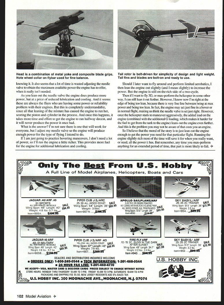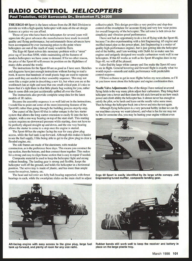 RADIO CONTROL HELICOPTERS THE ERGO 60 Sport latest release JR Heli Division provide us high-quality helicopter state-of-the-art design features price can afford have helicopters several years will appreciate great advances manufacturers have made overall quality flying performance unfortunately advances have accompanied ever increasing prices point helicopters out reach would-be fliers Ergo 60 Sport solves monetary problem street price tag less $500 maintaining features modem helicopters have come demand no other reason price Sport 60 will ensure its position flightlines clubs around world instructions Sport 60 good have seen Sketches diagrams have just enough instructions having read book seems hundreds small plastic bags used separate parts until needed assembly sequence may seem like major point describing new kit workbench late night need small critical part its nice know its right little plastic bag waiting rather some dish just accidentally spilled over floor instructions also provide complete setup data latest models JR radios Because assembly sequence well laid out instructions would like point out some interesting features Sport 60 rather going through building process step-by-step aspect Sport 60 rather unique hex starter system allows long starter extension easily fit hex adapter one-way bearing top start shaft starting system requires no downward pressure starting does have perfectly aligned straight up down way hearing allows starter come stop once engine started Sport 60 has engine facing rear easy glow plug access fuel tank up forward Although makes harder see fuel supply like being able get glow plug clear flooded engine etc side frames made flat aluminum modular construction preference days means construct top section bottom connect together makes strong easy align frame section easy repair needed Composite material used keep helicopter light strong bending landing gear strong flexible keeps helicopter well off ground holds helicopter horizontal position servo tray made plastic has ample room receiver battery etc head tall rotor fully ball-bearing supported thrust bearings swashplate slides main shaft adjust collective pitch design provides very positive slop-free control swashplate accurate flying very low wear points overall longevity helicopter tail rotor belt driven simplicity vibration-proof performance have opportunity lot flying Sport 60 because Im also experimenting Jett Engineering 65 engine muffled tuned pipe power plant Jett Engineering maker quality high-performance engines just getting helicopter end hobby am working Dubb Jet make sure engines uniquely designed two needle carburetors work well helicopters 65 works well Sport 40 engine does Ergo 40 will pleased also find large white canopy fins make Sport 60 easy see flight General hovering forward flight exactly what would expectsmooth stable performance predictable control response Ill have chance get flights before next column Ill let know about helicopter engine combination Needle Valve Adjustments things have noticed several flying fields way pilots adjust carburetors bring helicopter hover slam left stick forward see much power climb ability helicopter has almost never has enough satisfy pilot lands leans out needle valve some brings helicopter back hover tries test again Although flying helicopters very personal hobby can fly machines anyway want almost what fun may fun someone else may hurting engine March 1998 101 Ergo 60 Sport easily identified its large white canopy Jett Engineering tuned muffler composite landing gear Aft-facing engine easy access glow plug large fuel tank up forward plenty room size radio Rubber bands still work well keep receiver battery place large plastic tray knowing also seems lot time wasted adjusting needle valve obtain maximum available power engine has offer really isnt needed As lean out needle valve engine does produce power price reduced lubrication cooling seems always fliers having some power reliability problem engines completely understandable since leaning mixture has caused engine run hot scoring piston cylinder process once happens takes time effort get engine run halfway decent will never produce power once What answer Im sure will work everyone adjust needle valve engine will produce enough power type flying intend am just going practice hovering maneuvers dont need lot power Ill run engine little richer provides fuel engine additional lubrication cooling Should later want fly around perform limited aerobatics lean engine out slightly mean slightly increase power engine still rich side two-cycle want fly 3D max-perform helicopter some other way can still lean out further However know now Im right edge being too lean because very fine line between being max power being too lean fact engine may act just fine hover normal flight making us think needle valve set just right However once helicopter starts maneuver aggressively added load engine combined additional G loading makes harder fuel get tank engine leans out engine further problem may aware costs engine So believe moral story just lean out engine enough get power need particular flight Running engine slightly rich time will save really want need power has remember time max-perform anything extended period time part likely fall mfl US Hobby Full Line Model Airplanes Helicopters Boats Cars JAGUAR 4OIARF 40 PIPER CUB J-3/ARC 51 SPORTS 25-36 ALL WOOD CONST TRIM PAINtED NO DECALSSNl-Wing Span 54 Length 36 Wing Span 48 Length 40 Weight 3SIbs Weight 48 lbs -57 lbs Iteme857-N ... JAGUAR 4OARP Wing Span 48 Length 40 get 48 lbs -57 los Iteme8SSB 130oer PIPER CUB J3/ARF 40 YELLOW ALL WOOD CONST Wing Span 67 Length 43 Weight 79 lbs APOLLO SAILPLANE/ARF ELECTRIC OR ENGINE POWERED KIT COMES WITH MOTOR FOLDING PRDP~ ALL WOOD CONST ALL TRIM PAINTtD~ Wing Span 725 Length 39 Item #EN5 FIRE FLY ARF 10-15 2C GLOW INTHE DARK AFTER SUNSET SM-I Wing Span 40 Length 347 5-1•gg Weigh 22 Ibs- 24 lbs Item #940 SKY BABY-S/ ARF 25-35
