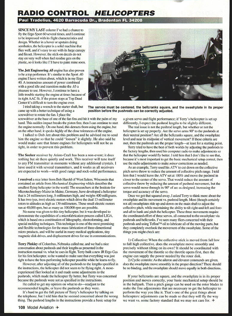 RADIO CONTROL HELICOPTERS TFI r1III LMV4IU r-u P -- SINCE MY LAST column Ive chance fly Ergo Sport 60 several times continue impressed its flight characteristics design Whether hover upstairs doing aerobatics helicopter solid machine flies well its easy see its large canopy fin set However stick-on decals stay very well fuel residue gets plastic looks like Ill have paint soon Jett Engineering 65 engine has also proven top performer Its similar Sport 40 engine have wntten about Ergo 40 tremendous amount power combined good idle transition make 65 pleasure use However continue have little trouble starting engine times because its tight AAC fit piston stops Top Dead Center its difficult turn engine over tried taking wrench starter shaft came up better technique using screwdriver rotate fan place screwdriver base fan fins hit palm hand sudden impact breaks piston free can continue start engine normally hand detracts using engine other hand speaks highly close tolerances engine talked Dub Jett about problem advised send him engine could loosen slightly also said would make sure future engines helicopters will tight order prevent problem Seeker receiver Aristo-Craft has non-event does nothing sit quietly work receiver will tune itself FM transmitter moments additional crystals have used several transmitters works receivers expected workwith good range rock-solid performance received nice letter Bob Harold West Salem Wisconsin contained article Mechanical Engineering describes smallest flying helicopter world researchers Institute Microtechnology-Mainz Mainz Germany have developed helicopter 24 millimeters long 8 millimeters high weighs 400 milligrams has two yes two electric motors drive dual 13-millimeter rotors altitudes high 130 millimeters small electric motors run 40000 rpm 100000 rpm possible No name given tiny helicopter developed demonstrate capabilities microfabrication process called LIGA based combination lithography electroforming special molding techniques technique promising flexible technologies mass fabrication three-dimentional micro products will useful medical applications tiny magnetic disk drives displacement drives use communications Terry Pindey Columbus Nebraska called nice conversation about pushrods lengths presented instruction manual vs what uses flight Terry built new JR Ergo Gas first helicopter wanted make sure everything just right have best-performing helicopter possible leams fly However after adjusting pushrods lengths specified instructions helicopter did seem flying right moreexperienced flier looked made some adjustments pushrods made helicopter fly better Terry concerned because pushrods specified instructions called get opinion what doreadjust recommended lengths leave pushrods Its hard get full picture Teny s helicopter talking telephone told him seemed concerned about wrong thing pushrod lengths instructions provide basic setup given servo flight performance Terrys helicopter set up differently expect pushrod lengths slightly different real issue pushrod length whether helicopter set up properly Are servo arms 900 pushrods neutral position Are bellcranks square swashplate level near its midpoint vertical movement criteria met pushrods proper lengthat least starting point Terry tried have best both worlds adjusting pushrods factory lengths used computer radio make adjustments helicopter would fly better told him dont like see because its important get basic mechanical setup correct use radio adjustments make minor corrections needed As example Terry used ATV cut down collective pitch servo throw reduce amount collective pitch range told him would leave ATV set 100% move pushrod closer center servo would reduce amount collective throw reducing amount pushrod movement servo would move through its 900 arc designed increasing torque accuracy servo Once got squared away asked Terry think about swashplate its movement vs pushrod length Most though certainly swashplates ride up-and-down main shaft adjust collective pitch maintaining ability tilt right-and-left foreand-aft bank pitch helicopter three movements require coordinated effort three servos connected swashplate via pushrods bellcranks Ive seen fliers concerued pushrods using TeflonTM oil lubricate moving parts completely overlook movement swasliplate Some things might check 1 Collective collective stick moved full low full high collective does swashplate move smoothly precisely tilting its own should coordinated movement throttle throttle opens first engine can supply power needed rotor disk 2 Cyclic controls As aileron elevator commands given does swasliplate move smoothly proper direction should no binding swashplate should move equally both directions bellcranks square swashplate its proper position moves correctly basic mechanical setup should ballpark pitch gauge can used rotor blades make fine adjustments necessary get helicopter perform way like Thats great things about helicopters adjustments can made will fly way want vs some factory standard may care Model Aviation os must centered belicranks square swashplate its proper position before pushrods can correctly adjusted