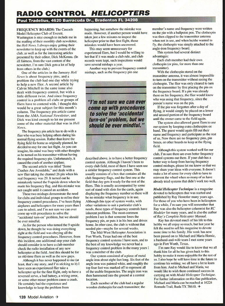 RADIO CONTROL HELICOPTERS U sIn1 m WT r iii L-W V4 IN 51 -1 t Ed FREQUENCY BOARDS Cascade Model Helicopter Club Everett Washington nice enough include mailing monthly club newsletter Heli News always enjoy getting newsletter keep up events club well interesting articles presented editor Dick McKenna fairness vast content newsletter Im sure Dick gets lot help others club articles January Heli News about frequency pins problem club day trying help new flier second article Calvin Mitchell same issue also dealt frequency control little different twist since frequency control problem clubs groups fliers have contend thought would great subject months column frequency pin article came AMA National Newsletter Dick kind enough let present some other material Heli News frequency pin article has flier busy helping others during nonnal flying session Rather leave flying field home originally planned decided stay last flight As can imagine mind busy other thoughts turned transmitter having required frequency pin Unfortunately caused crash another airplane second article titled Some Crashes Are Avoidable deals new flier taking channel 26 pin real frequency 29 turned out mistakenly turned 9 upside down made frequency flag mistake caught until caused accident two mishaps demonstrate need clubs individual groups refine frequency control procedures Ive flying airplanes helicopters years care admit Im sure can ever come up procedures solve accidental turn-on problem should ever mindful As person turned 9 upside down thought doing everything nght field obeying frequency control procedures However incident additional step club should consider have club member check radio installation new helicopter field should us old-time fliers well new guys Although has never happened least thats story Im sticking have seen experienced flier take helicopter up first flight have reversed servo bad battery wiring error some other minor problem cause crash certainly experience knowledge keep problem happening somehow mistake made However another person would have taken just few minutes inspect helicopter prior first flight mistakes would have uncovered may seem unnecessary experienced fliers would willing bet made club rule club records kept such inspections would save several mishaps year Another way prevent frequency control mishaps such frequency pin described above have better frequency control system Although havent club field have seen use similar frequency control system usually consists box contains club frequency flags first field day gets ready rest fliers usually accompanied some sort stand slots cards again displaying frequency number will no mistake what frequency use Although type system works other variations suit particular clubs needs types frequency controls have inherent problems most-common problem see someone loses frequency pin puts box drives home ether case club needed pinmaybe several weeks Mid-West Helicopter Association Fort Worth Texas best frequency control systems have seen best knowledge never frequency control problem years member club system consisted piece metal angle iron about eight feet long Six feet angle iron painted white roughly top four feet marked off represent usable frequencies angle iron hammered ground central location member club regular wooden clothespin transmitter members name frequency written pin ballpoint pen clothespin clipped transmitter antenna use he/she wanted fly clothespin simply attached angle-iron frequency board system several distinct advantages club member own clothespin pins transmitter clothespin stored transmitter antenna almost impossible turn transmitter seeing clothespin flier cleared turn transmitter first placing pin frequency board pin already frequency flier would know using frequency since persons name pin pin forgotten after day flying would simply placed lower unused portion frequency board until owner came field again system also allowed guest fliers use system keeping extra clothespins hand guest would again fill out name frequency participate rest us Now no frequency pins pin boxes other boards keep flying field Although system worked well club Im sure better frequency control systems out club has better way keep having frequency control mishaps please let know may share ideas everyone doesnt make lot sense club have reinvent wheel us have already tried systems didnt work too well Model Helicopter Technique magazine devoted helicopters started published Ray Hostetler years ago have helicopters Im sure will remember Ray also helicopter columnist RC Modeler years also author Rays Complete Helicopter Manual Ray has devoted much life hobby enjoy much last year felt need sell magazine devote time family work has now passed Michael Maria Homic husband-and-wife team met some years ago Fort Worth Texas Im sure Ray would like know thank him has given back hobby make enjoyable rest us also hope will have time future continue writing have lot learn him Michael Maria would like wish continued success canying Model Helicopter Technique further information fine publication Michael Maria can reached 16224 Remuda Trail Buda TX 78610 Model Aviation