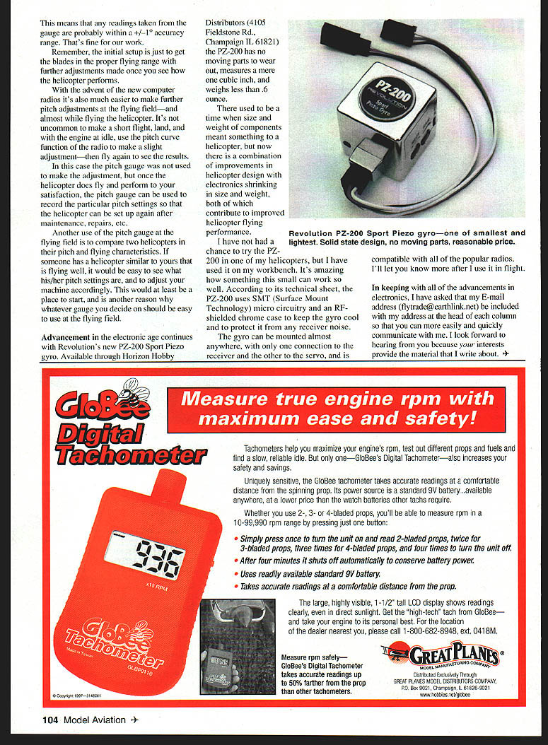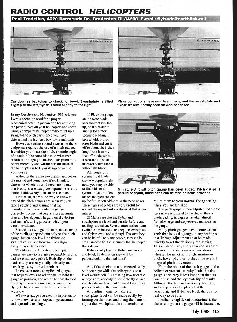 RADIO CONTROL HELICOPTERS October November 1997 columns wrote about need proper mechanical setup preparation adjusting pitch curves helicopter about using computer helicopter radio set up straight-line pitch curve once have determined high low pitch endpoints However setting up measuring endpoints requires use pitch gauge enables set pitch static angle attack rotor blades whatever position range desire pitch must set correctly within certain limits helicopter fly designed desires Although several pitch gauges market sometimes its difficult determine best recommend easy use gives repeatable results Notice did say has accurate First no way know pitch gauges accurate take reading assume manufacturers have made gauge correctly say accurate another depends largely design manufacturing process cannot evaluate Second will go later accuracy readings depends pitch gauge level flybar swashplate well align everything eye Miniature Aircraft Kalt pitch gauges easy use give repeatable results reasonably priced Both slip blade easily easy align visually have large easy-to-read numbers have seen more-complicated gauges require levels other parts hold gauge position quite complicated set up easy use flying field no better overall accuracy Whatever gauge use its important follow few basic principles get accurate repeatable readings 1 Place gauge rotor blade near root vs tip its easier line up accurate reading take old broken rotor blade cut off about six inches long use setup blade since its easier use workbench full-length blade Although fully symmetrical blades very popular right now may able find old semisymmetrical reflex blades can cut up future setup blades need arises types blades very useful normal flying autorotations interest 2 Make sure flybar swashplate level parallel before readings taken Several aftermarket items available intended keep swashplate flybar level although Im sure can helpful people really arent needed accuracy helicopter fliers desire swashplate flybar parallel level definition will perpendicular main shaft points can checked easily eye helicopter level workbench Its amazing accurate eyes see flybar swashplate level see appear perpendicular main shaft Any adjustments make swashplate level can made easily turning radio using trims adjust swashplate Just remember return normal flying setting finished pitch gauge adjusted top surface parallel flybar pitch reading degrees taken directly large easy-to-read numbers gauge pitch gauges have convenient knob locks gauge setting linkage adjustments can made quickly set desired pitch setting particularly useful initial setups manufacturers recommendations whether maximum pitch minimum pitch hover pitch check overall range pitch movement photo pitch gauge helicopter can see said gauges accuracy less important its ease use repeatability results Although human eye very accurate appears photo swashplate flybar level no real way sure either slightly out adjustment pitch readings gauge will inaccurate July1998 103 Car door backdrop check level Swashplate tilted Minor corrections have now made swashplate slightly left flybar tilted slightly right flybar level easily seen workbench too Miniature Aircraft pitch gauge has added Pitch gauge parallel flybar blade pitch can read scale provided means readings taken gauge probably within /l accuracy range Thats fine work Remember initial setup just get blades proper flying range further adjustments made once see helicopter performs advent new computer radios its also much easier make further pitch adjustments flying fieldand almost flying helicopter Its uncommon make short flight land engine idle use pitch curve function radio make slight adjustmentthen fly again see results case pitch gauge used make adjustment once helicopter does fly perform satisfaction pitch gauge can used record particular pitch settings helicopter can set up again after maintenance repairs etc Another use pitch gauge flying field compare two helicopters pitch flying characteristics someone has helicopter similar yours flying well would easy see what his/her pitch settings adjust machine accordingly would least place start another reason whatever gauge decide should easy use flying field Advancement electronic age continues Revolutions new PZ-200 Sport Piezo gyro Available through Horizon Hobby Distributors 4105 Fieldstone Rd Champaign IL 61821 PZ-200 has no moving parts wear out measures mere cubic inch weighs less 6 ounce used time size weight components meant something helicopter now combination improvements helicopter design electronics shrinking size weight both contribute improved helicopter flying performance have chance try PZ 200 helicopters have used workbench Its amazing something small can work well According its technical sheet PZ-200 uses SMT Surface Mount Technology micro circuitry RF shielded chrome case keep gyro cool protect receiver noise gyro can mounted almost anywhere connection receiver other servo compatible popular radios Ill let know after use flight keeping advancements electronics have asked E-mail address flytrade@earthlinknet included address head column can easily quickly communicate look forward hearing because interests provide material write about Model Aviation lution PZ-200 Sport Piezo gyroone smallest lightest Solid state design no moving parts reasonable price