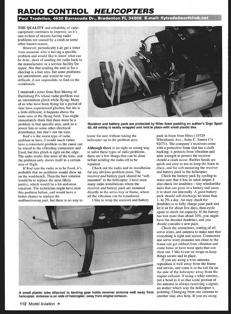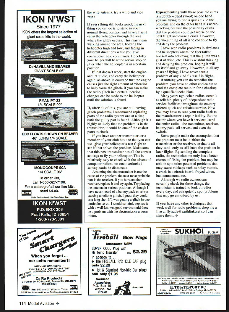 RADIO CONTROL HELICOPTERS U k1 urn -r rJi II i-i .u . U I-1 U HE QUALITY reliability radio equipment continues improve its rare hear anyone having radio problems caused crash some other known reason However periodically get letter someone having specific problem would like know what can done short sending radio back manufacturer service facility repair sending unit checkup bad idea some problems intermittent would very difficult impossible find workbench received letter Rod Murray Harrisburg PA radio problem intermittent glitch flying us have flying period time have experienced glitches little different happens above same area flying field might immediately think must problem specific area such power line some other electrical disturbance thats case Rods worst type radio problem have would much rather have consistent problem cause can traced offending component fixed glitch right edge radio works fine time problem shows itself certain area flight Rod sent radio fixed its probable no problems would show up workbench best solution would replace likely parts would hit-and-miss situation technician might have seen problem before would have better chance replace malfunctioning part no way know sure taking helicopter up problem area Although no right wrong way solve types radio problems few things can done before sending radio off repaired Check out radio its installation obvious problem areas receiver battery pack should soft mounted helicopter have seen radio installations receiver battery pack mounted directly servo tray frame vibration can transferred like wrap receiver battery pack foam Hitec 10729 Wheatlands Ave Suite C Santee CA 92071 companys receivers come protective foam has cloth backing protects vibration adds strength protect receiver should crash occur Rubber bands quick easy use keep foam place soft-mounting receiver battery pack helicopter Check battery pack cycling make sure has its rated output also check dendritestiny whiskerlike hairs can grow battery cause short out internally good battery pack should self-discharge no 1- 2% day An easy check dendrites fully charge pack let sit about five days cycle again check capacity battery has lost about 10% might have dreaded dendrites should consider new pack Check connectors routing servo wires antenna make sure everything tight secure Connectors servo wires mounted too close frame can get rubbed vibration come loose have wear spots can short out like use tie wraps keep things secure place using wire antenna reposition well away frame servos route tail fin side helicopter away engine exhaust using whip antenna put bend some portion antenna always receiving signal no matter way helicopter pointing Changing antenna another may also help using 112 Model Aviation iver battery pack protected Hitec foam padding authors Ergo Sport 60 wiring neatly wrapped held place small plastic ties small plastic tube attached landing gear holds receiver antenna well away helicopter Antenna side helicopter away engine exhaust IKON NWST Since 1977 IKON offers largest selection ojant scale kits world order kits call 1-800-327-7198 For a catalog fine kits send $400 IcUo Aad wire antenna try whip vice versa everything still looks good next thing can stand normal flying position have friend carry helicopter through area glitch occurs may mean walking around area holding helicopter high low facing different directions give continuous radio commands Hopefully helper will hear servos stop jitter helicopter certain position doesnt work start engine let idle carry helicopter again above could engine causes just right amount vibration help cause glitch can make radio glitch certain location changes can made helicopter until solution found after still having glitch problems recommend replacing parts radio system time until guilty part found Although its highly unlikely problem transmitter could easiest parts check have another transmitter member club has can use give helicopter test flight see solves problem Make sure new transmitter has correct settings fly helicopter relatively easy check advent computer radios overlooked setting could disastrous Assuming transmitter cause problem next probable part receiver have another receiver replace try again Try placing antenna various positions Although have never heard battery pack servos causing radio glitch guess could long shot getting glitch particular servo would certainly replace well-known good servo should problem electronics worn motor Experimenting possible cures double-edged sword hand trying find quick fix problem other hand its nervewracking because possibility exists problem could get worse next flight cause crash However worst thing continue fly deny problem have seen radio problems airplanes helicopters flier talked himself believing glitch gust wind etc wishful thinking denying problem hoping will fix itself go away However years flying have never seen problem kind fix itself flight nothing can remedies problem have no other choice send complete radio checkup qualified technician years ago radios werent reliable plenty independent radio service facilities throughout country offered quick reliable service Now may have send radio back manufacturers repair facility no matter have serviced send entire radiothe transmitter receiver battery pack servos switch Some people make assumption problem must either transmitter receiver send still have problem later flights sending complete radio technician has better chance fixing problem may able spot other potential problems may cause mishaps such noisy motors crack circuit board frayed wires bad connectors etc Although radio owners can certainly check things technician trained look radios day can quickly spot problems may go unnoticed us have other techniques work well radio problems drop line flytrade@earthlinknet can share iii Glow Plugs IntiOducO8 NEW SUPER COOL Plug Hi Temp Insulator os~ $229 addition FIREBALL R/C IDLE BAR plug $229 Hot & Standard Non-Idle Bar pl