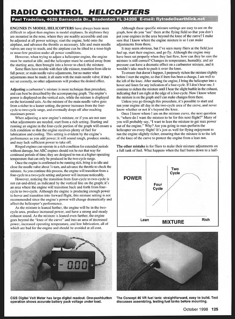 RADIO CONTROL HELICOPTERS FTTI t UJ1 [J III 1ZWffi irAtE t i 11 14 1 ma rz 4I 011011 mtii r t a ENGINES IN MODEL HELICOPTERS have always difficult adjust engines model airplanes airplanes mounted nose readily accessible can adjusted power settings start engine bold onto airplane advance throttle necessary Idle main needle valves easy reach airplane can tilted nose-high nose-low position under power conditions However trying adjust helicopter engine engine must started idle helicopter must carried away starting area brought hover check mixture Some fliers have trouble idle mixture transition idle full power main needle valve adjustments no matter what adjustments must made starts main needle valve tats set correctly no other adjustments will produce desired effect Adjusting carburetors mixture technique procedure can best described accompanying graph engines power displayed vertical axis mixture displayed horizontal axis As mixture main needle valve goes richer leaner setting power increases fourcycle two-cycle range eventually drops off after reaching maximum power adjusting new engines mixture sure what adjustments needed start rich setting Starting running engine four-cycle portion graph will ensure rich condition engine receives plenty fuel lubrication cooling setting evident engines performance add power will sound rough produce smoke may lack sufficient power take off Ringed engines can operate rich condition extended periods damage ABC engines should run way continued periods time designed run higher operating temperature can produced two-cycle range Once engine confirmed running rich bring idle close needle valve about advance throttle check mixture As continue process engine will transition four-cycle two-cycle setting power will increase noticeably However noticing transition four-cycle two-cycle cut-and-dried indicated vertical line graph its area engine will transition back forth fourcycle two-cycle Although engine producing enough power hover transition forward flight mixture setting recommended since engines power will change dramatically affect helicopters performance As mixture leaned further engine will twocycle area produce increased power have strong steady exhaust sound As mixture leaned further engine goes beyond knee curve area decreased power increased operating temperature low lubrication bad engine should avoided cost Although specific mixture settings easy see graph see flying field dont put engines area beyond knee curve make sure know engine mixture can make adjustments may seem obvious Ive seen fliers field just fuel up start engines go fly Although engine may have set properiy last flew can sure mixture still correct Changes temperature humidity air pressure can have dramatic effect carburetor mixture wouldnt take much push over knee ensure doesnt happen purposely richen mixture slightly before start engine has change am well left knee After starting engine bring helicopter hover listen indlcation four-cycle dont hear continue richen mixture until hear slight burble exhaust indicating am right edge four-cycle Now know mixture graph can make changes Unless go through procedure its possible start run engine day two-cycle area curve never know whether its beyond knee Once know am mixture curve next question want mixture next flight will probably say want lean mixture get max power out engine Are going max-perform helicopter flight Its just well flying enjoyment run engine slightly richer ensuring mixture left knee curve protect engine lean run other mistake fliers make mixture adjustments full tank fuel What happens fuel bums down halfOctober1998 125 Two Cycle POWER Four Cycle LeanMIXTURERich OGS Digital Volt Meter has large digital readout One-pushbutton concept 46 VR fuel tank straightforward easy build Text operation shows accurate battery pack voltage under load discusses assembling testing fuel tanks before mounting tank less muffler pressure header tank engine will have harder time pulling fuel carburetor will cause mixture go lean take consideration adjusting mixture near-empty tank almost worst condition produce lean run say almost because no way take gravity G loading consideration adjusting mixture ground As helicopter starts going up loop C loading model fuel will increase almost five Gs will make fuel harder get carburetor thereby leaning mixture saw effect mixtures several years ago flying Quickie SOOs other guys would set mixture max power ground full tank fuel halfway through race engines would go lean would set engine slightly rich would really come going lean worked transferred technique helicopters Try might like Im progressing assembly Kyosho Concept 46 VR expect have air next column However few items consider decide try helicopter next project Although instruction manual supplied kit great Horizon Hobby Distributors did excellent job providing additional manual offers insights ideas make assembly easier ideas presented step-by-step guide should read before starting particular step get big picture see common mistakes construction make process liffle easier Although Kyosho does good job packaging individual parts clear plastic bags still room improvement step calls specific bag bags parts opened some steps require four bags opened parts used Open bags kept workbench later assembly may several days away bag marked VR-B used assembly step 8 pieces bag used up until completion step 19 would prefer see individual bags step check off completion assembly can look see have parts left means made mistake somewhere Having individual parts bags would also ensure correct part used assembly sequence instance screws look alike packaged bag would easy use wrong specific assembly sequence best way package parts have long plastic bag major component Using head example parts needed first step would packaged top bag would heatsealed keep separate parts next step would put bag would heat-sealed through heads completion Only portion bag needed particular step would