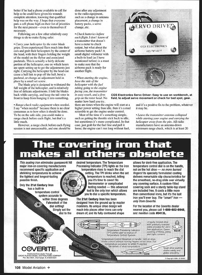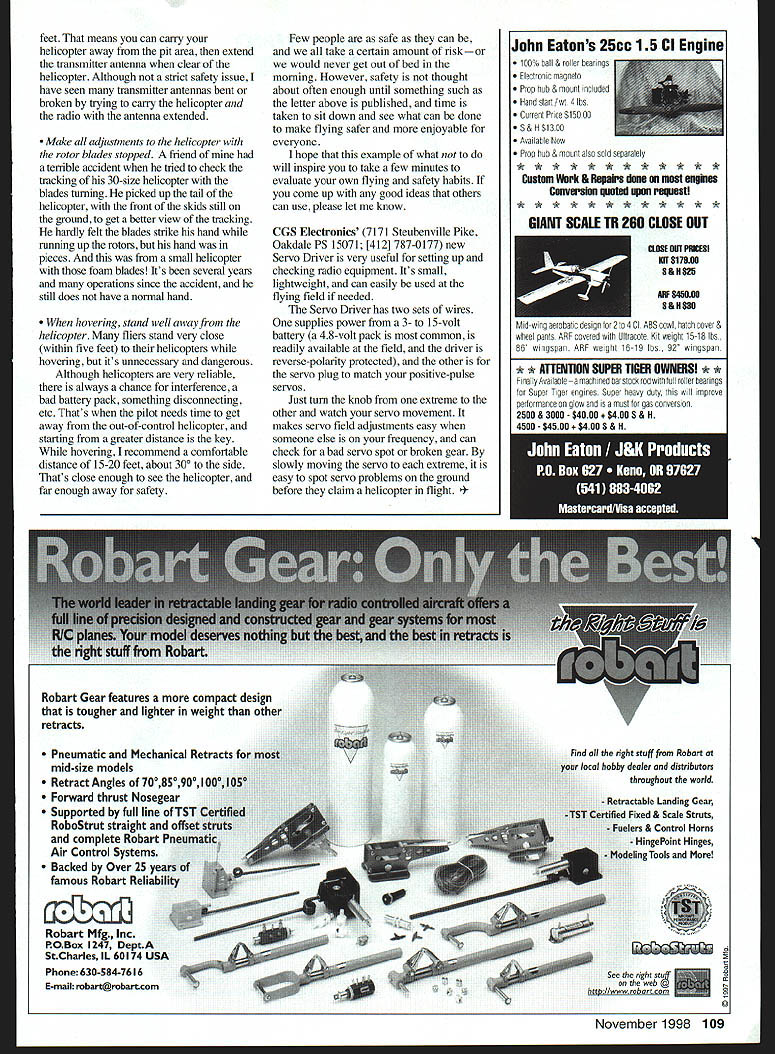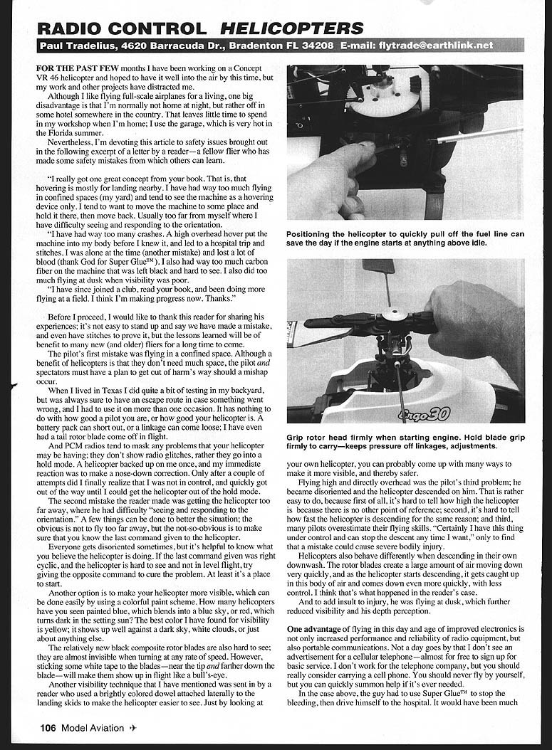 RADIO CONTROL HELICOPTERS S - . FOR THE PAST FEW months have working Concept VR 46 helicopter hoped have well air time work other projects have distracted Although like flying full-scale airplanes living big disadvantage Im nonnally home night rather off some hotel somewhere country leaves little time spend workshop Im home use garage very hot Florida summer Nevertheless Im devoting article safety issues brought out following excerpt letter readera fellow flier has made some safety mistakes others can leam really got great concept book hovering mostly landing nearby have way too much flying confined spaces yard tend see machine hovering device tend want move machine some place hold move back Usually too far myself have difficulty seeing responding orientation have way too crashes high overhead hover put machine body before knew led hospital trip stitches alone time another mistake lost lot blood thank God Super GlueTM also way too much carbon fiber machine left black hard see also did too much flying dusk visibility poor have since joined club read book doing flying afield think Im making progress now Thanks Before proceed would like thank reader sharing experiences its easy stand up say have made mistake have stitches prove lessons learned will benefit new older fliers long time come pilots first mistake flying confined space Although benefit helicopters dont need much space pilot spectators must have plan get out harms way should mishap occur lived Texas did quite bit testing backyard always sure have escape route case something went wrong use occasion has nothing good pilot good helicopter battery pack can short out linkage can come loose have tail rotor blade come off flight PCM radios tend mask problems helicopter may having dont show radio glitches rather go hold mode helicopter backed up once immediate reaction make nose-down correction Only after couple attempts did finally realize control quickly got out way until could get helicopter out hold mode second mistake reader made getting helicopter too far away difficulty seeing responding orientation few things can done better situation obvious fly too far away not-so-obvious make sure know last command given helicopter Everyone gets disoriented sometimes its helpful know what believe helicopter doing last command given right cyclic helicopter hard see level flight try giving opposite command cure problem least its place start Another option make helicopter visible can done easily using colorful paint scheme helicopters have seen palnted blue blends blue sky red turns dark setting sun best color have found visibility yellow shows up well against dark sky white clouds just about anything else relatively new black composite rotor blades also hard see almost invisible turning rate speed However sticking some white tape bladesnear tip farther down bladewill make show up flight like bulls-eye Another visibility technique have mentioned sent reader used brightly colored dowel attached laterally landing skids make helicopter easier see Just looking own helicopter can probably come up ways make visible thereby safer Flying high directly overhead pilots third problem became disoriented helicopter descended him rather easy because first its hard tell high helicopter because no other point reference second its hard tell fast helicopter descending same reason third pilots overestimate flying skills Certainly have thing under control can stop descent time want find mistake could cause severe bodily injury Helicopters also behave differently descending own downwash rotor blades create large amount air moving down very quickly helicopter starts descending gets caught up body air comes down quickly less control think thats what happened readers case add insult injury flying dusk further reduced visibility depth perception advantage flying day age improved electronics increased performance reliability radio equipment also portable communications day goes dont see advertisement cellular telephone st free sign up basic service dont work telephone company should really consider carrying cell phone should never fly yourself can quickly summon help its ever needed case above guy use Super GlueTM stop bleeding drive himself hospital would have much 106 Model Aviation * Positioning helicopter quickly pull oft fuel line can save day engine starts anything above idle Grip rotor head firmly starting engine Hold blade grip firmly carrykeeps pressure oft linkages adjustments better phone available call help could have given wounds complete attention knowing qualified help way hope everyone puts cell phone higl list priorities next presenteven themselves necessary Following few other relatively easy things to make flying safer Carry helicopter rotor blade grips experienced fliers reach cars grab helicopters center head fingers holding weight model flybar associated pushrods actually fairly delicate portion helicopter hours spent setting up get adjustments just right Canying helicopter head can cause ball link pop off ball bend pushrod change adjustment held place small set screw blade grip designed withstand full weight helicopter relatively free delicate adjustments fold blades back carrying keep tall rotor front keep banging something Range-check radio equipment needed say needed because no clear consensus often should done safe side could make range check before flight thats little much However range check before flying session unreasonable should done after adjustment radio equipment such change antenna placement change battery packs servo change etc Check batteries before flight dont know transmitter doesnt have meter check output what about alrborne battery pack small digital voltmeter built-in load have mentioned before must make sure airborne pack ready another flight starting engine have side helicopter frel tubing going engine facing transmitter easy reach firm grip rotor head No matter hard try times engine will start higher power setting idle its mad