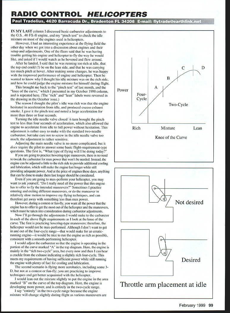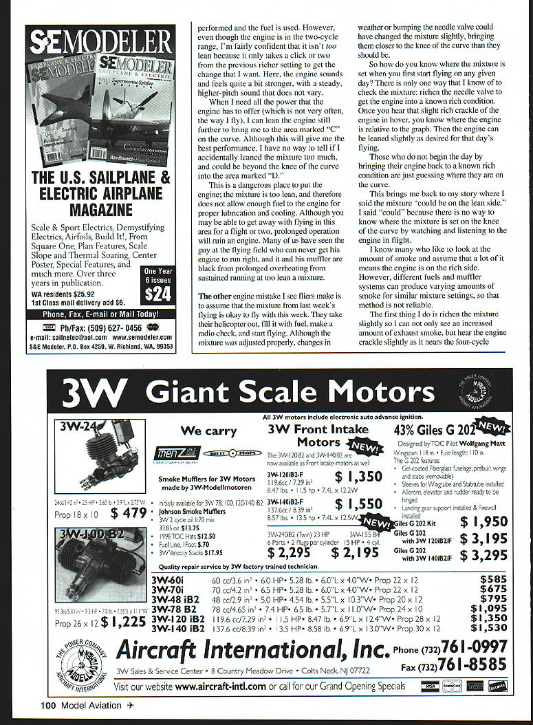 RADIO CONTROL HELICOPTERS ir MY LAST column discussed basic carburetor adjustments 05 46 FX-H engine pinch test check idle mixture engines used helicopters However interesting experience flying field other day got discussion about engines setup adjustments fliers said having trouble getting engine helicopter fly way would like asked would watch hovered flew around After landed said running too rich idle top end could side carrying too much pitch hover After making some changes happy improved performance engine helicopter wanted know thought idle mixture rich side could judge engine mixture himself during flight brought back pinch test last month knee curve presented October 1998 column repeated rich lean labels reversed drawing October issue reason thought pilots idle rich engine hesitated acceleration idle produced excess exhaust smoke gave pinch test noted large acceleration three four seconds Turning idle needle valve closed / turn brought pinch test less four seconds acceleration also allowed engine accelerate idle full power hesitation adjustment rather easy make standard two-needle carburetor take care screw idle needle valve too much adjustment rather sensitive Adjusting main needle valve no complicated does require pilot answer some basic flight-requirement-type questions first What type flying will doing today going practice hovering-type maneuvers no need tweak carburetor max power wont needed Instead engine can adjusted little rich side provide additional cooling lubrication will make engine last longer still providing adequate power price engines days anything can done make last longer should considered going max-perform helicopter may want ask yourself really need power engine has offer fly intended maneuvers Sometimes practice entering exiting different maneuvers maneuver relatively slow motion improve flying techniques can therefore get away something less max power However during contest fun-fly want power engine has offer get out helicopter maneuvers must taken consideration during carburetor adjustments Now Ill go through adjustments would make carburetor above flight requirements look knee curve first practicing hovering-type maneuvers therefore helicopter would max-performed Although dont want get out four-cycle rangethat would make erraticrunning engineit would nice run engine rich possible consistent smooth-perfoiming helicopter would adjust carburetor engine operating portion curve marked top diagram engine mainly rich two-cycle area now can hear crackle exhaust indicating slightly rich four-cycle meets requirements having sufficient power still running engine plenty fuel cooling lubrication second scenario flying aerobatics including some 3D contest fun-fly practicing improve techniques get better acquainted helicopter would lean out mixture slightly put engine area marked B curve top diagram engine developing power entirely two-cycle range say entirely two-cycle range because engine mixture will change slightly during flight various maneuvers February 1999 99 CD B Power FourCycle Two-Cycle RichMixtureLean Knee Curve desired Desired Throttle arm placement idle THE US SAILPLANE & ELECTRIC AIRPLANE MAGAZINE Scale & Sport Electrics Demystifring Electracs Airfoils Build It1 Square Plan Features Scale Slope Thermal Soaring Center Poster Special Features much Over three years puhlication WA residents $2592 1st Class mail delivery add $6 I Ph/Far 509 627- 0456 e-mail sailnelec@aolcom wwwsemodelercom S&E Modeler PO Box 4250 W Richiand WA 99353 performed fuel used However though engine two-cycle range Im fairly confident isnt too lean because takes click two previous richer setting get change want engine sounds feels quite bit stronger steady higher-pitch sound does vary need power engine has offer very often way fly can lean engine still further bring area marked C curve Although will give best performance have no way tell accidentally leaned mixture too much could beyond knee curve area marked D dangerous place put engine mixture too lean therefore does allow enough fuel engine proper lubrication cooling Although may able get away flying area flight two prolonged operation will ruin engine us have seen guy flying field can never get engine run right muffler black prolonged overheating sustained running too lean mixture other engine mistake see fliers make assume mixture last weeks flying okay fly week take helicopter out fill fuel make radio check start flying Although mixture adjusted properly changes weather bumping needle valve could have changed mixture slightly bringing closer knee curve should So know mixture set first start flying given day way know check mixture richen needle valve get engine known rich condition Once hear slight rich crackle engine hover know engine relative graph engine can leaned slightly desired days flying begin day bringing engine back known rich condition just guessing curve brings back story said mixture could lean side said could because no way know mixture set knee curve watching listening engine flight know like look amount smoke assume lot means engine rich side However different fuels muffler systems can produce varying amounts smoke similar mixture settings method reliable first thing richen mixture slightly can see increased amount exhaust smoke hear engine crackle slightly nears four-cycle 3W Front Intake Motors The3W 2082 nd3W 40B2ae~ nowase Fotakemoorsaiwet Smoke Mufflers 3W Motors3W-I20iB2 F 19629350 made 3W-Modellmotoren847 lbs hp 7 4L x 22W 3W-I 40iB2-F550 1376cc1839 n 857 lbs p74Lxl25W 3Wi5~GilOS G 202 IS HP lwith 3W 2OiB2IF 2 95GileoG 202 utah7 ass able 3W 78100120/140 B2 Johnson Smoke Mufflers 3W2cycieo l70mx 3385 oz $1375 99810C Hats $1250 Fuel Line Foot $70 3WVelocty StacKs $1795 3W240iB2 Twin 23 HP 6 Ports 2 Plugs per cyl ider $ 2295$ Quality repair service 3W factory trained technician 3W-60i 3W-70i 3W-48 1B2 3W-78 B2 3W-120 1B2 3W-140 1B2 43% Giles G 2O2 Designed byTOC Pilot Wolfgang Matt Wingspan 4 n length 10 Tne G 