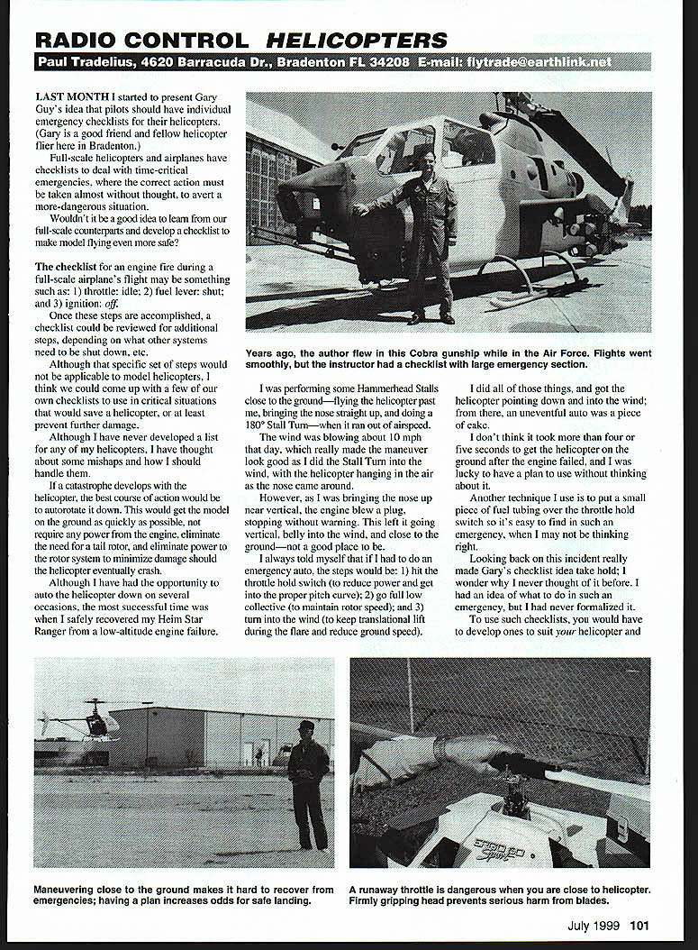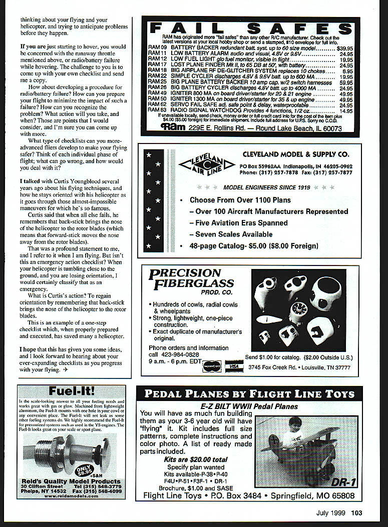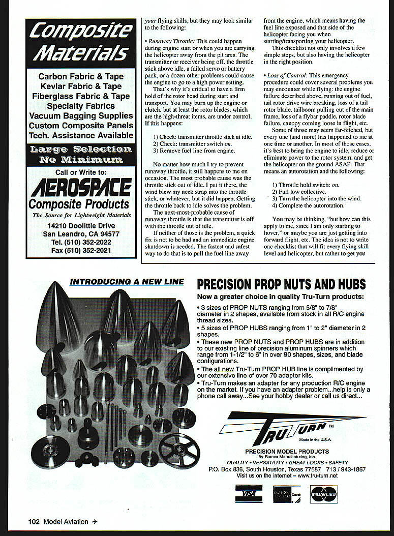 RADIO CONTROL HELICOPTERS LAST MONTH started present Gary Guys idea pilots should have individual emergency checklists helicopters Gary good friend fellow helicopter flier Bradenton Full-scale helicopters airplanes have checklists deal time-critical emergencies correct action must taken almost thought avert more-dangerous situation Wouldnt good idea learn full-scale counterparts develop checklist make model flying safe checklist engine fire during full-scale airplanes flight may something such 1 throttle idle 2 fuel lever shut 3 ignition off Once steps accomplished checklist could reviewed additional steps depending what other systems need shut down etc Although specific set steps would applicable model helicopters think could come up few own checklists use critical situations would save helicopter least prevent further damage Although have never developed list helicopters have thought about some mishaps should handle catastrophe develops helicopter best course action would autorotate down would get model ground quickly possible require power engine eliminate need tail rotor eliminate power rotor system minimize damage should helicopter eventually crash Although have opportunity auto helicopter down several occasions successful time safely recovered Heim Star Ranger low-altitude engine failure performing some Hammerhead Stalls close groundflying helicopter past bringing nose straight up doing 1800 Stall Turnwhen ran out airspeed wind blowing about 10 mph day really made maneuver look good did Stall Turn wind helicopter hanging air nose came around However bringing nose up near vertical engine blew plug stopping warning left going vertical belly wind close groundnot good place always told myself emergency auto steps would hit throttle hold switch reduce power get proper pitch curve 2 go full low collective maintain rotor speed 3 turn wind keep translational lift during flare reduce ground speed did things got helicopter pointing down wind uneventful auto piece cake dont think took four five seconds get helicopter ground after engine failed lucky have plan use thinking about Another technique use put small piece fuel tubing over throttle hold switch its easy find such emergency may thinking right Looking back incident really made Garys checklist idea take hold wonder never thought before idea what such emergency never formalized use such checklists would have develop ones suit helicopter July1999 101 Years ago author flew Cobra gunship Air Force Flights went smoothly instructor checklist large emergency section Maneuvering close ground makes hard recover runaway throttle dangerous close helicopter emergencies having plan increases odds safe landing Firmly gripping head prevents serious harm blades Carbon Fabric & Tape Keviar Fabric & Tape Fiberglass Fabric & Tape Specialty Fabrics Vacuum Bagging Supplies Custom Composite Panels Tech Assistance Available Call Write t AEROSPACE Composite Products Source Lightweight Materials 14210 Doolittle Drive San Leandro CA 94577 Tel 510 352-2022 Fax 510 352-2021 flying skills may look similar following Runaway Throttle could happen during engine start carrying helicopter away pit area transmitter receiver being off throttle stick above idle failed servo battery pack dozen other problems could cause engine go high power setting Thats its critical have firm hold rotor head during start transport may burn up engine clutch least rotor blades high-threat items under control happens 1 Check transmitter throttle stick idle 2 Check transmitter switch 3 Remove fuel line engine No matter much try prevent runaway throttle still happens occasion probable cause throttle stick out idle put wind blew neck strap throttle stick whatever did happen Getting throttle back idle solves problem next-most-probable cause runaway throttle transmitter off throttle out idle neither problem quick fix immediate engine shutdown needed fastest safest way to pull fuel line away engine means having fuel line exposed side helicopter facing starting/transporting helicopter checklist involves few simple steps also having helicopter right position Loss Control emergency procedure could cover several problems may encounter flying engine failure described above running out fuel tail rotor drive wire breaking loss tail rotor blade tailboom pulling out main frame loss flybar paddle rotor blade failure canopy coming loose flight etc Some may seem far-fetched has happened time another cases its best bring engine idle reduce eliminate power rotor system get helicopter ground ASAP means autorotation following 1 Throttle hold switch 2 Full low collective 3 Turn helicopter wind 4 Complete autorotation may thinking can apply since am starting hover maybe just getting forward flight etc idea write checklist will fit flying skill level helicopter rather get INTRODUCING NFW LINE PRECISION PROP NUTS AND HUBS Now greater choice quality Tru-Turn products 3 sizes PROP NUTS ranging 5/8 7/8 diameter 2 shapes available stock R/G engine thread sizes 5 sizes PROP HUBS ranging 1 2 diameter 2 shapes new PROP NUTS PROP HUBS addition existing line precision aluminum spinners range 1-1/2 6 over 90 shapes sizes blade configurations new Tru-Turn PROP HUB line complimented extensive line over 70 adapter kits Tru-Turn makes adapter production R/G engine market have adapter problem. help phone call away. See hobby dealer call us direct. UsA TM RU Made I, us PRECISION MODEL PRODUCTS Romco Manufacturing Inc QUALITY ATILITY T LOOKS TY PO Box 836 South Houston Texas 77587 713 / 943-1867 visit us internet ru-turnnet ws 102 Model Aviation king about flying helicopter trying anticipate problems before happen just starting hover would concerned runaway throttle mentioned above radio/battery failure hovering challenge come up own checklist send copy about developing procedure radio/battery failure can prepare flight minimize impact such failure can recognize problem What action will take points would consider Im sure can come up Wh