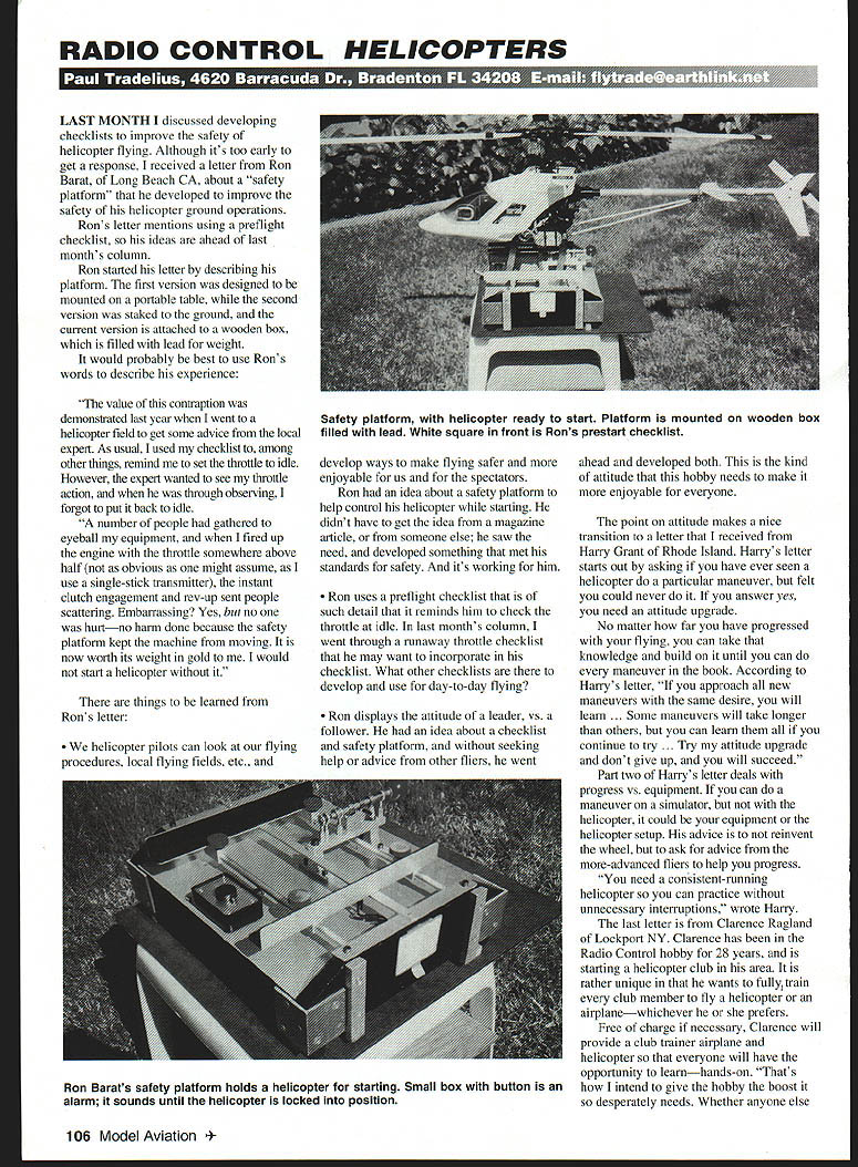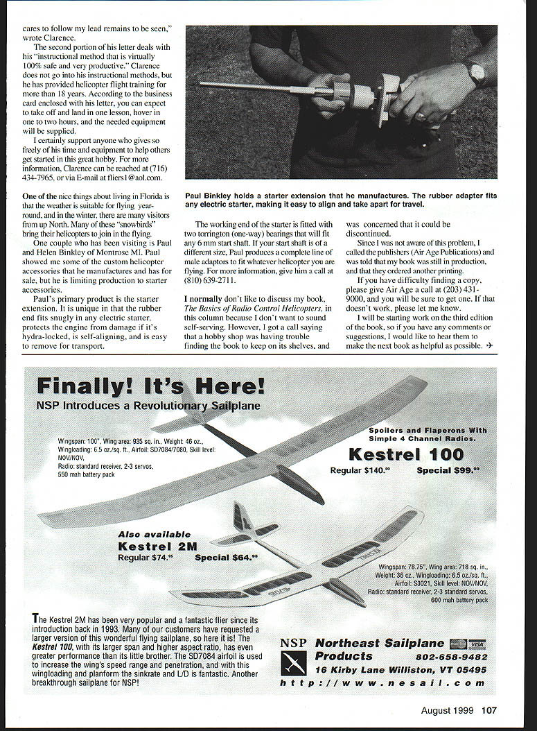 RADIO CONTROL HELICOPTERS LAST MONTH discussed developing checklists improve safety helicopter flying Although its too early get response received letter Ron Barat Long Beach CA about safety platform developed improve safety helicopter ground operations Rons letter mentions using preflight checklist ideas ahead last months column Ron started letter describing platform first version designed mounted portable table second version staked ground current version attached wooden box filled lead weight would probably best use Rons words describe experience value contraption demonstrated last year went helicopter field get some advice local expert As usual used checklist among other things remind set throttle idle However expert wanted see throttle action through observing forgot put back idle number people gathered eyeball equipment fired up engine throttle somewhere above half obvious might assume use single-stick transmitter instant clutch engagement rev-up sent people scattering Embarrassing Yes no hurtno harm done because safety platform kept machine moving now worth its weight gold would start helicopter things learned Rons letter helicopter pilots can look flying procedures local flying fields etc develop ways make flying safer enjoyable us spectators Ron idea about safety platform help control helicopter starting didnt have get idea magazine article someone else saw need developed something met standards safety its working him Ron uses preflight checklist such detail reminds him check throttle idle last months column went through runaway throttle checklist may want incorporate checklist What other checklists develop use day-to-day flying Ron displays attitude leader vs follower idea about checklist safety platform seeking help advice other fliers went ahead developed both kind attitude hobby needs make enjoyable everyone point attitude makes nice transition letter received Harry Grant Rhode Island Harrys letter starts out asking have ever seen helicopter particular maneuver felt could never answer yes need attitude upgrade No matter far have progressed flying can take knowledge build until can maneuver book According Harrys letter approach new maneuvers same desire will learn . Some maneuvers will take longer others can learn continue try . Try attitude upgrade dont give up will succeed Part two Harrys letter deals progress vs equipment can maneuver simulator helicopter could equipment helicopter setup advice reinvent wheel ask advice more-advanced fliers help progress need consistent-running helicopter can practice unnecessary interruptions wrote Harry last letter Clarence Ragland Lockport NY Clarence has Radio Control hobby 28 years starting helicopter club area rather unique wants fully1 train club member fly helicopter airplanewhichever prefers Free charge necessary Clarence will provide club trainer airplane helicopter everyone will have opportunity learnhands-on Thats intend give hobby boost desperately needs Whether anyone else 106 Model Aviation ty platform helicopter ready start Platform mounted wooden box filled lead White square front Rons prestart checklist Ron Barats safety platform holds helicopter starting Small box button alarm sounds until helicopter locked position cares follow lead remains seen wrote Clarence second portion letter deals instructional method virtually 100% safe very productive Clarence does go instructional methods has provided helicopter flight training 18 years According business card enclosed letter can expect take off land lesson hover two hours needed equipment will supplied certainly support anyone gives freely time equipment help others get started great hobby information Clarence can reached 716 434-7965 via E-mail fliersl @aolcom nice things about living Florida weather suitable flying yearround winter visitors up North snowbirds bring helicopters join flying couple has visiting Paul Helen Binkley Montrose MI Paul showed some custom helicopter accessories manufactures has sale limiting production starter accessories Pauls primary product starter extension unique rubber end fits snugly electric starter protects engine damage its hydra-locked self-aligning easy remove transport working end starter fitted two torrington one-way bearings will fit 6 mm start shaft start shaft different size Paul produces complete line male adaptors fit whatever helicopter flying information give him call 810 639-2711 normally dont like discuss book Basics Radio Control Helicopters column because dont want sound self-serving However got call saying hobby shop having trouble finding book keep its shelves concerned could discontinued Since aware problem called publishers Air Age Publications told book still production ordered another printing have difficulty finding copy please give Air Age call 203 4319000 will sure get doesnt work please let know will starting work third edition book have comments suggestions would like hear make next book helpful possible st 1999 107 Paul Binkley holds starter extension manufactures rubber adapter fits electric starter making easy align take apart travel Also available Kos Regula Kestrel 2M has very popular introduction back 1993 customers nave requested larger version wonderful flying sailplane Kestrel 100 its larger span higher aspect ratio has NSP Northeast Sailplane ter performance its little brother SD7084 airfoil used Products 802-658-9482 increase wings speed range penetration wingloading planform sinkrate L/D fantastic Another16 Kirby Lane Williston VT 05495 breahroughsailplaneforNSPlhttp//wwwnesailcom