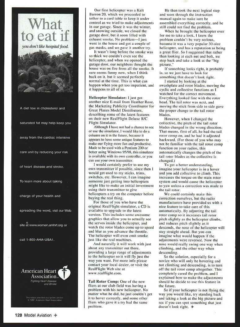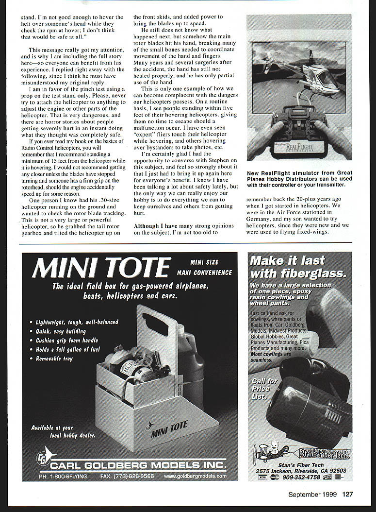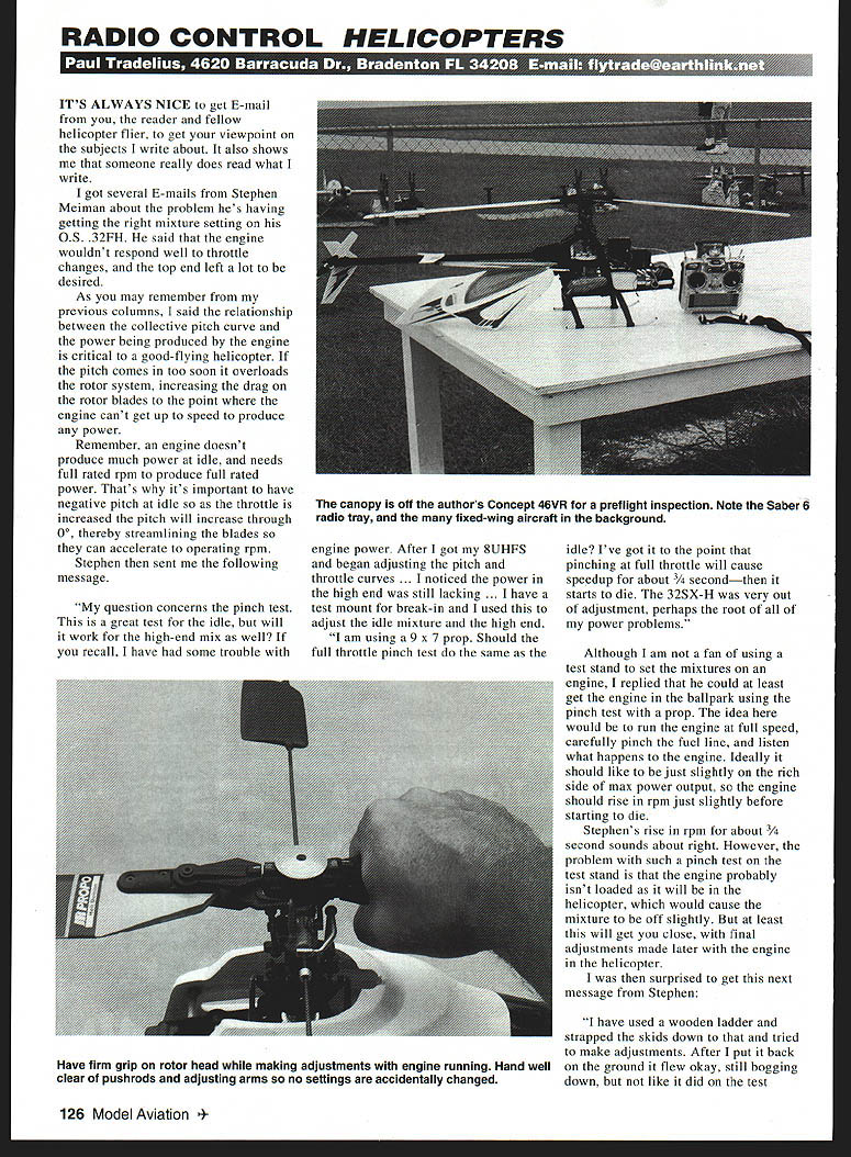 RADIO CONTROL HELICOPTERS S- . m- . ITS ALWAYS NICE get E-mail reader fellow helicopter flier get viewpoint subjects write about also shows someone really does read what write got several E-mails Stephen Meiman about problem hes having getting right mixture setting 0S 32FH said engine wouldnt respond well throttle changes top end left lot desired As may remember previous columns said relationship between collective pitch curve power being produced engine critical good-flying helicopter pitch comes too soon overloads rotor system increasing drag rotor blades point engine cant get up speed produce power Remember engine doesnt produce much power idle needs full rated rpm produce full rated power Thats its important have negative pitch idle throttle increased pitch will increase through 00 thereby streamlining blades can accelerate operating rpm Stephen sent following message question concerns pinch test great test idle will work high-end mix well recall have some trouble engine power After got 8UHFS began adjusting pitch throttle curves . noticed power high end still lacking . have test mount break-in used adjust idle mixture high end am using 9 x 7 prop Should full throttle pinch test same idle Ive got point pinching full throttle will cause speedup about 1 secondthen starts die 325X-H very out adjustment perhaps root of power problems Although am fan using test stand set mixtures engine replied could least get engine ballpark using pinch test prop idea would run engine full speed carefully pinch fuel line listen what happens engine Ideally should like just slightly rich side max power output engine should rise rpm just slightly before starting die Stephens rise rpm about 3/4 second sounds about right However problem such pinch test test stand engine probably isnt loaded will helicopter would cause mixture off slightly least will get close final adjustments made later engine helicopter surprised get next message Stephen have used wooden ladder strapped skids down tried make adjustments After put back ground flew okay still bogging down like did test 126 Model Aviation py off authors Concept 46VR preflight inspection Note Saber 6 radio tray fixed-wing aircraft background Have firm grip rotor head making adjustments engine running Hand well clear pushrods adjusting arms no settings accidentally changed stand Im good enough hover heli over someones head check rpm hover dont think would safe message really got attention am including full story hereso everyone can benefit experience replied right away following since think must have misunderstood original reply am favor pinch test using prop test stand Please never try attach helicopter anything adjust engine other parts helicopter very dangerous horror stories about people getting severely hurt instant doing what thought completely safe ever read book basics Radio Control helicopters will remember recommend standing minimum 15 feet helicopter hovering would recommend getting closer unless blades have stopped turning someone has firm grip rotorhead should engine accidentally speed up some reason person know 30-size helicopter running ground wanted check rotor blade tracking very large powerful helicopter grabbed tail rotor gearbox tilted helicopter up front skids added power bring blades up speed still does know what happened next somehow main rotor blades hit hand breaking small bones needed coordinate movement hand fingers years several surgeries after accident hand has still healed properly has partial use hand example can become complacent dangers helicopters possess routine basis see people standing within five feet hovering helicopters giving no time escape should malfunction occur have seen expert fliers touch helicopter hovering others hovering over bystanders take photos etc Im certainly glad opportunity converse Stephen subject feel strongly about just bring up again everyones benefit know have talking lot about safety lately way can really enjoy hobby everything can keep ourselves others getting hurt Although have strong opinions subject Im too old remember back 20-plus years ago got started helicopters Air Force stationed Germany son wanted try helicopters since new used flying fixed-wings September 1999 127 New RealFlight simulator Great Planes Hobby Distributors can used controller transmitter first helicopter Kalt Barron 20 proceeded tether card table keep under control tried make adjustments garage Since winter snowing outside closed garage door soon filled exhaust smoke No problemI just went house got couple gas masks gave another try wasnt long before smoke thick couldnt see helicopter opened garage door neighbors thought house fire smoke sure seems funny now think back it seemed perfectly normal time what can happen get too impatient happens us Helicopter Simulator just got another nice E-mail Heather Rose Marketing Publicity Coordinator Great Planes Model Distributors describing some latest features new RealFlight Deluxe RIC Flight Simulator Although have chance see use simulator would like column future because appears have some unique features make flying fun productive Made used Pentium 200 better using Windows 95/98 simulator available its own controller can use own transmitter would certainly prefer use own transmitter possible since would get used sticks trims switches etc However can imagine someone just getting helicopters might like make initial investment using transmitter give helicopters try computer before buying real thing have original RealFlight simulator CD available upgrade latest version includes some awesome graphics allow actually see servos inside helicopter watch rotor blades come up speed blur advance throttle helicopter will emit smoke just like real machines naturally will work just about transmitter out providing large range adjustments helicopter will fly just way want info please contact local dealer visit RealFlight Web site wwwrealflightcom Tail Rotor Comp new fliers club field having problem n