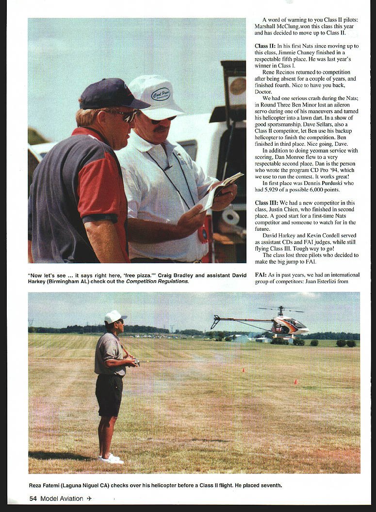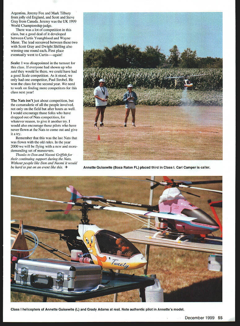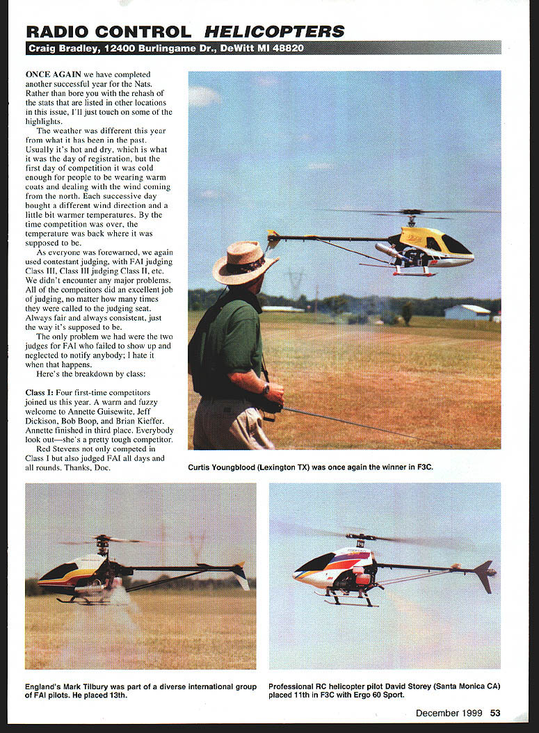 RADIO CONTROL HELICOPTERS gg-SI-8 ONCE AGAIN have completed another successful year Nats Rather bore rehash stats listed other locations issue Ill just touch some highlights weather different year what has past Usually its hot dry what day registration first day competition cold enough people wearing warm coats dealing wind coming north successive day bought different wind direction little bit warmer temperatures time competition over temperature back supposed As everyone forewarned again used contestant judging FAJ judging Class III Class III judging Class II etc didnt encounter major problems competitors did excellent job judging no matter times called judging seat Always fair always consistent just way its supposed problem two judges FAI failed show up neglected notify anybody hate happens Heres breakdown class Class Four first-time competitors joined us year warm fuzzy welcome Annette Guisewite Jeff Dickison Bob Boop Brian Kieffer Annette finished third place Everybody look outshes pretty tough competitor Red Stevens competed Class also judged FAI days rounds Thanks Doc December1999 53 Curtis Youngblood Lexington TX once again winner F3C Englands Mark Tilbury part diverse international groupProfessional RC helicopter pilot David Storey Santa Monica CA FAI pilots placed 13thplaced 11th F3C Ergo 60 Sport word warning Class II pilots Marshall McClungwon class year has decided move up Class II Class II first Nats since moving up class Jimmie Chaney finished respectable fifth place last years winner Class Rene Recinos returned competition after being absent couple years finished fourth Nice have back Doctor serious crash during Nats Round Three Ben Minor lost aileron servo during maneuvers turned helicopter lawn dart show good sportsmanship Dave Sellars also Class II competitor let Ben use backup helicopter finish competition Ben finished third place Nice going Dave addition doing yeoman service scoring Dan Monroe flew very respectable second place Dan person wrote program CD Pro 94 use run contest works great first place Dennis Purduski 5929 possible 6000 points Class III new competitor class Justin Chien finished second place good start first-time Nats competitor someone watch future David Harkey Kevin Cordell served assistant CDs FAL judges still flying Class III Tough way go class lost three pilots decided make big jump FAI FAI As past years international group competitors Juan Esterlizi 54 Model Aviation lets see . says right free pizza Craig Bradley assistant David Harkey Birmingham AL check out Competition Regulations Reza Fatemi Laguna Niguel CA checks over helicopter before Class II flight placed seventh Argentina Jeremy Fox Mark Tilbury jolly old England Scott Steve Gray Canada Jeremy UK 1999 World Championship judge lot competition class hut good deal developed between Curtis Youngblood Wayne Mann lead seesawed between two Scott Gray Dwight Shilling also winning round First place eventually went Curtis-again Scale disappointed turnout class everyone shown up said would could have good Scale competition As stood competitor Paul Strobel won class second year need work finding competitors class next year Nats isnt just about competition camaraderie people involved field after hours well would encourage folks have dropped out Nats competition whatever reason give another try would also encourage pilots have never flown Nats come out give try Remember last Nats flown old rules year 2000 will flying new moredemanding set maneuvers Thanks Don Naomi Griffith continuing support during Nats Without people like Don Naomi would hard put event like mber1999 55 Annette Guisewite Boca Raton FL placed third Class Carl Camper caller Class helicopters Annette Guisewite L Grady Adams rest Note authentic pilot Annettes model