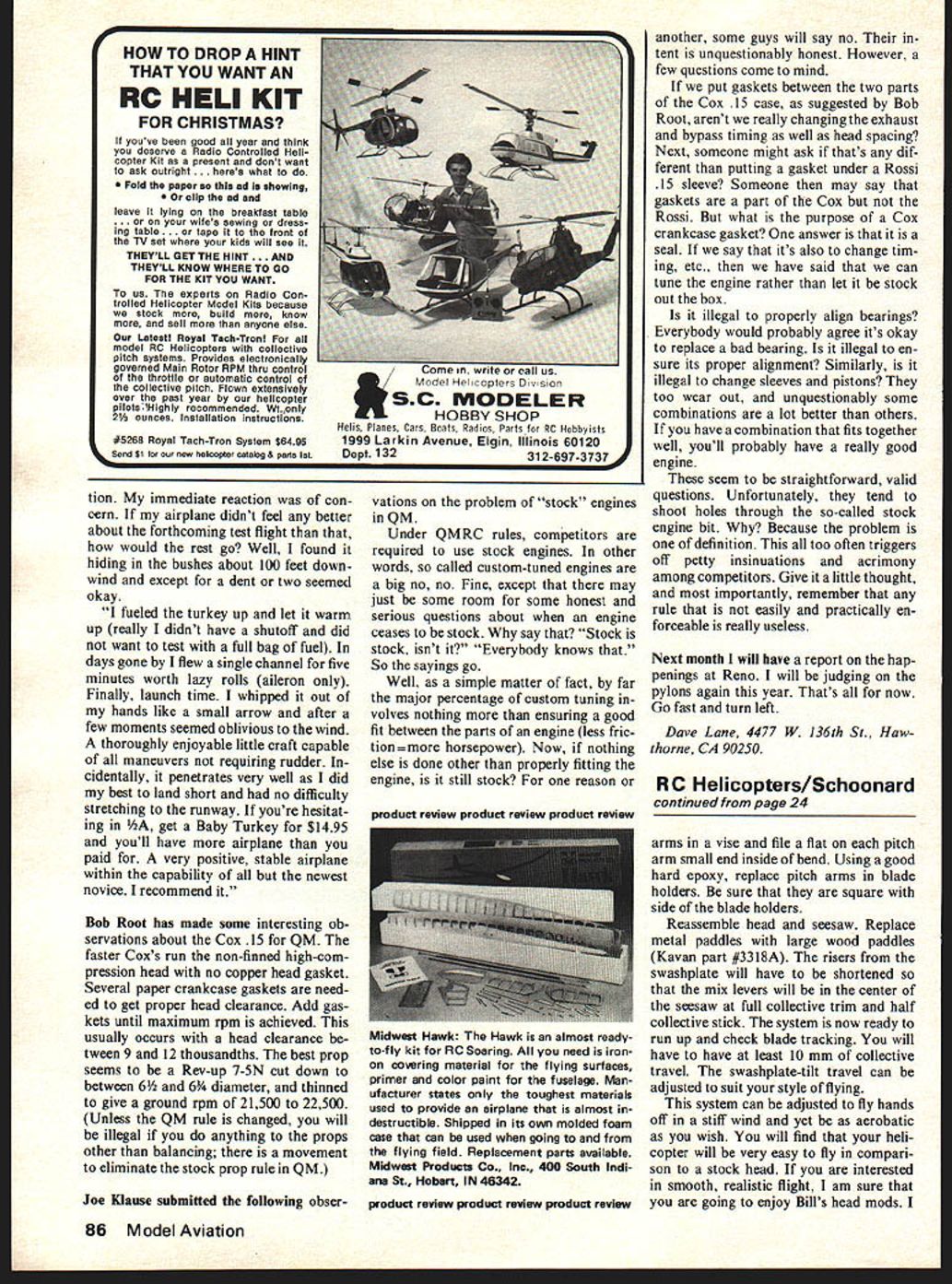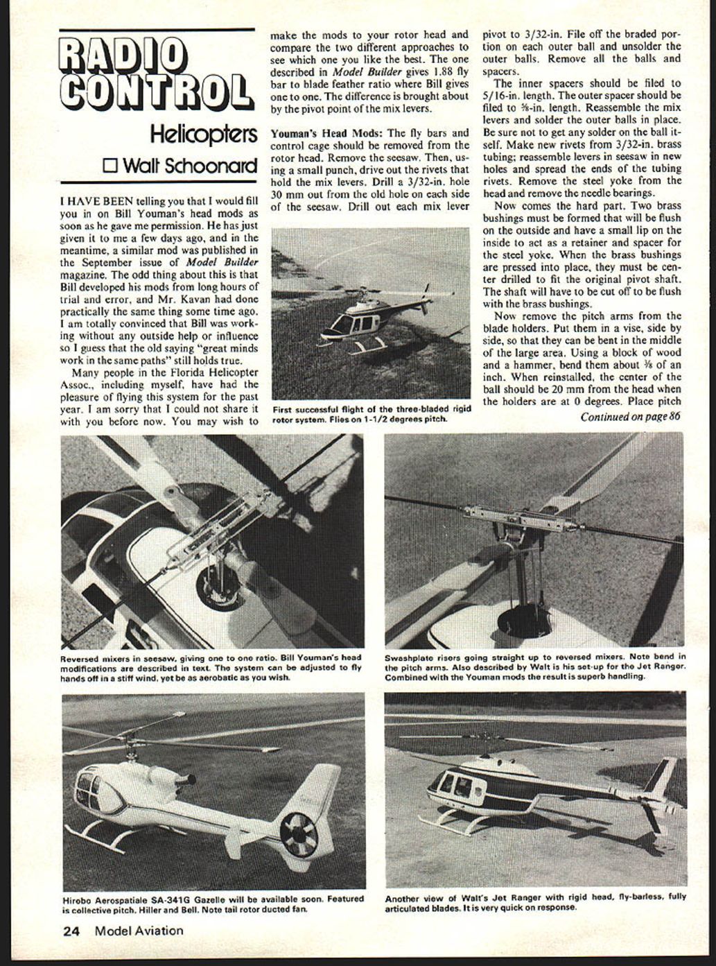 3 Helicopters El Wall Schoonard HAVE BEEN telling would fill Bill Youmans head mods soon gave permission has just given few days ago meantime similar mod published September issue Model Builder magazine odd thing about Bill developed mods long hours trial error Mr Kavan done practically same thing some time ago am totally convinced Bill work ing outside help influence guess old saying great minds work same paths still holds true people Florida Helicopter Assoc including myself have pleasure flying system past year am sorry could share before now may wish make mods rotor head compare two different approaches see like best described Model Builder gives 188 fly bar blade feather ratio Bill gives difference brought about pivot point mix levers Voumans Head Mods fly bars control cage should removed rotor head Remove seesaw us ing small punch drive out rivets hold mix levers Drill 3/32-in hole 30 mm out old hole side seesaw Drill out mix lever pivot 3/32-in File off braded por tion outer ball unsolder outer balls Remove balls spacers inner spacers should filed 5/16-in length outer spacer should filed Yi-in length Reassemble mix levers solder outer balls place sure get solder ball self Make new rivets 3/32-in brass tubing reassemble levers seesaw new holes spread ends tubing rivets Remove steel yoke head remove needle bearings Now comes hard part Two brass bushings must formed will flush outside have small lip inside act retainer spacer steel yoke brass bushings pressed place must cen ter drilled fit original pivot shaft shaft will have cut off flush brass bushings Now remove pitch arms blade holders Put vise side side can bent middle large area Using block wood hammer bend about reinstalled center ball should 20 mm head holders 0 degrees Place pitch Continued page 86 24 Model Aviation First successful flight three-bladed rigid rotor system Flies 11/2 degrees pitch Reversed mixers seesaw giving ratio Bill Youmans head modifications described text system can adjusted fly hands off stiff wind yet aerobatic wish Swashplate risers going straight up reversed mixers Note bend pitch arms Also described Walt set-up Jet Ranger Combined Vouman mods result superb handling Hirobo Aerospatlale SA-i4U Gazelle will available soon Featured collective pitch Hiller Bell Note tail rotor ducted fan Another view Walts Jet Ranger rigid head fly-barless fully articulated blades very quick response tion immediate reaction con cern airplane didnt feel better about forthcoming test flight would rest go Well found hiding bushes about 100 feet down wind except dent two seemed okay fueled turkey up let warmi up really didnt have shutoff did want test full bag fuel days gone flew single channel five minutes worth lazy rolls aileron Finally launch time whipped out hands like small arrow after few moments seemed oblivious wind thoroughly enjoyable little craft capable maneuvers requiring rudder cidentally penetrates very well did best land short no difficulty stretching runway youre hesitat ing get Baby Turkey $1495 youll have airplane paid very positive stable airplane within capability newest novice recommend Bob Root has made some interesting ob servations about Cox 15 QM faster Coxs run non-finned high-com pression head no copper head gasket Several paper crankcase gaskets need ed get proper head clearance Add gas kets until maximum rpm achieved usually occurs head clearance tween 9 12 thousandths best prop seems Rev-up 7-SN cut down between 6 6 diameter thinned give ground rpm 21500 22500 Unless QM rule changed will illegal anything props other balancing movement eliminate stock prop rule QM Joe Klause submitted following obser vations problem stock engines QM Under QMRC rules competitors required use stock engines other words called custom-tuned engines big no no Fine except may just some room some honest serious questions about engine ceases stock say Stock stock isnt Everybody knows So sayings go Well simple matter fact far major percentage custom tuning volves nothing ensuring good fit between parts engine less fric tionmore horsepower Now nothing else done other properly fitting engine still stock reason product review product review product review another some guys will say no tent unquestionably honest However few questions come mind put gaskets between two parts Cox 15 case suggested Bob Root arent really changing exhaust bypass timing well head spacing Next someone might ask thats dif ferent putting gasket under Rossi 15 sleeve Someone may say gaskets part Cox Rossi what purpose Cox crankcase gasket answer seal say its also change tim ing etc have said can tune engine rather let stock out box illegal properly align bearings Everybody would probably agree its okay replace bad bearing illegal en sure its proper alignment Similarly illegal change sleeves pistons too wear out unquestionably some combinations lot better others have combination fits together well youll probably have really good engine seem straightforward valid questions Unfortunately tend shoot holes through so-called stock engine bit Because problem definition too often triggers off petty insinuations acrimony among competitors Give little thought importantly remember rule easily practically en forceable really useless Next month will have report hap penings Reno will judging pylons again year Thats now Go fast turn left Dave Lane 4477 W 136th St Haw thorne CA 90250 RC Helicopters/Schoonard continued page 24 arms vise file flat pitch arm small end inside bend Using good hard epoxy replace pitch arms blade holders sure square side blade holders Reassemble head seesaw Replace metal paddles large wood paddles Kavan part #3318A risers swashplate will have shortened mix levers will center seesaw full collective trim half collective stick system now ready run up check blade tracking will have have least 10 mm collective travel swashplate-tilt travel can adjusted suit style flying system can adjusted fly hands off stiff wind yet acrobatic wish will find he
