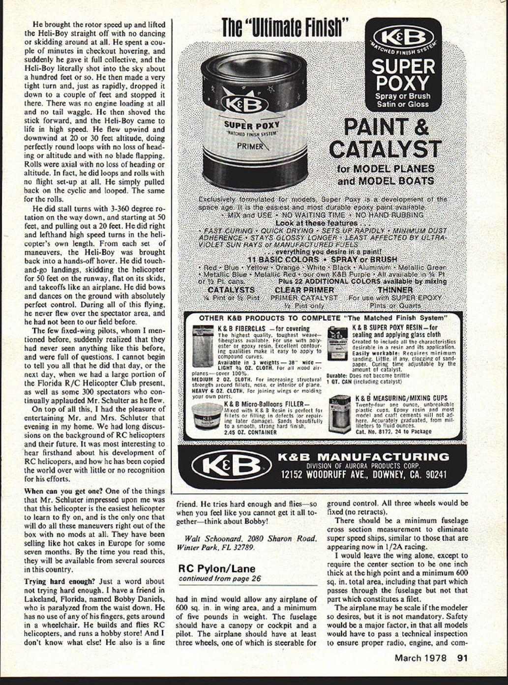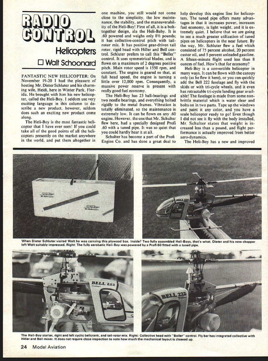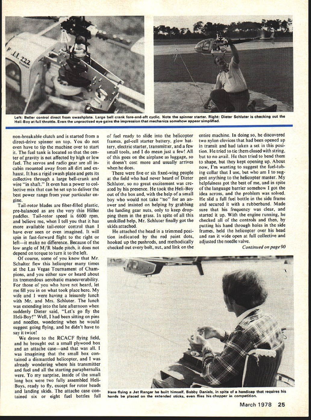 S Helicopters El Walt Schoonard FANTASTIC NEW HELICOPTER November 19-20 pleasure hosting Mr Dieter Schluter charm ing wife Heidi Winter Park Flor ida brought him new helicop ter called Heli-Boy seldom use very exciting language column de scribe new product however seldom does such exciting new product come along Heli-Boy fantastic heli copter have ever seen could take good points heli copters presently market anywhere world put altogether machine still would come close simplicity low mainte nance stability maneuverabil ity Heli-Boy First bolttogether design ala Heli-Baby 60 powered weighs 8 pounds has collective-control pitch tailrotor mix has positive gear-driven tail rotor rigid head Hiller Bell con trol Schluter prefers call Beller control uses symmetrical blades flown maximum 2 degrees positive pitch Main rotor speed 1550 rpm constant engine geared full head speed engine turning little over 12000 rpm Consequently massive power reserve present really good fuel economy Heli-Boy has 23 ball-bearings two needle bearings everything bolted rigidly metal frames Vibration totally eliminated maintenance extremely low can flown 60 engine However Mr Schulter flew specially designed Proti 60 tuned pipe quiet could hardly hear Schulter has become part Profi Engine Co has done great deal help develop engine line helicop ters tuned pipe offers advan tages increases power increases fuel economy light weight ex tremely quiet believe going see much greater utilization tuned pipes helicopters near future way Mr Schluter flew fuel consisted 75 percent alcohol 20 percent castor oil 5 percent unleaded gasoline fifteen-minute flight used less 8 ounces fuel Hows economy Heli-Boy convertible helicopter ways can flown canopy flew can quickly add Bell 222 fuselage fly skids tn-cycle wheels has retractable tn-cycle landing gear avail able fuselage made some nonbrittle material water clear bolts two parts Tape up windows paint color have scale helicopter ready go though did see fly body installed Mr Schulter states weight creased less pound flight per formance actually improved better aero-dynamics Heli-Boy has new improved vvnen uieier cniuter visited vvait ne carrying mis piyw~o box inside iwo tully assembled ileli-Udys thats what Uieter new chopper left Walt suitably impressed Right fully aerobatic Hell-Boy powered Profi 60 fitted tuned pipe Hell-Boy starter right left cyclic belicrank tail-rotor mix Right Collective head Beller control Fly bar has integrated collective Hiller Bell mixer does require close inspection note much mechanical layout cleaned up 24 Model Aviation Left Belier control direct swashplate Large bell crank fore-and-aft cyclic Note spinner starter Right Dieter Schluter checking Out Heli-Boy full throttle unpracticed eye gains impression mechanics somehow appear simplified non-breakable clutch started direct-drive spinner top have tip machine over start fuel tank located cen ter gravity affected high low fuel servos radio gear incabin mounted away dirt ex haust has rigid swash plate gets its collective through large bell-crank wire shaft has power col lective mix can set up deliver best power range particular en gine Tail-rotor blades fiber-filled plastic pre-balanced very thin Hiller paddles Tail-rotor speed 6600 rpm believe tell has available tail-rotor control have ever seen imagined will spin fast-forward flight right leftit make no difference Because low angle M/R blade pitch does depend torque turn left course some know Mr Schulter flew helicopter times Las Vegas Tournament Cham pions either saw heard about its tremendous aerobatic maneuverability have heard let fill what took place wife having leisurely lunch Mr Mrs Schluter lunch extending late afternoon suddenly Dieter said Lets go fly Heli-Boy Well sitting pins needles wondering would suggest going flying didnt have say twice drove RCACF flying field brought out small plywood box attache caseand was imagining small box con tained dismantled helicopter already wondering transmitter fuel starting paraphernalia surprise inside small long box two fully assembled Heli Boys ready fly except rotor heads landing skids attache case con tained six eight fuel bottles full fuel ready slide helicopter frames gel-cell starter battery glow bat tery electric starter transmitter few small tools mean just few goes airplane luggage doesnt cost usually arrives does five six fixed-wing people field never heard Dieter Schluter no great excitement cre ated presence took Heli-Boy out box help small boy would take no an swer insisted helping grabbing landing gear nuts keep drop ping grass spite unskilled help Mr Schluter finally got skids attached attached head trimmed posi tion indicated red paint dots hooked up pushrods methodically checked out bolt nut link entire machine doing discovered two nylon devices opened up transit taken set posi tion tried tie closed string no avail tried bend shape kept opening up About now Im wanting suggest fuel-tub ing collar use am sug gest anything helicopter master helpfulness got best spite language barrier somehow got idea across problem solved slid full fuel bottle side frame secured rubberband Made sure frequency clear started up engine running checked controls putting hand through holes side frames held helicopter over head ran wide open full collective adjusted needle valve Continued page 90 March1978 25 flying Jet Ranger built himself Bobby Daniels spite handicap requires hands placed extended sticks flias chopper competition NEW MUFF-L-IT SERIES Available B C engines Sin eight Ob reduction noise engines Proportional volumne espan sion chamber Large exhaust nozzle tor low back presaure Little no loss power 5030109-19$349 NO 302 29409439 NO 303 4980$944 unrbu 04 5 m 4 ngn. No344990915 tioNS NO305R525N0 51tN5 1103069445nO 51355 1/2A MUFFLER Fife COX 049 engInes NO 3040 049 5549 No 304B 451 5549 regard Denmark Norway Sweden scrapped F3B program last years contest calendar flew task own combined B C task B/C four-la