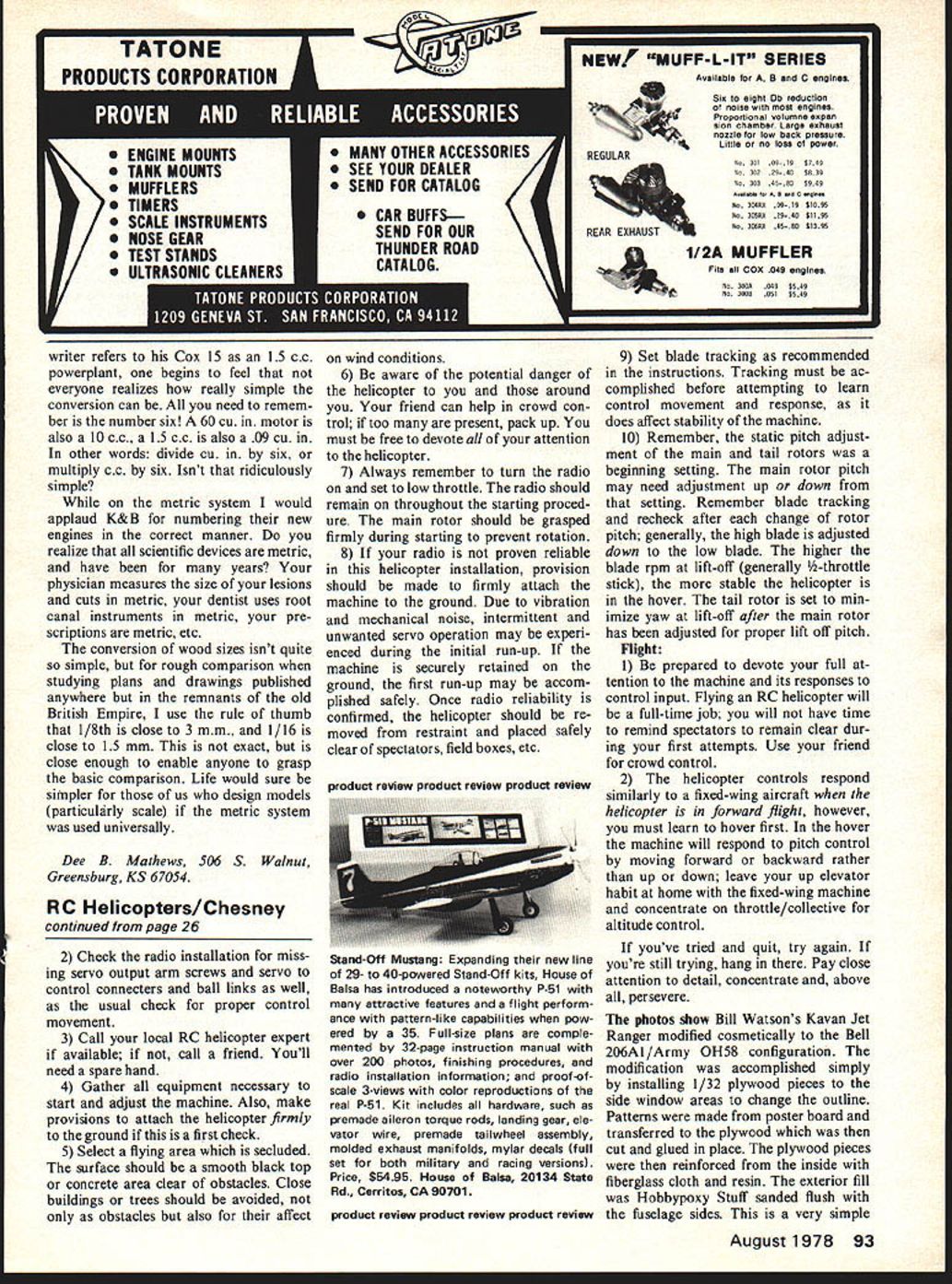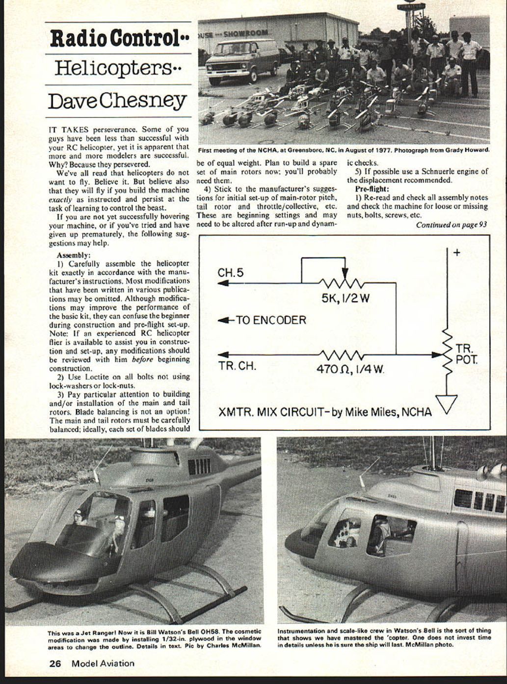 Radio Control Helicopters Dave Chesney IT TAKES perseverance Some guys have less successful RC helicopter yet apparent more modelers successful Because persevered Weve read helicopters want fly Believe believe also will fly build machine exactly instructed persist task learning control beast yet successfully hovering machine youve tried have given up prematurely following sug gestions may help Assembly 1 Carefully assemble helicopter kit exactly accordance manu facturers instructions Most modifications have written various publica tions may omitted Although modifica tions may improve performance basic kit can confuse beginner during construction pre-flight set-up Note If experienced RC helicopter flier available assist construc tion set-up modifications should reviewed him before beginning construction 2 Use Loctite bolts using lock-washers lock-nuts 3 Pay particular attention building and/or installation main tail rotors Blade balancing option main tail rotors must carefully balanced ideally set blades should equal weight Plan build spare set main rotors now youll probably need 4 Stick manufacturers sugges tions initial set-up main-rotor pitch tail rotor throttle/collective etc beginning settings may need altered after run-up dynam ic checks 5 If possible use Schnuerle engine displacement recommended Pre-flight 1 Re-read check assembly notes check machine loose missing nuts bolts screws etc Continued page 93 26 Model Aviation First meeting NCHA Greensboro NC August 1977 Photograph Grady Howard r77t~ AA 5K 1/2W -TO ENCODER A ATR POT TRCH470flI/4W XMTR MIX CIRCUIT-by Mike Miles NCHA Jet Ranger Now Bill Watsons Bell 0H58 cosmetic modification made installing 1/32-in plywood window areas change outline Details text Pic Charles McMillan Instrumentation scale-like crew Watsons Bell sort thing shows have mastered copter does invest time details unless sure ship will last McMillan photo writer refers Cox 15 15 cc powerplant begins feel everyone realizes really simple conversion can need remem ber number six 60 cu motor also 10 cc 15 cc also 09 cu other words divide cu six multiply cc six Isnt ridiculously simple metric system would applaud K&B numbering new engines correct manner realize scientific devices metric have years physician measures size lesions cuts metric dentist uses root canal instruments metric pre scriptions metric etc conversion wood sizes isnt quite simple rough comparison studying plans drawings published anywhere remnants old British Empire use rule thumb 1/8th close 3 mm 1/16 close 15 mm exact close enough enable anyone grasp basic comparison Life would sure simpler us design models particularly scale metric system used universally Dee B Mathews 506 S Walnut Greensburg KS 67054 RC Helicopters/Chesney continued page 26 2 Check radio installation miss ing servo output arm screws servo control connecters ball links well usual check proper control movement 3 Call local RC helicopter expert available call friend Youll need spare hand 4 Gather equipment necessary start adjust machine Also make provisions attach helicopter firmly ground first check 5 Select flying area secluded surface should smooth black top concrete area clear obstacles Close buildings trees should avoided obstacles also affect wind conditions 6 Be aware potential danger helicopter around friend can help crowd con trol too present pack up must free devote attention helicopter 7 Always remember turn radio set low throttle radio should remain throughout starting proced ure main rotor should grasped firmly during starting prevent rotation 8 If radio proven reliable helicopter installation provision should made firmly attach machine ground Due vibration mechanical noise intermittent unwanted servo operation may experi enced during initial run-up machine securely retained ground first run-up may accom plished safely Once radio reliability confirmed helicopter should re moved restraint placed safely clear spectators field boxes etc Stand-Off Mustang Expanding new line 29- 40-powered Stand-Off kits House Balsa has introduced noteworthy P-51 attractive features flight perform ance pattern-like capabilities pow ered 35 Full-size plans comple mented 32-page instruction manual over 200 photos finishing procedures radio installation information proof-ofscale 3-views color reproductions real P-51 Kit includes hardware such premade aileron torque rods landing gear ele vator wire premade tailwheel assembly molded exhaust manifolds mylar decals full set both military racing versions Price $5495 House Balsa 20134 State Rd Cerritos CA 90701 NEWf MUFF-L-IT SERIES Available B C engines Six eight Ob reduction noise engines Proportional volumne aspen sion chamber Large exhaust nozzle low back pressure Little no toss power No 3010919$749 No 3022940tO39 No 30345SO1949 o x , C gh.. No 304R4 04tN StONS No 30tRX 2940 ttl55 No 30645 xxxo 4t3x5 1/2A MUFFLER Fits alt COX 049 engInes No 3005049$5 49 No 3005057$5 SN 9 Set blade tracking recommended instructions Tracking must ac complished before attempting learn control movement response does affect stability machine 10 Remember static pitch adjust ment main tail rotors beginning setting main rotor pitch may need adjustment up down setting Remember blade tracking recheck after change rotor pitch generally high blade adjusted down low blade higher blade rpm lift-off generally -throttle stick stable helicopter hover tail rotor set min imize yaw lift-off after main rotor has adjusted proper lift off pitch Flight 1 Be prepared devote full tention machine its responses control input Flying RC helicopter will full-time job will have time remind spectators remain clear dur ing first attempts Use friend crowd control 2 The helicopter controls respond similarly fixed-wing aircraft helicopter forward flight however must learn hover first hover machine will respond pitch control moving forward backward rather up down leave up elevator habit home fixed-wing machine concentrate throttle/collective altitude